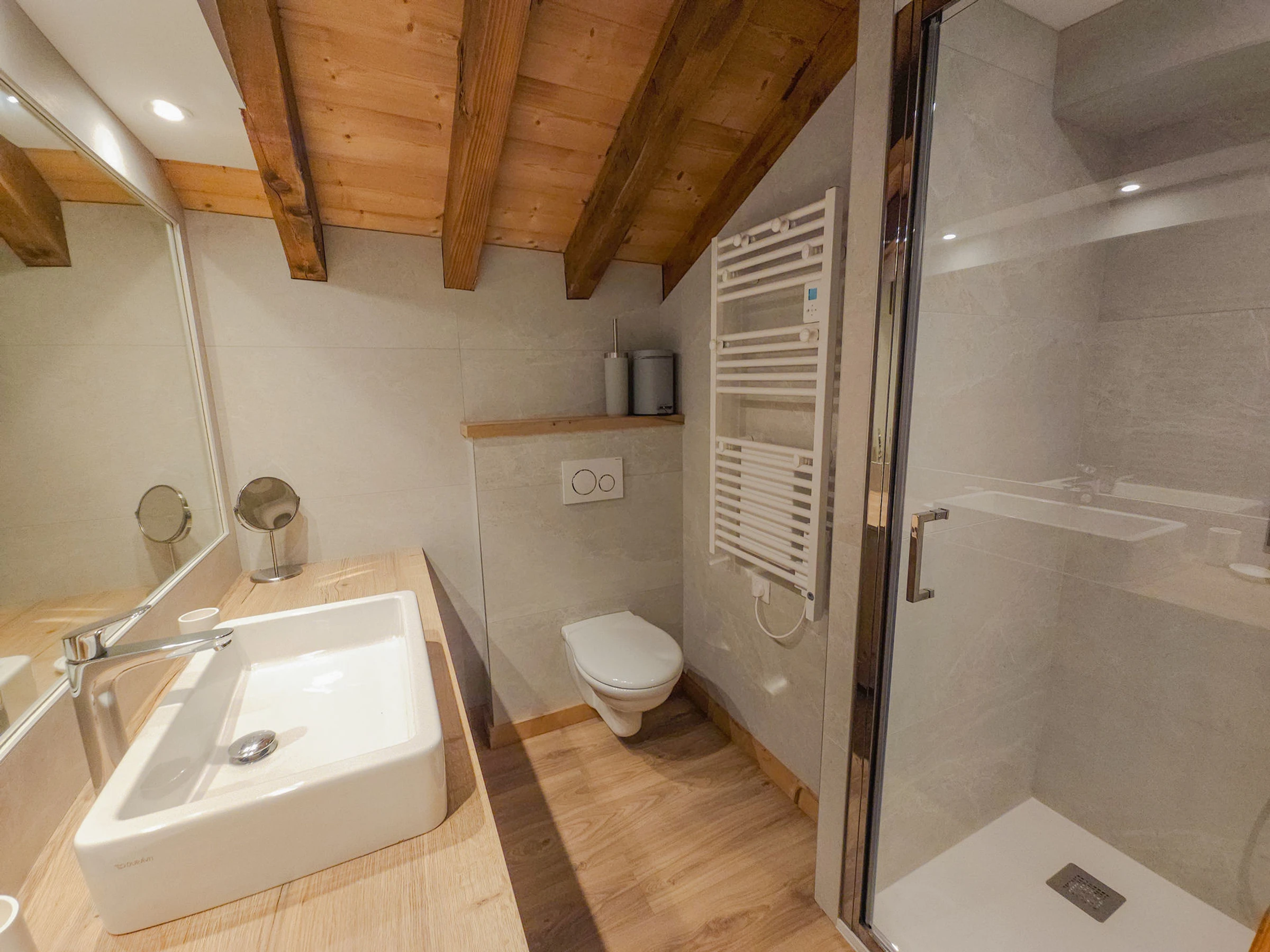 Cuarto de baño: lavabo, ducha, toallero eléctrico, inodoro.