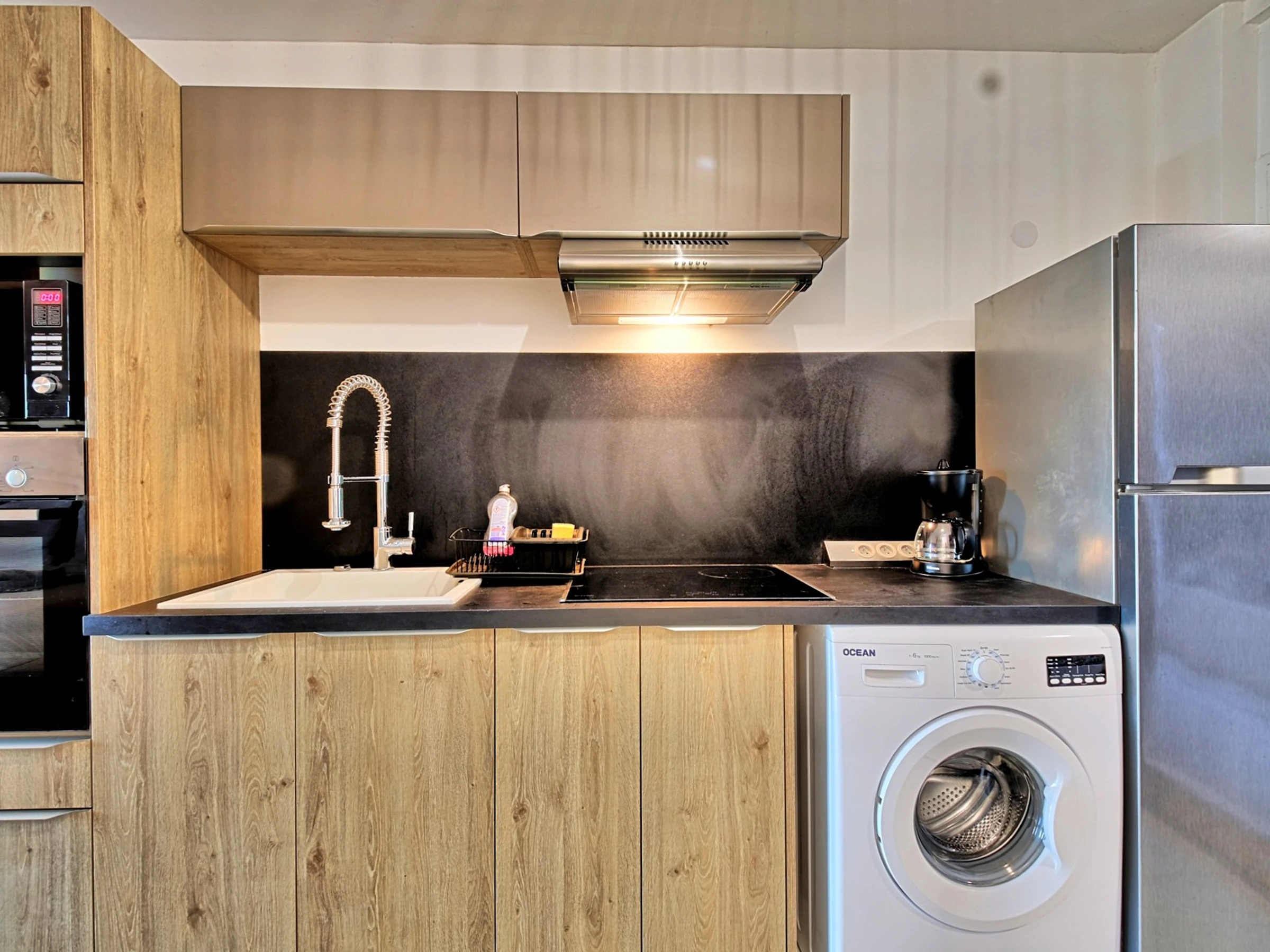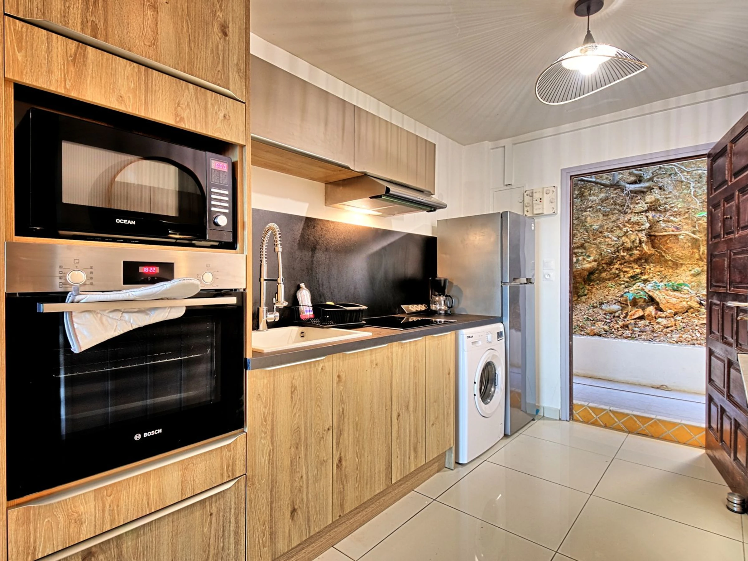 El salón, equipado con un sofá cama por si desea recibir invitados, está bañado de luz y da a una terraza cubierta que le invita a disfrutar de comidas al aire libre, arrullado por el suave murmullo de las olas. El aire acondicionado garantiza un clima ideal en todas las estaciones, mientras que el acceso a internet y la televisión contribuyen a su bienestar diario. Además, tiene a su disposición una lavadora, lo que añade un toque de practicidad a su estancia.