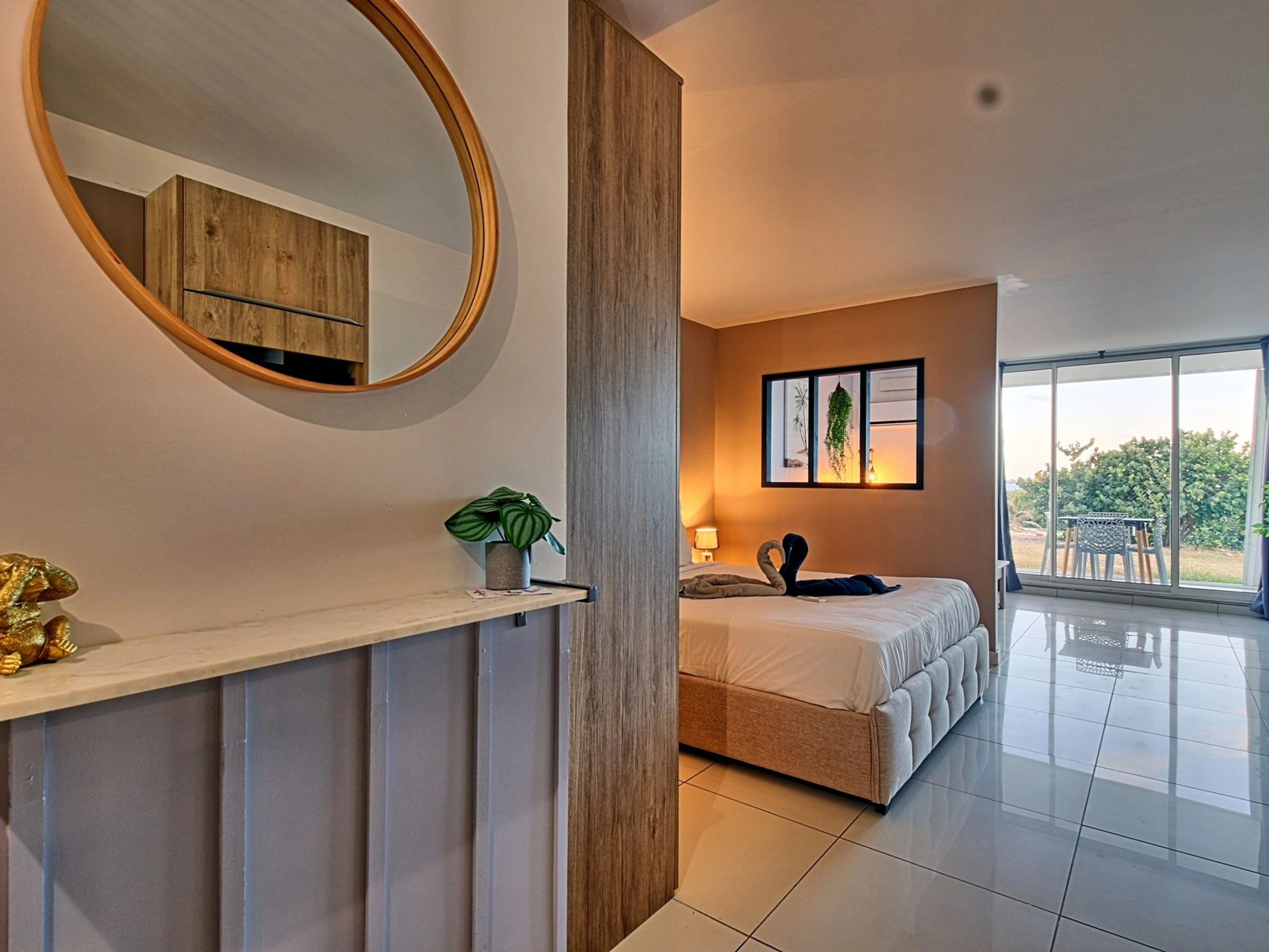 Desde su llegada, déjese cautivar por la majestuosa vista de Orient Bay y las cristalinas aguas del mar. El interior de este refugio es tan elegante como funcional. Una acogedora entrada le conduce a una cocina equipada, donde podrá dar rienda suelta a su talento culinario. El moderno baño con inodoro garantiza su comodidad, y una zona de dormitorio semicerrada, cuidadosamente amueblada con una lujosa cama king size y un vestidor, le garantiza noches de descanso reparador.