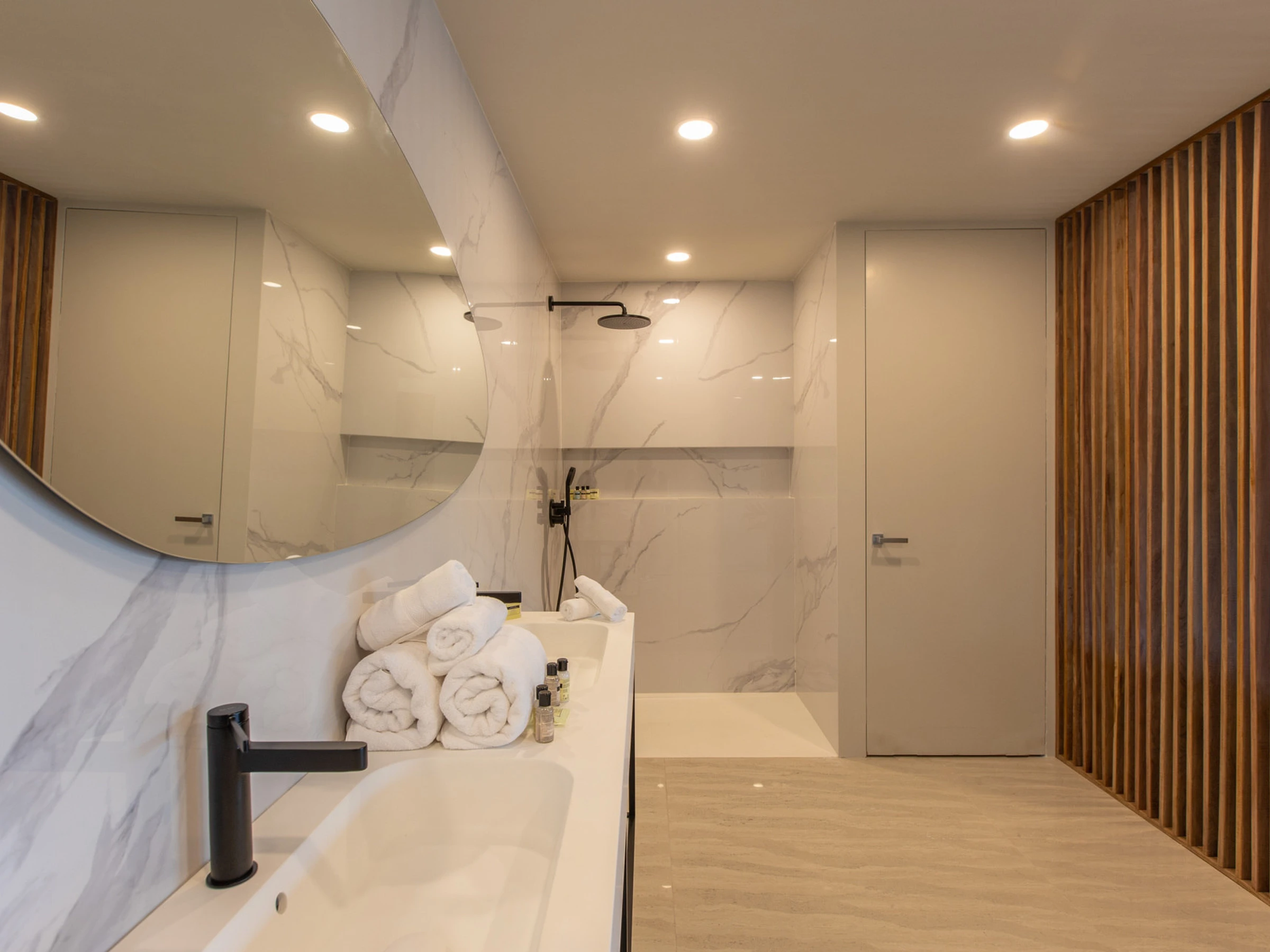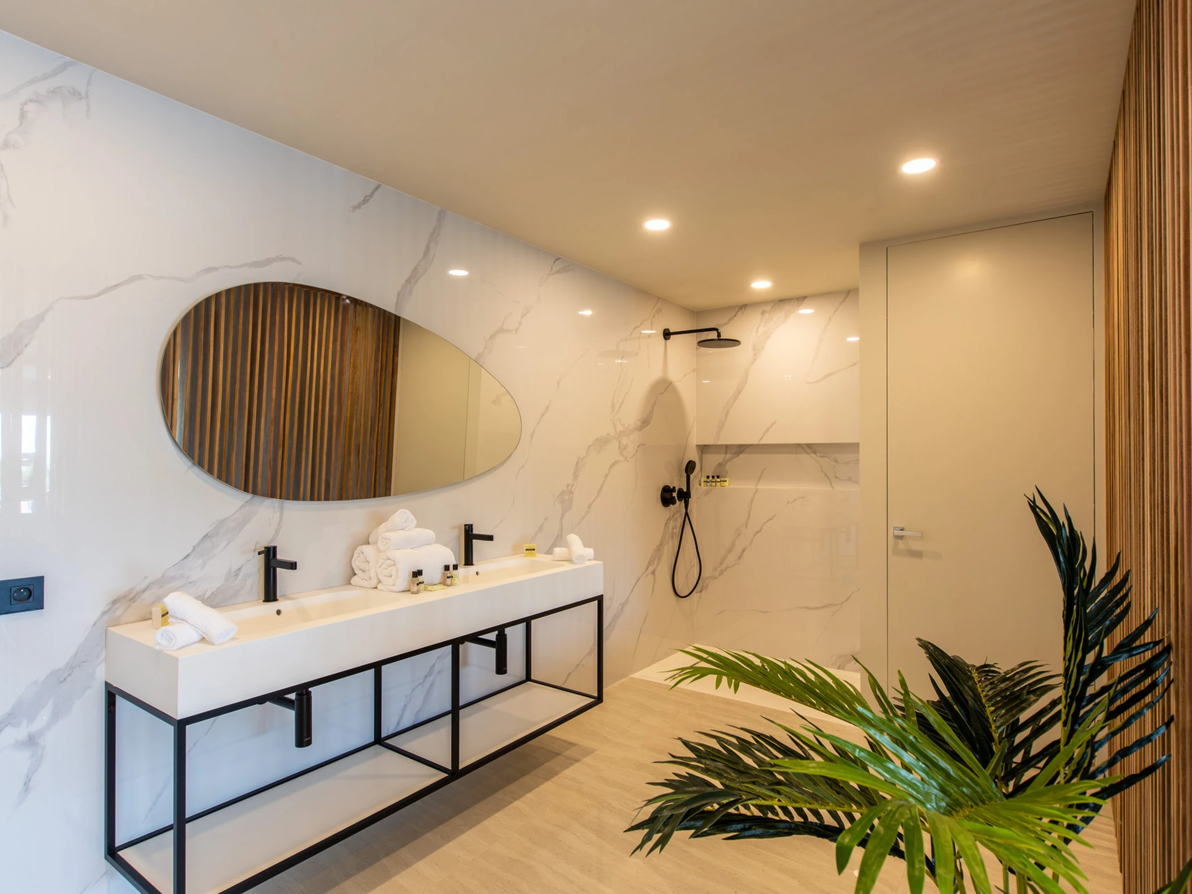 Continúe y encontrará el amplio dormitorio, equipado con TV, un amplio vestidor, una cama king size (200x200) y su propio baño. Déjese sorprender por el gran ventanal con vistas al magnífico paisaje azul que rodea Saint Martin.