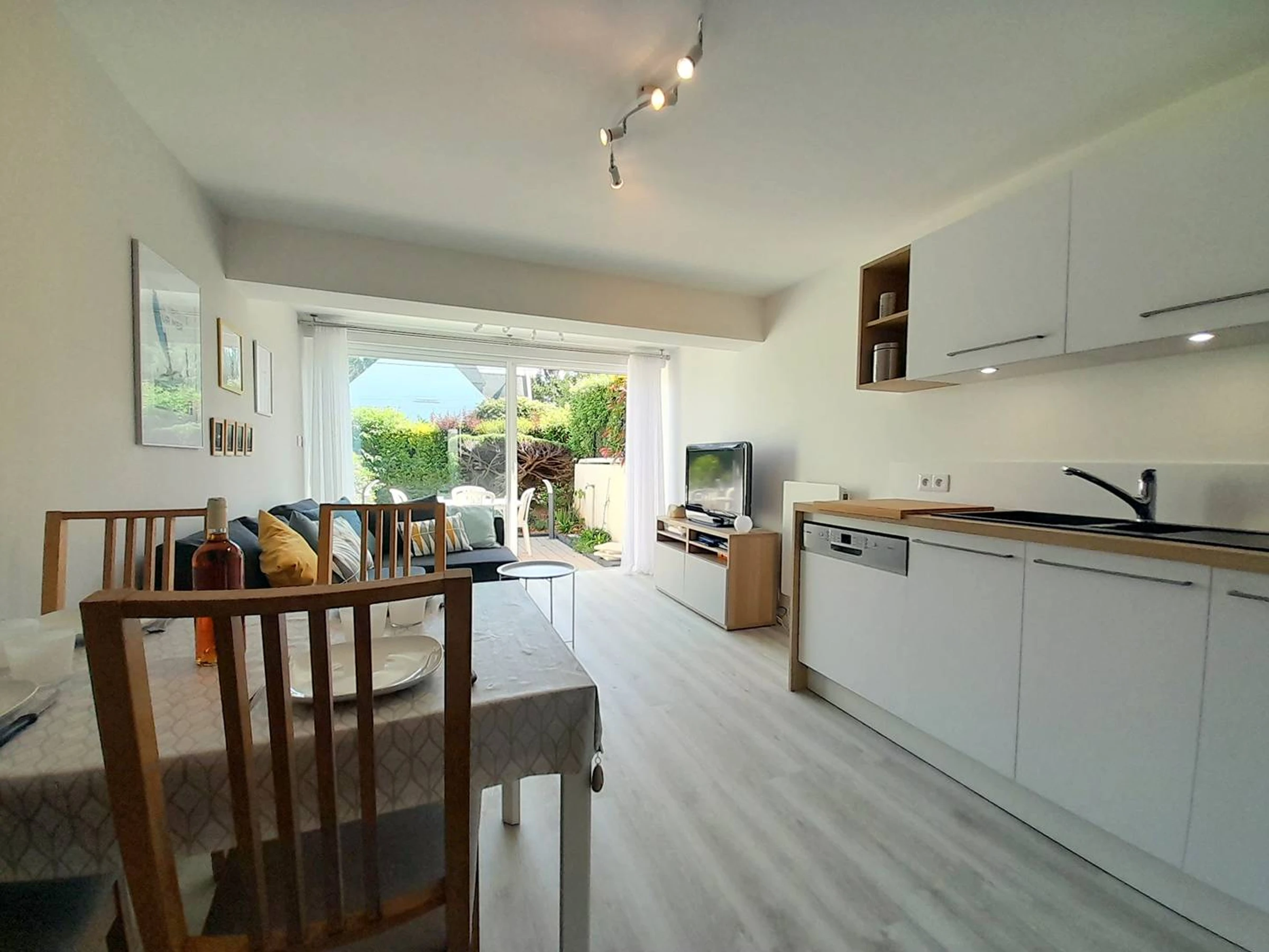 - Cocina americana equipada (frigorífico/congelador, vitrocerámica de 3 fuegos, microondas, horno).