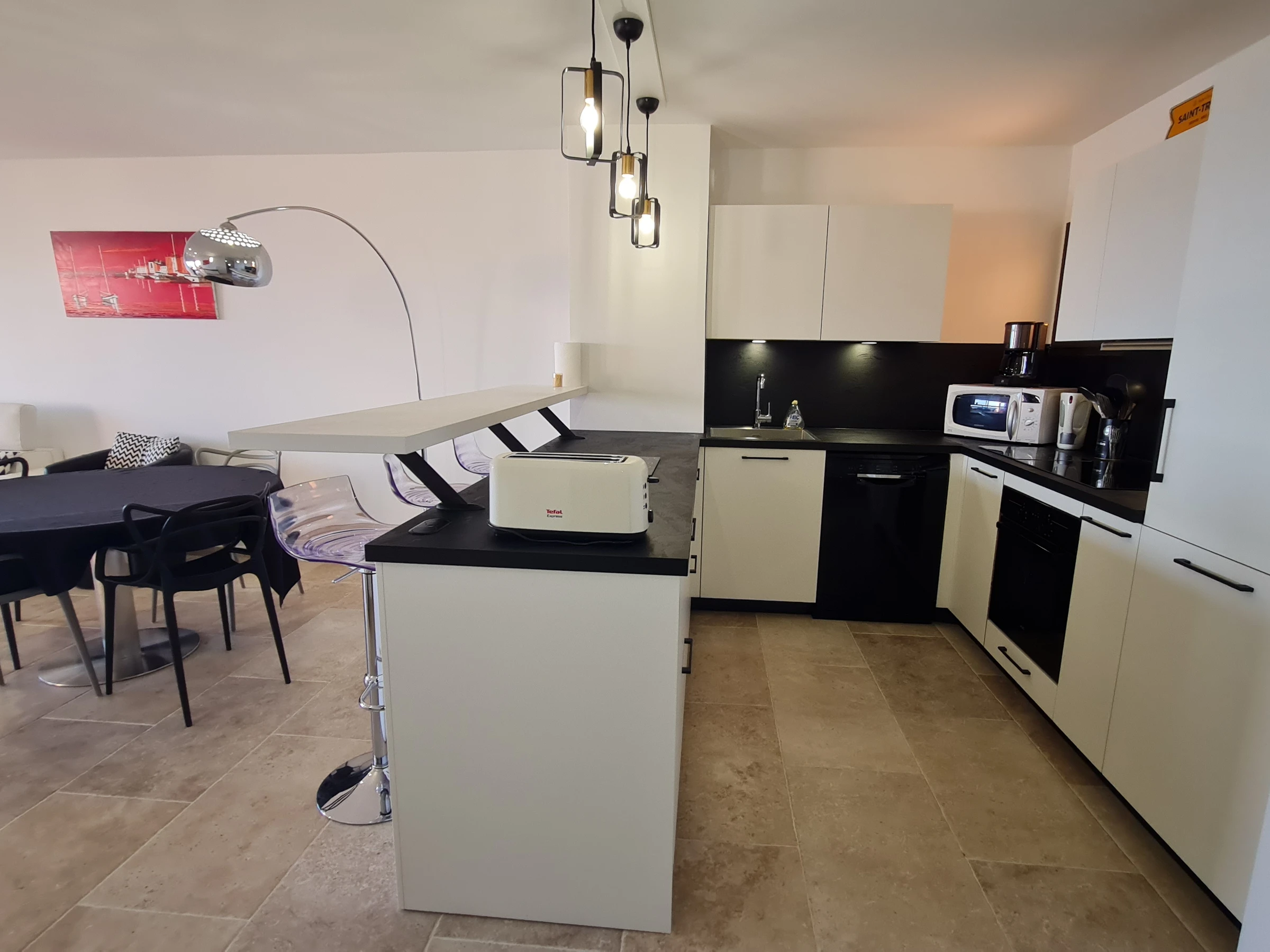 - Cocina americana totalmente equipada (vitrocerámica de 4 fuegos, horno, campana extractora, frigorífico-congelador, lavavajillas, microondas, cafetera de filtro).