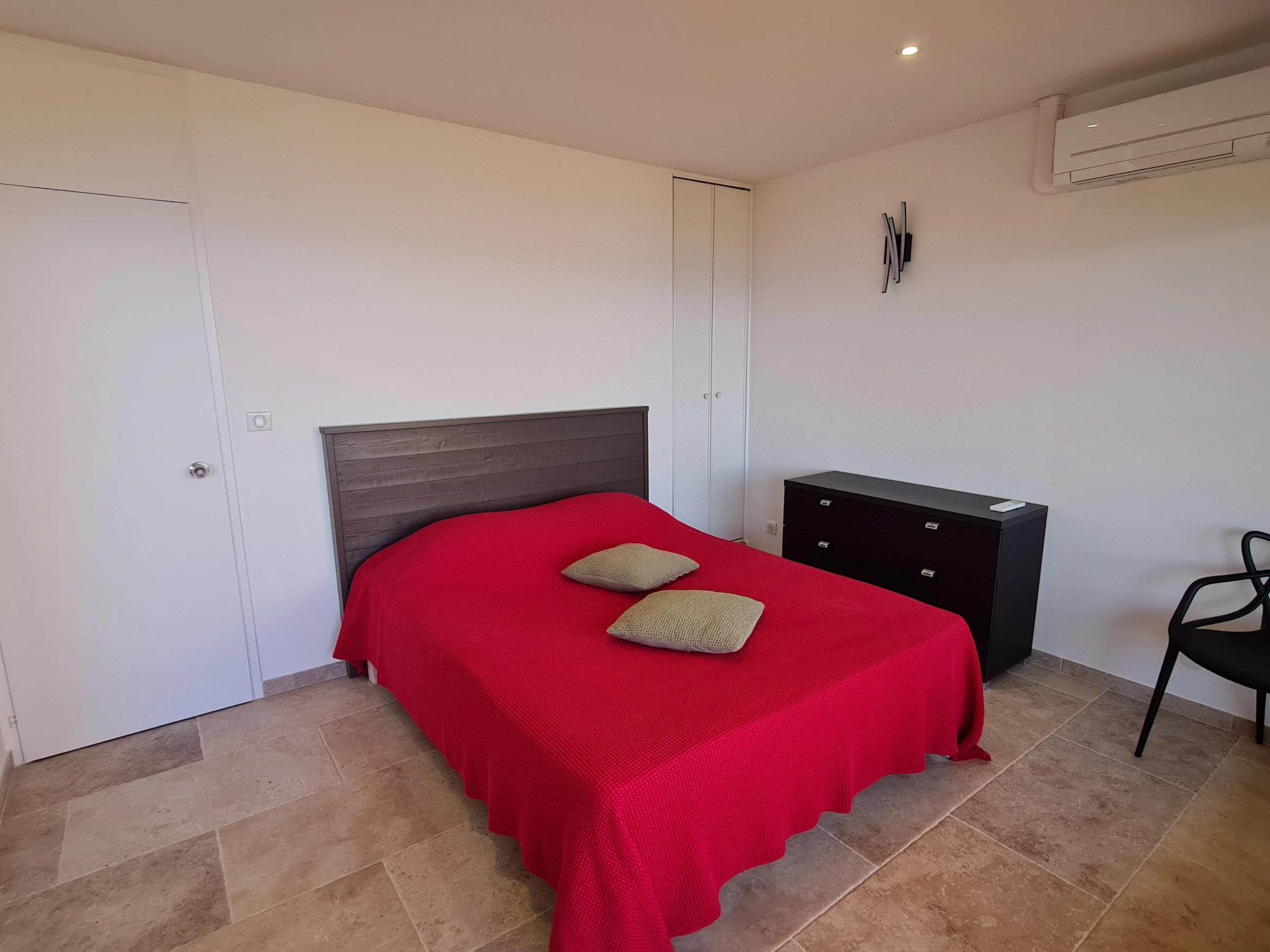 - Dormitorio con cama de matrimonio (160 cm) y acceso a una terraza con vistas al mar – Aire acondicionado.