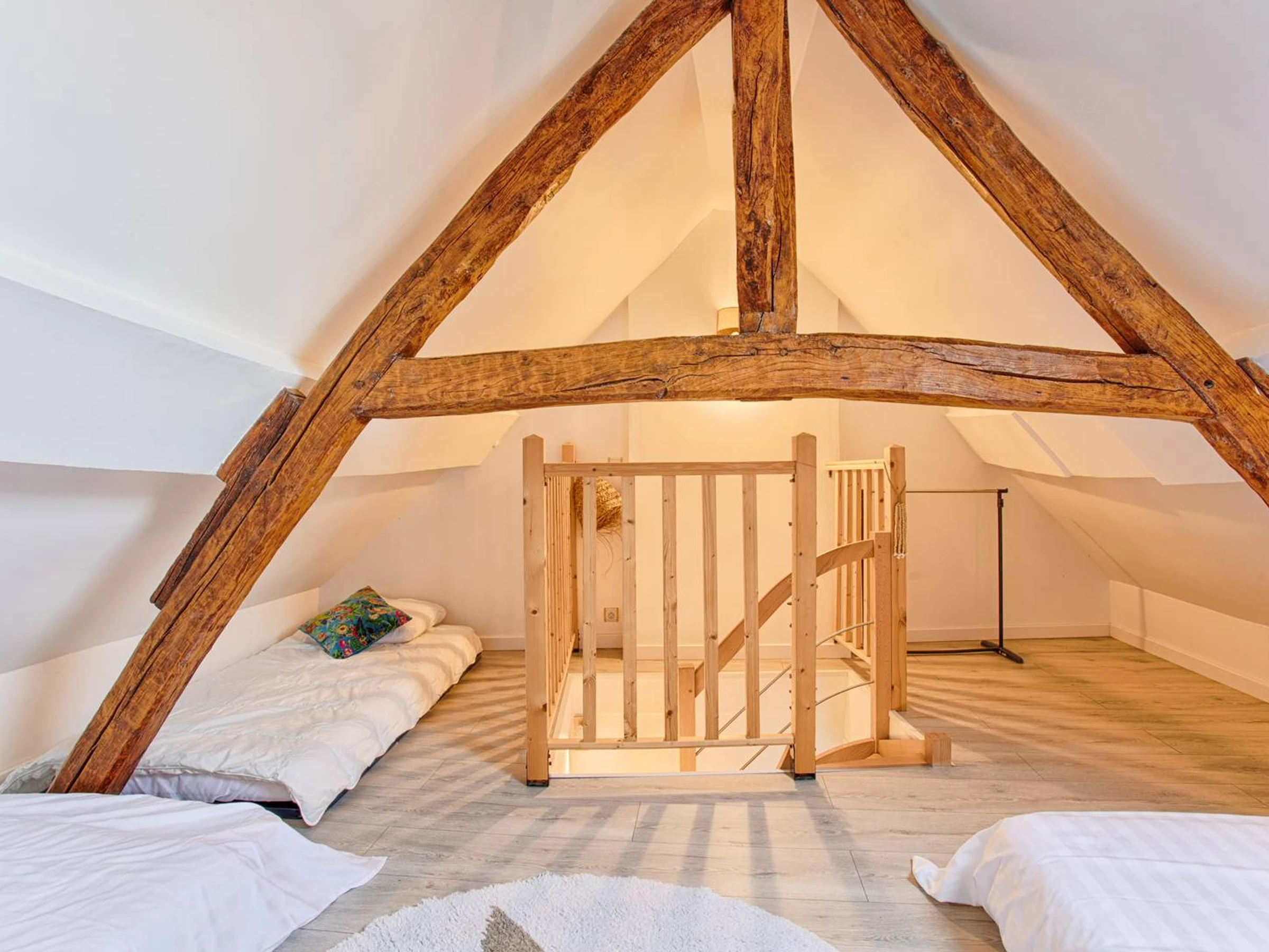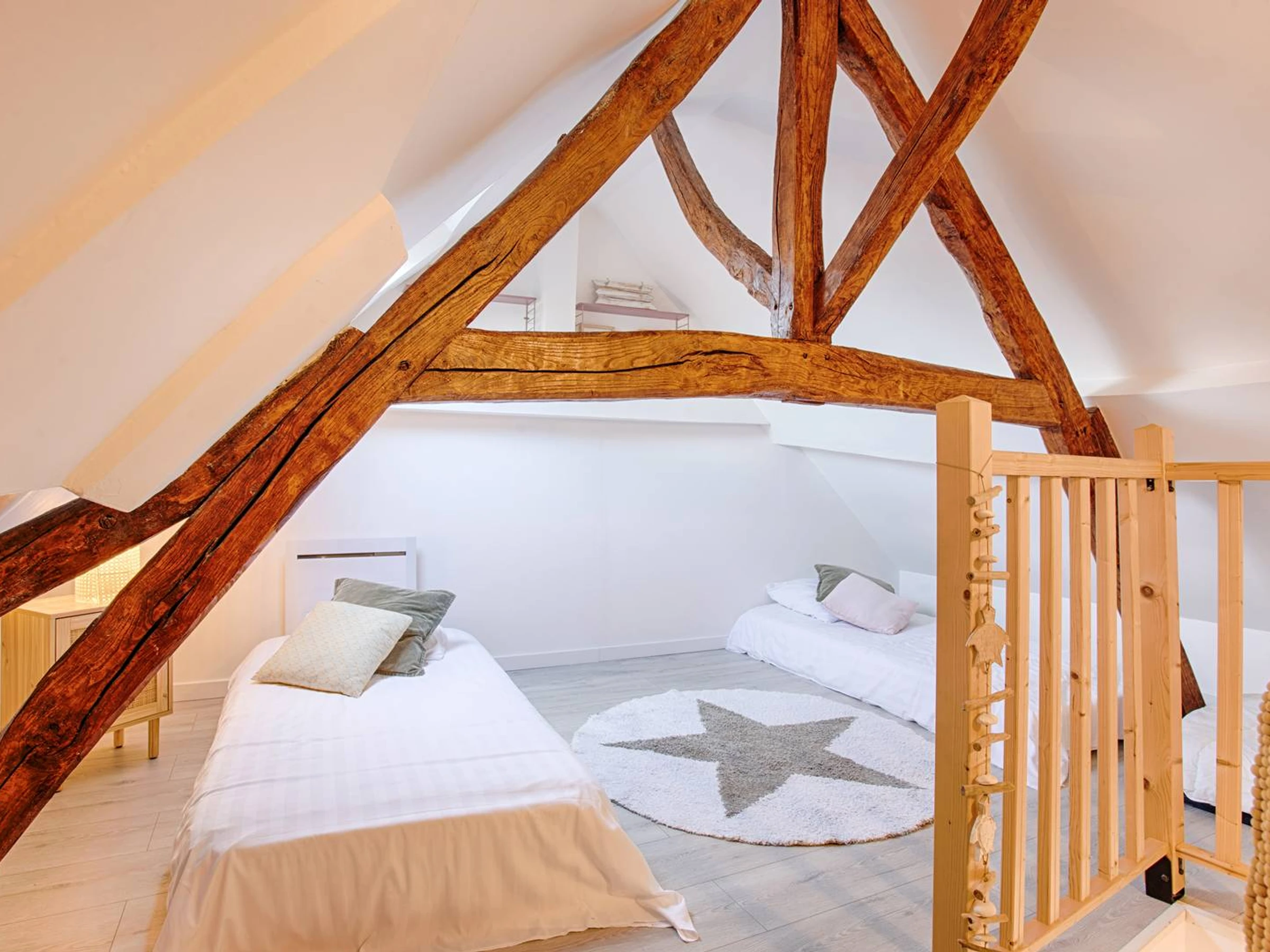 Arriba, un rellano bañado de luz que ofrece una vista de la bahía de Sallenelles. Desde allí, una acogedora sala al lado de la calle invita a noches tranquilas. Una última escalera conduce al ático, un espacio diseñado como un capullo para los niños, con tres camas individuales adicionales listas para dar la bienvenida a sus sueños y risas.