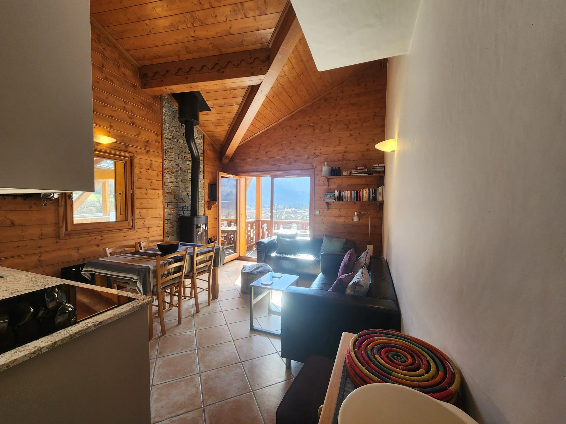 - Salón (ventanal sur - vista a la montaña y al pueblo) con zona de estar, estufa de leña, sofás fijos, TV, wifi 4G