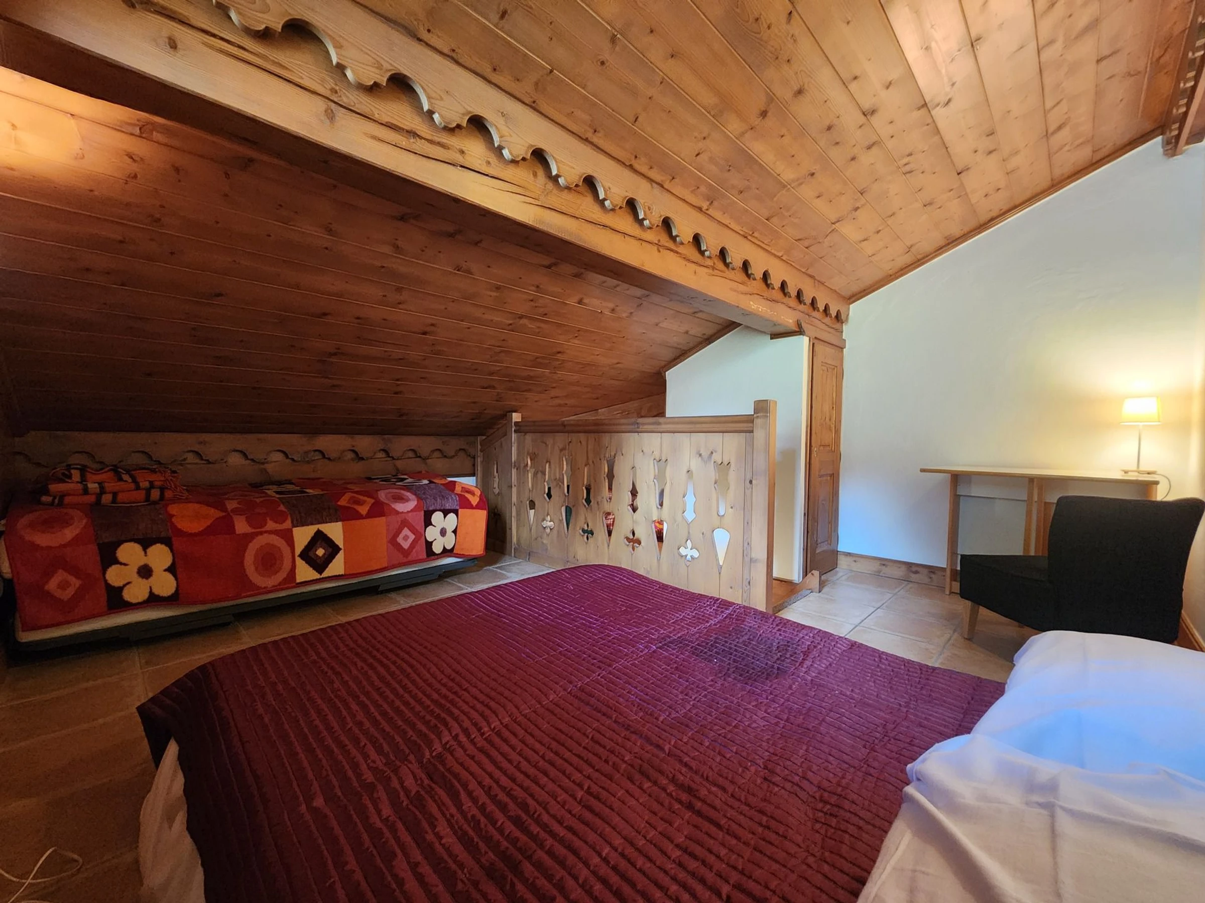 - Una habitación (3) abuhardillada con 3 camas individuales de 90 cm y un despacho en esquina