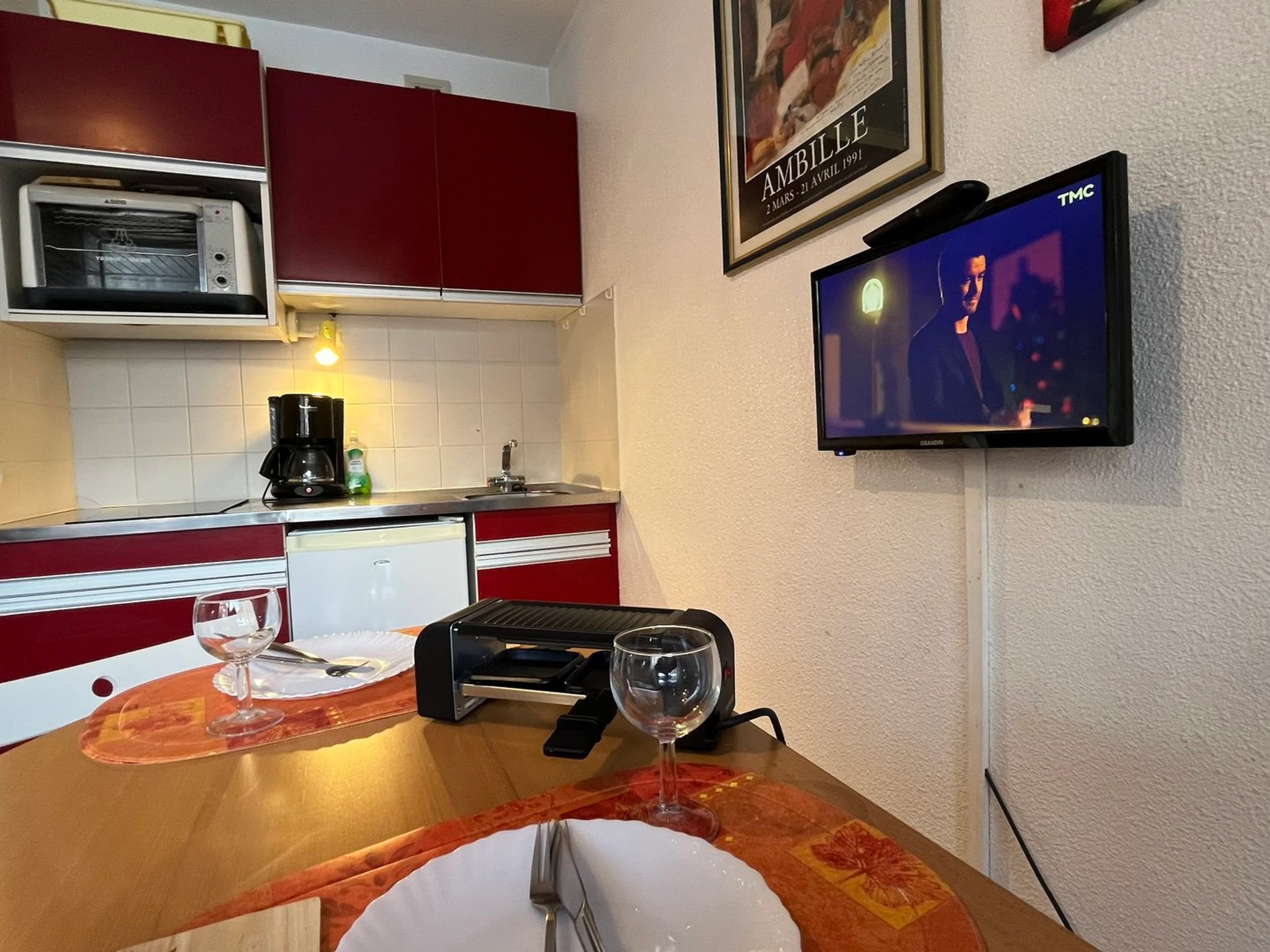 - Una cocina equipada (1,10 m²): horno, 2 placas vitrocerámicas, frigorífico (130 L);