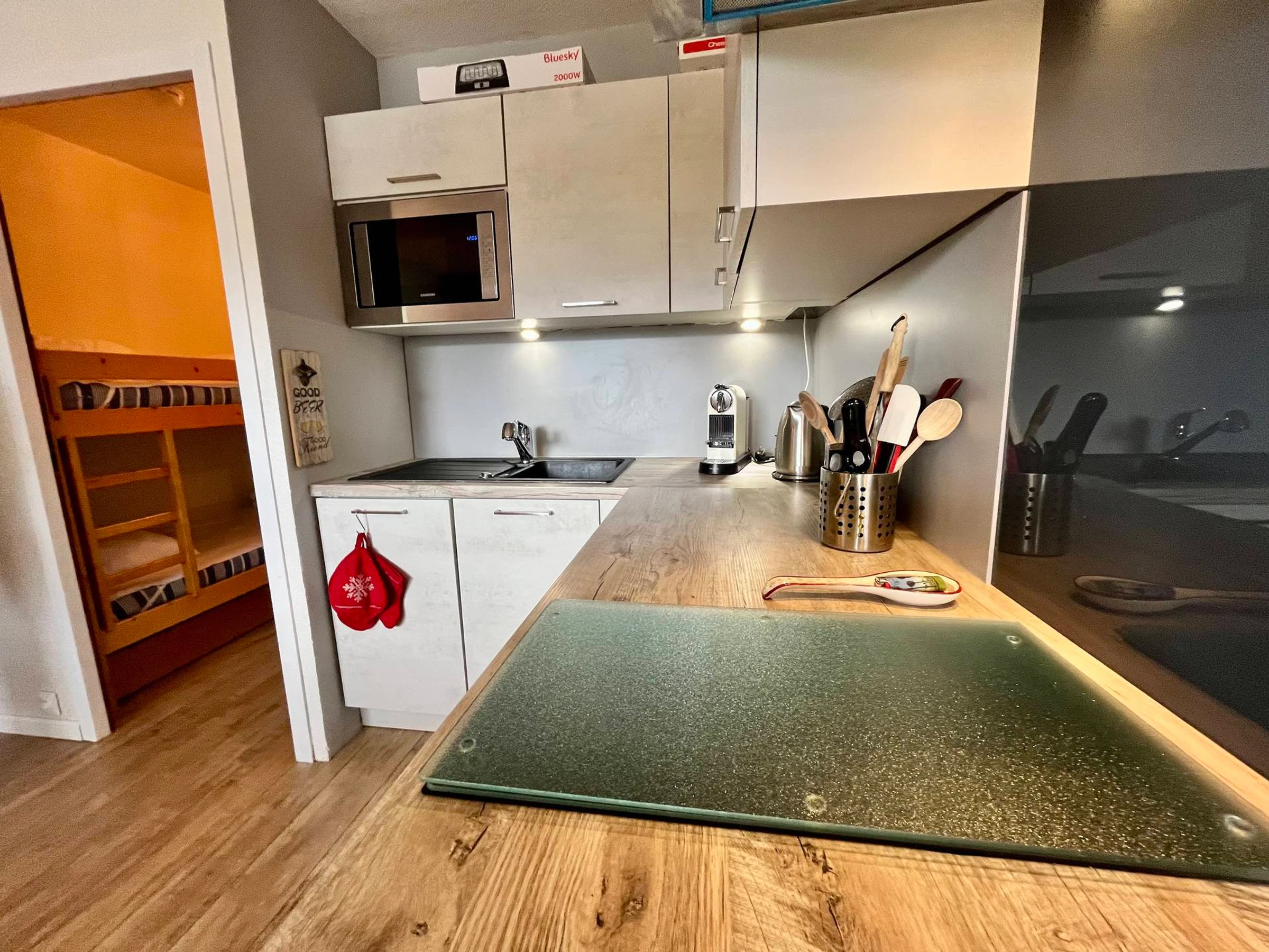 Cocina americana equipada (placa de 2 fuegos, lavavajillas, hervidor de agua, cafetera Nespresso, horno, microondas, tostadora).