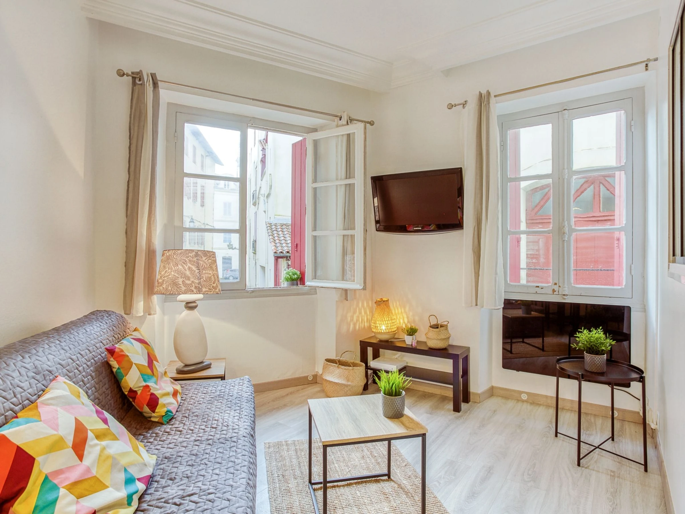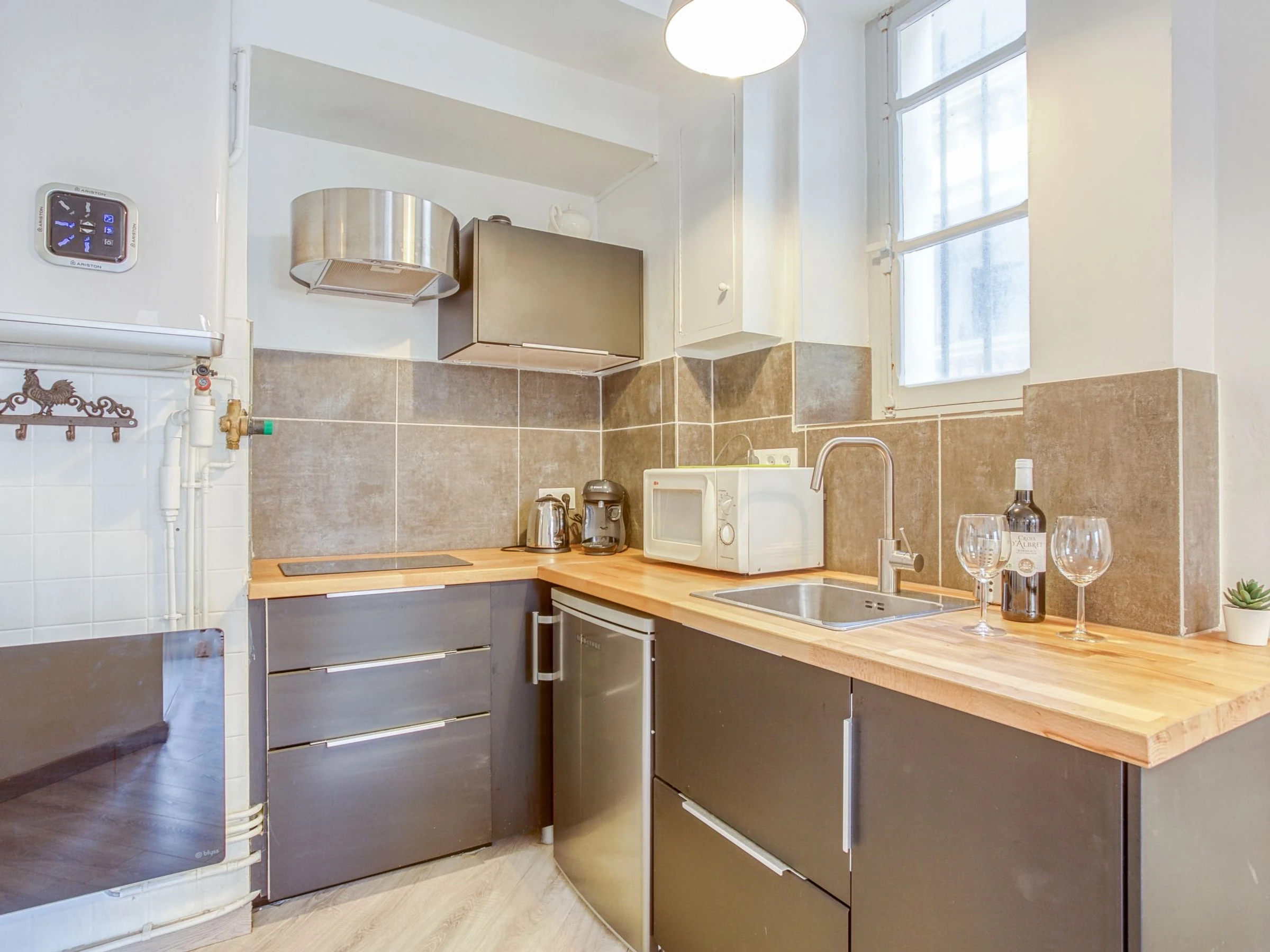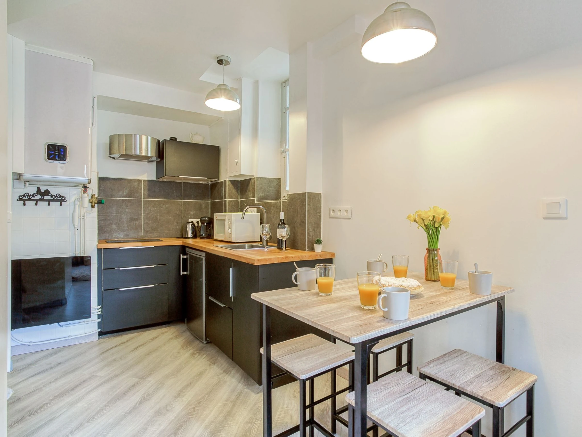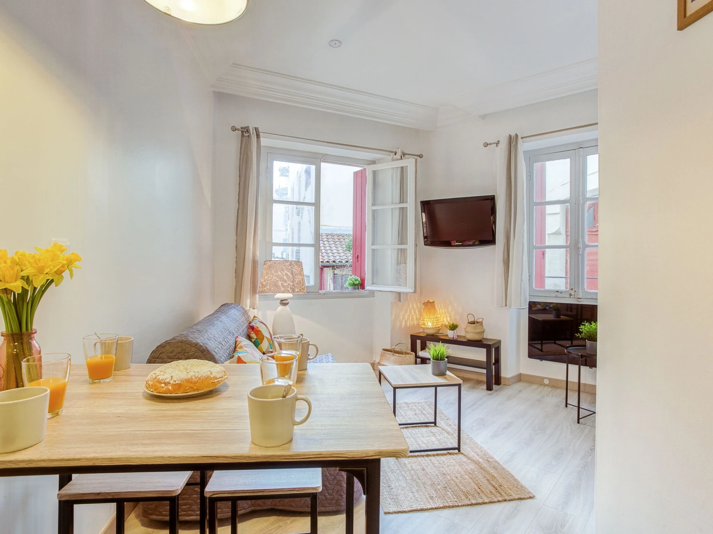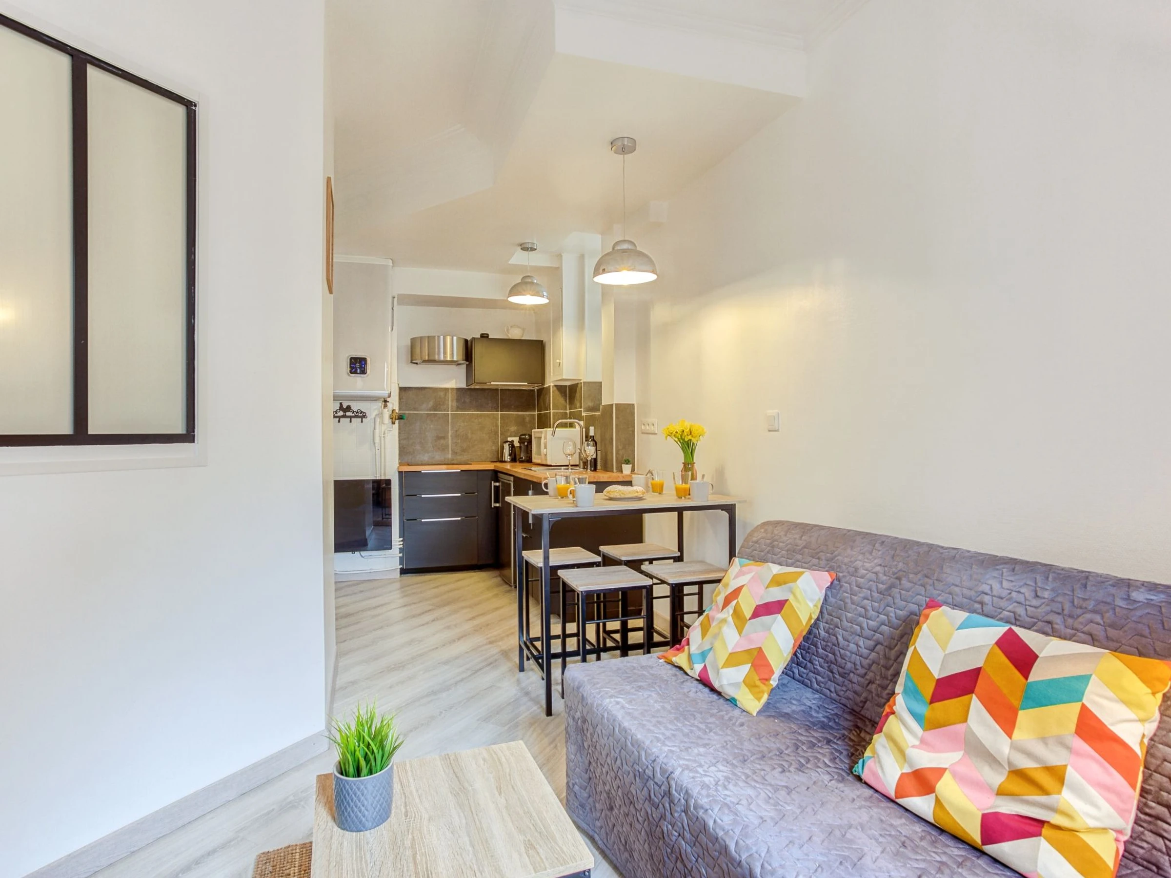 Apartamento de 2 habitaciones 30 m2, en la planta baja. Luminoso, con mobiliario funcional y de buen gusto: salón-comedor con 1 sofá-cama doble (1 x 140 cm, 190 cm de longitud), TV (pantalla plana). 1 dorm. con 1 cama de matrimonio (1 x 160 cm, 200 cm de longitud). Cocina abierta (2 Placas de inducción, tostadora, hervidor de agua eléctrico, microondas, cafetera eléctrica, Cápsulas de café (Tassimo) extra). Ducha/WC. Calefacción eléctrica. El alojamiento dispone de: plancha, secador de pelo. Internet (Wifi, gratis). A tener en cuenta: detector de humo. [hidden]