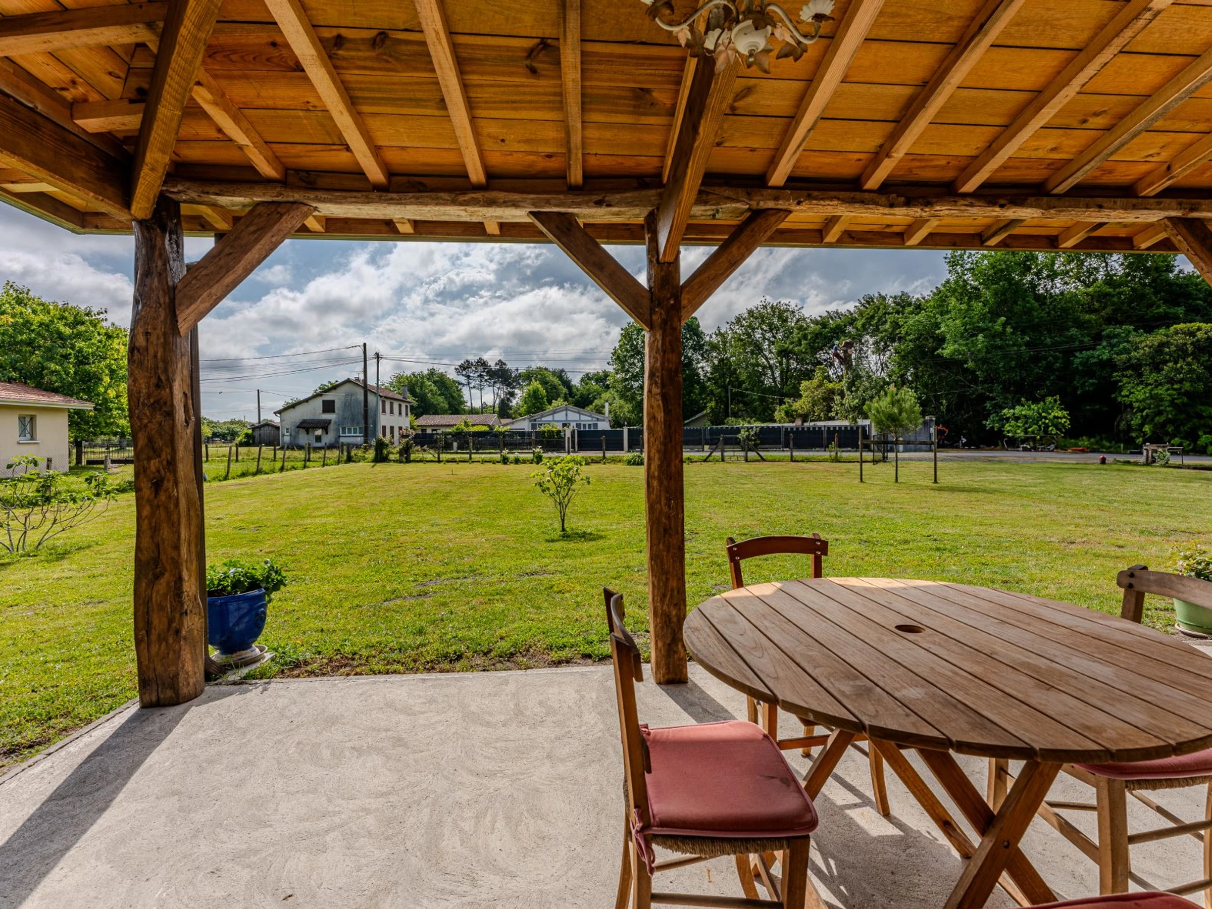 Amplia terraza cubierta orientada al sur con mobiliario de jardín.