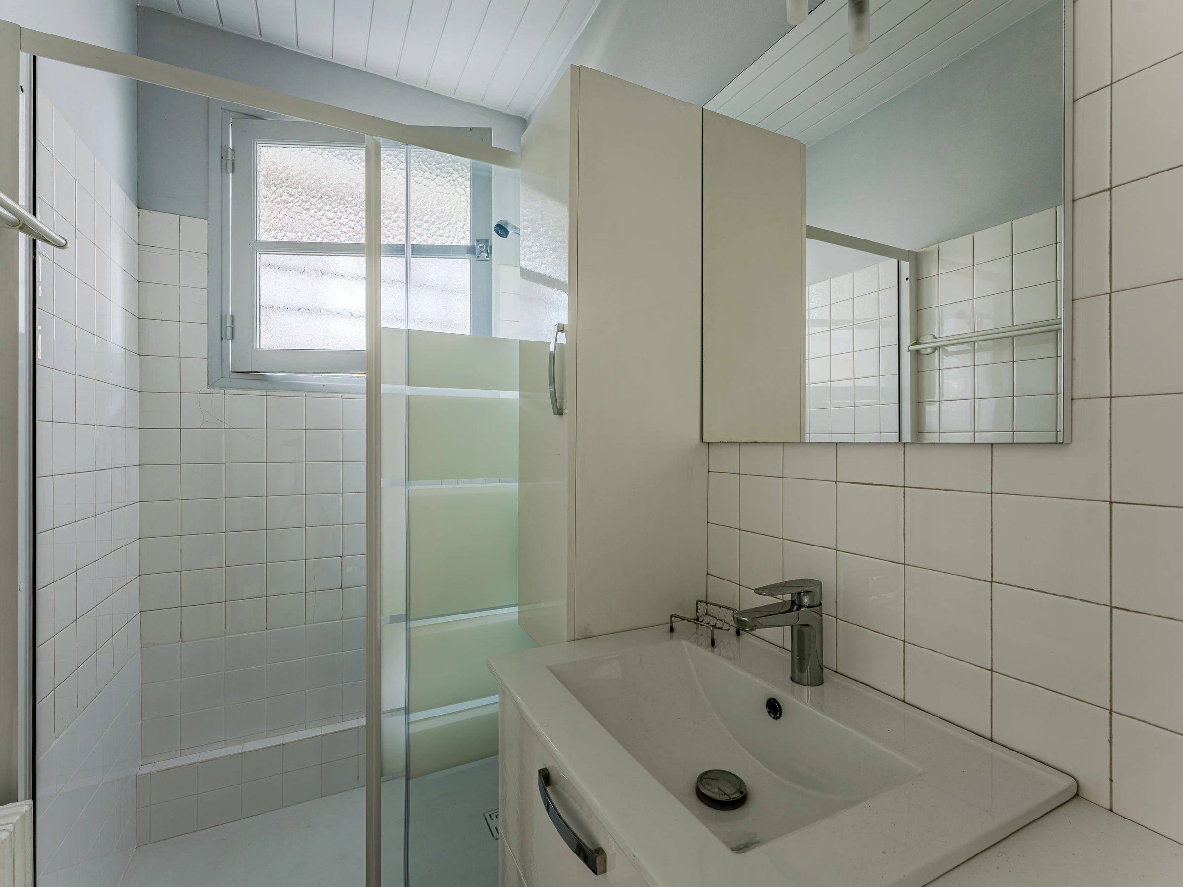 Baño con ducha y lavabo.