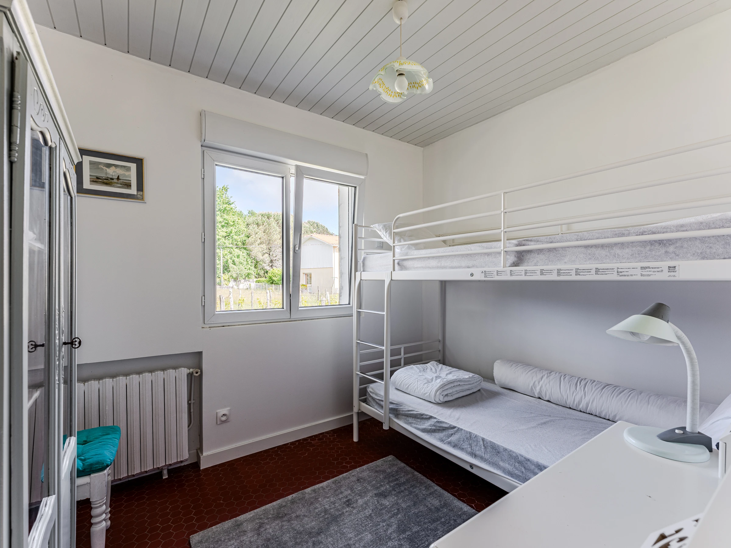 Un dormitorio con dos literas (90x190 cm), armario y escritorio pequeño.