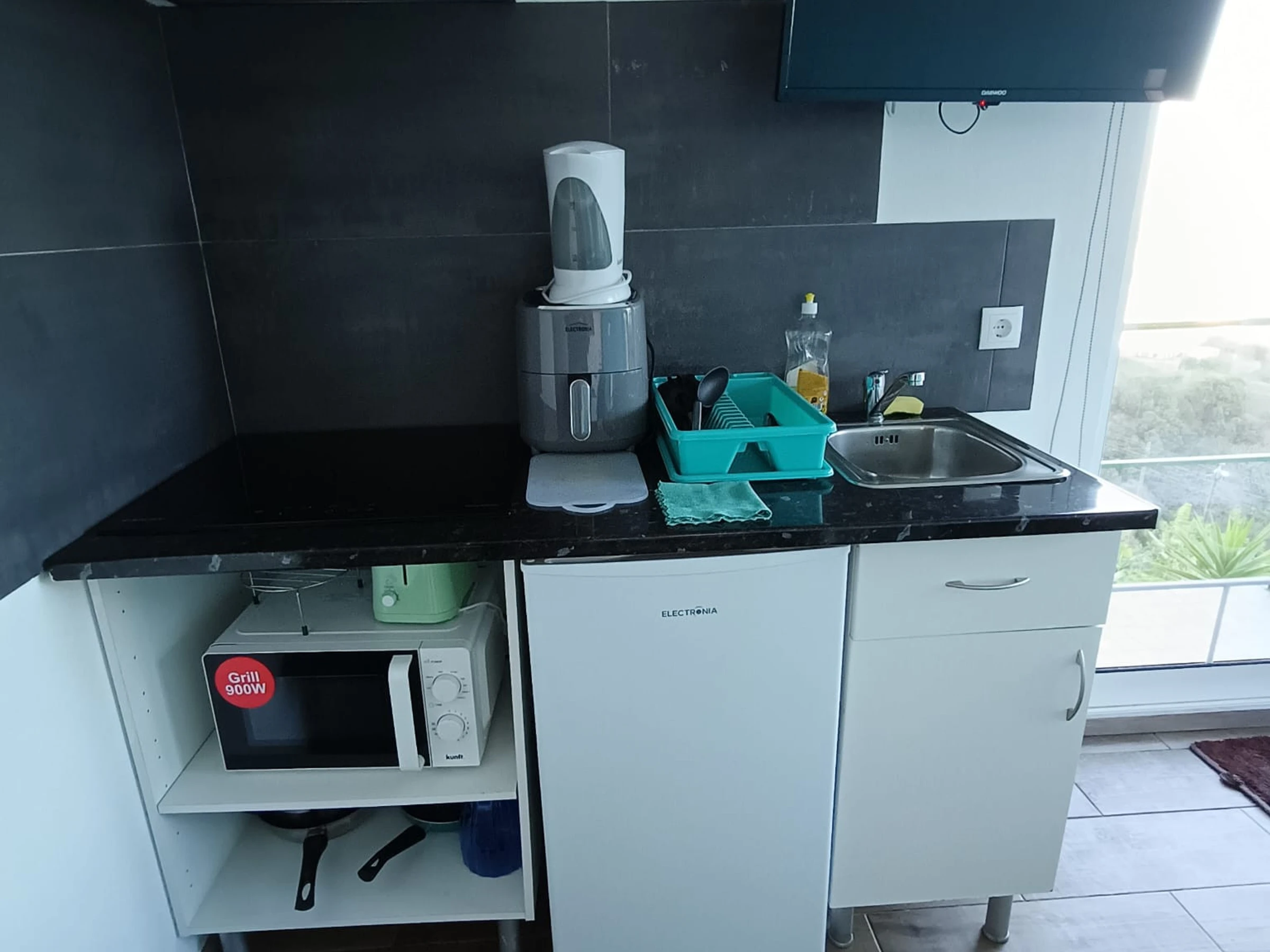 La cocina americana, de inducción, está equipada con nevera, microondas, horno, congelador, vajilla/cubertería, utensilios/cocina, tostadora y hervidor de agua.