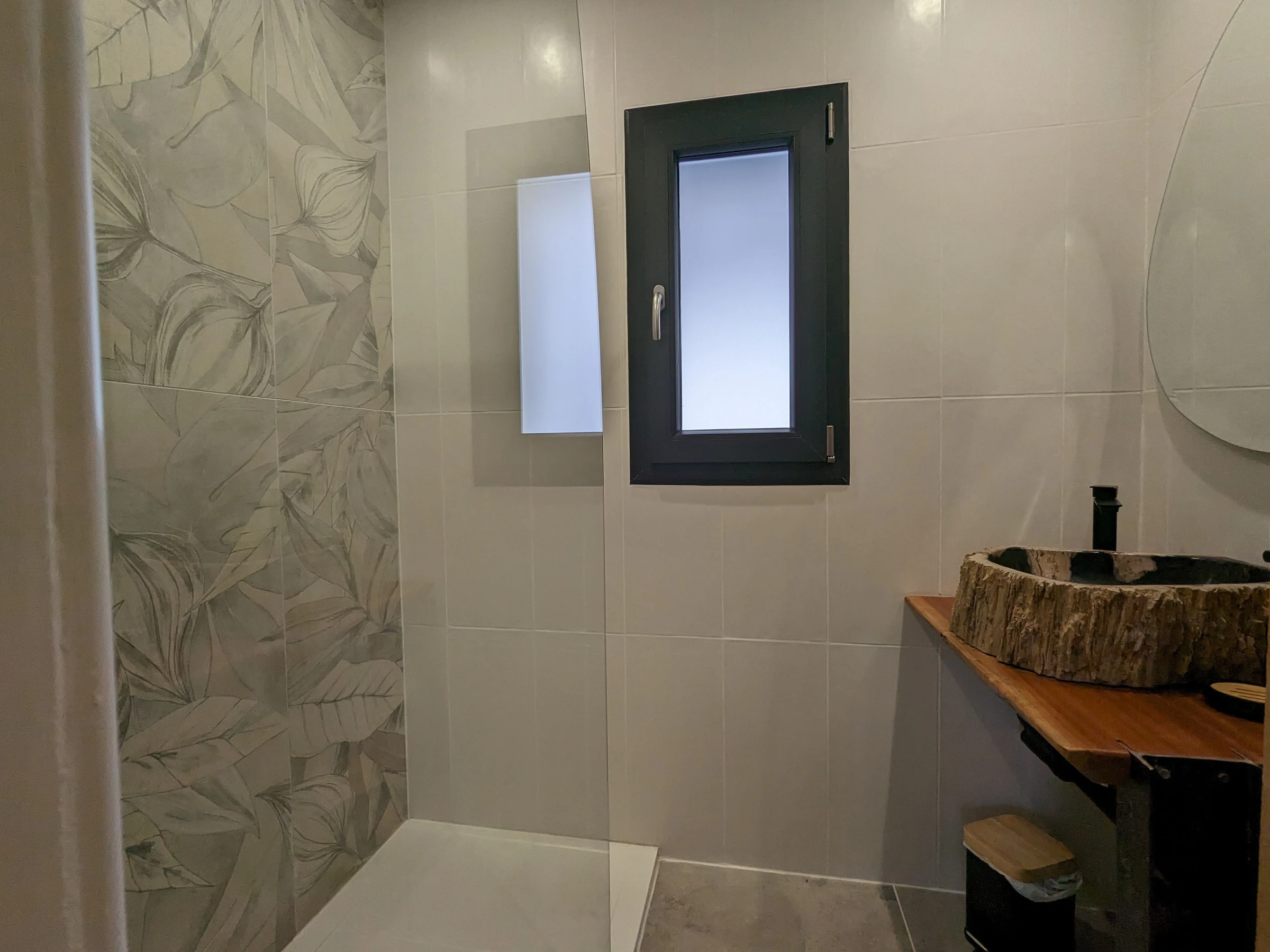 - Un baño con plato de ducha, secador de pelo y secador de toallas. Una palangana.