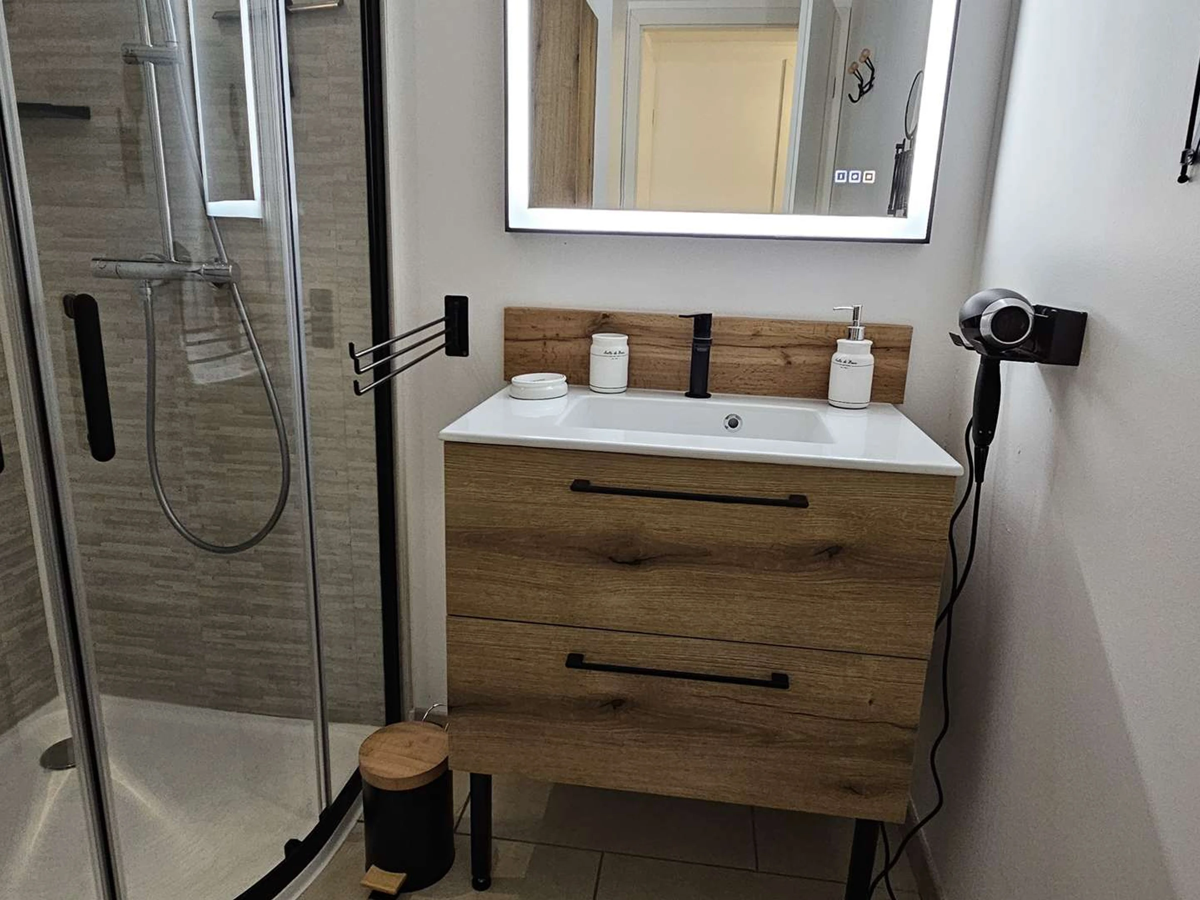 Cuarto de baño con ducha, lavabo y secador de pelo.