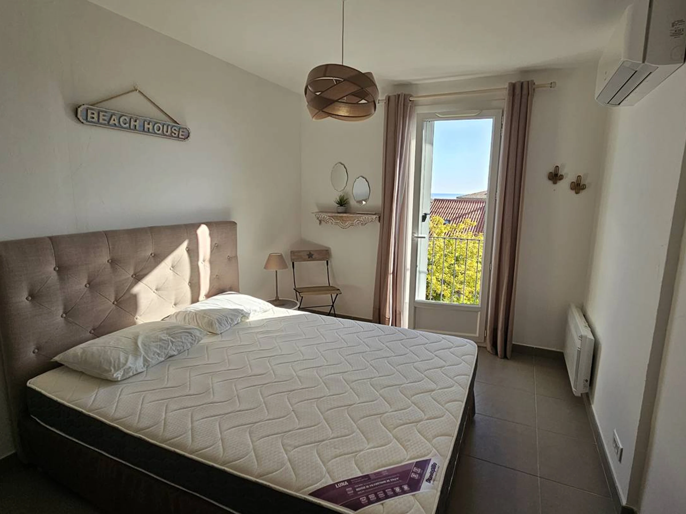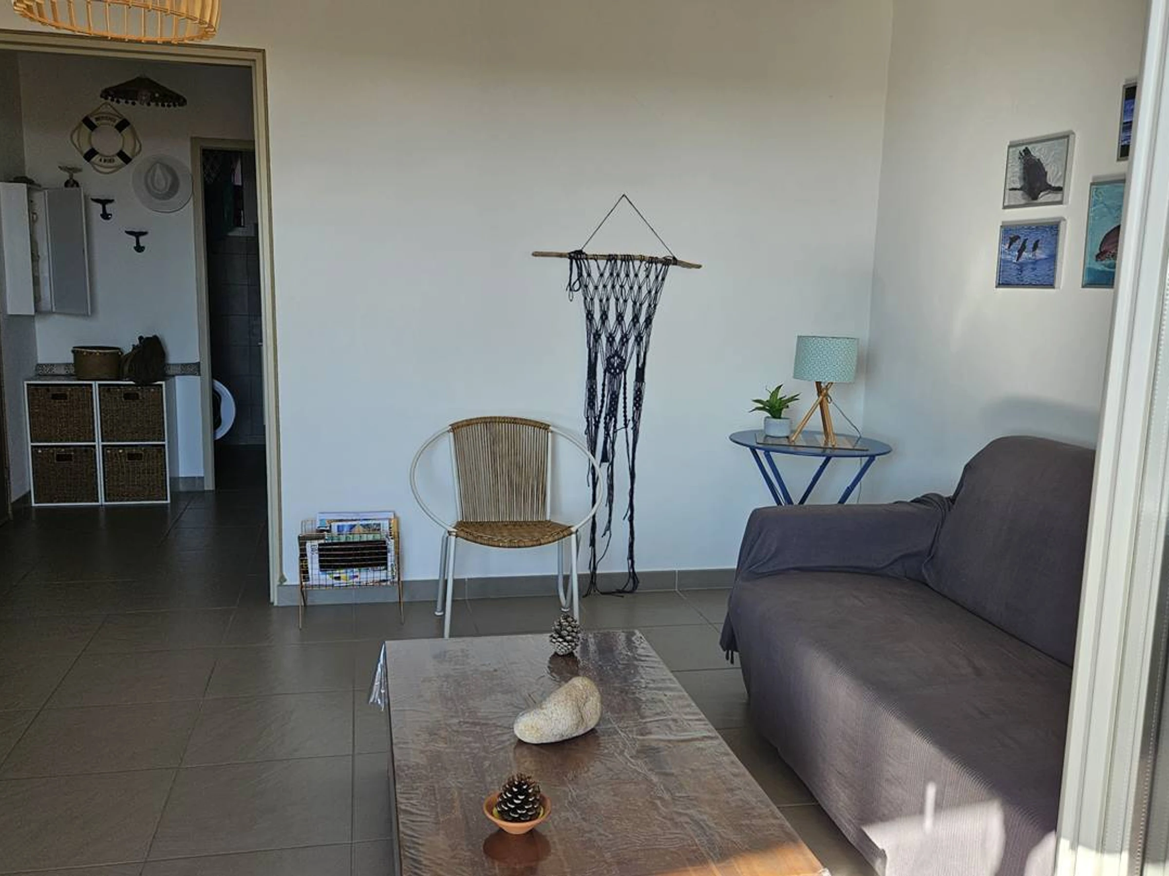 - Salón :(climatizado) 2 sofás convertibles (140cm), TV (pantalla plana con TNT), apertura a la terraza cubierta: vista al mar y al pueblo, mesa de jardín.