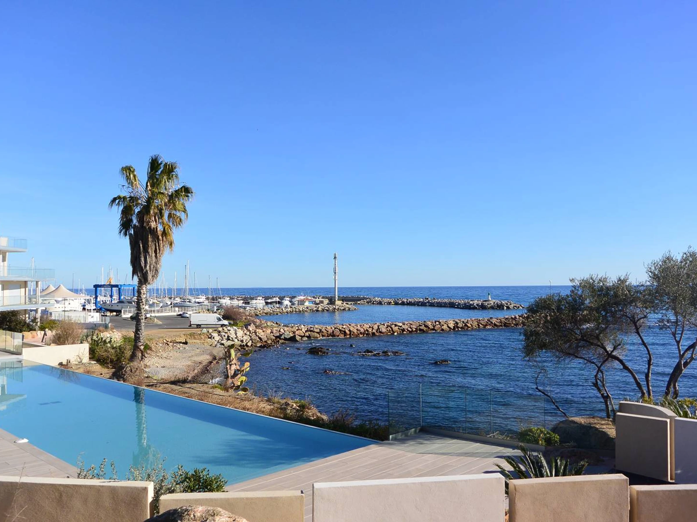 - Salón luminoso y climatizado con dos sofás fijos, TV de pantalla plana, WIFI, mesa de comedor : ventanal que da directamente a la terraza cubierta de 21 m², equipada con muebles de jardín, tumbonas, sombrilla... Vistas al mar y a la piscina.