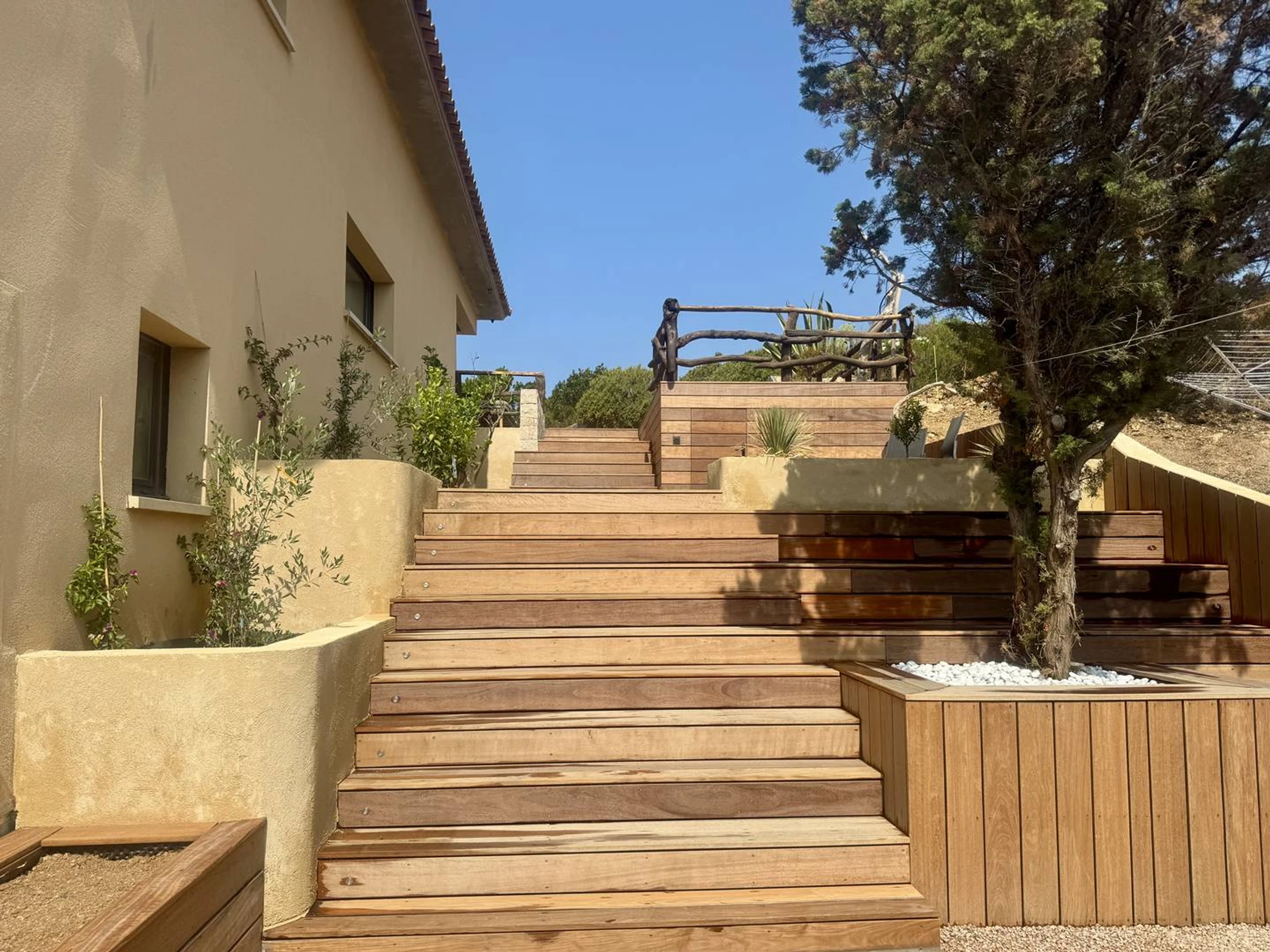 Lo más destacado de esta villa es su majestuosa escalera de madera, diseñada por un arquitecto, que ilumina el espacio. La luz se desvanece suavemente al anochecer, creando un ambiente cálido y único en toda la casa.