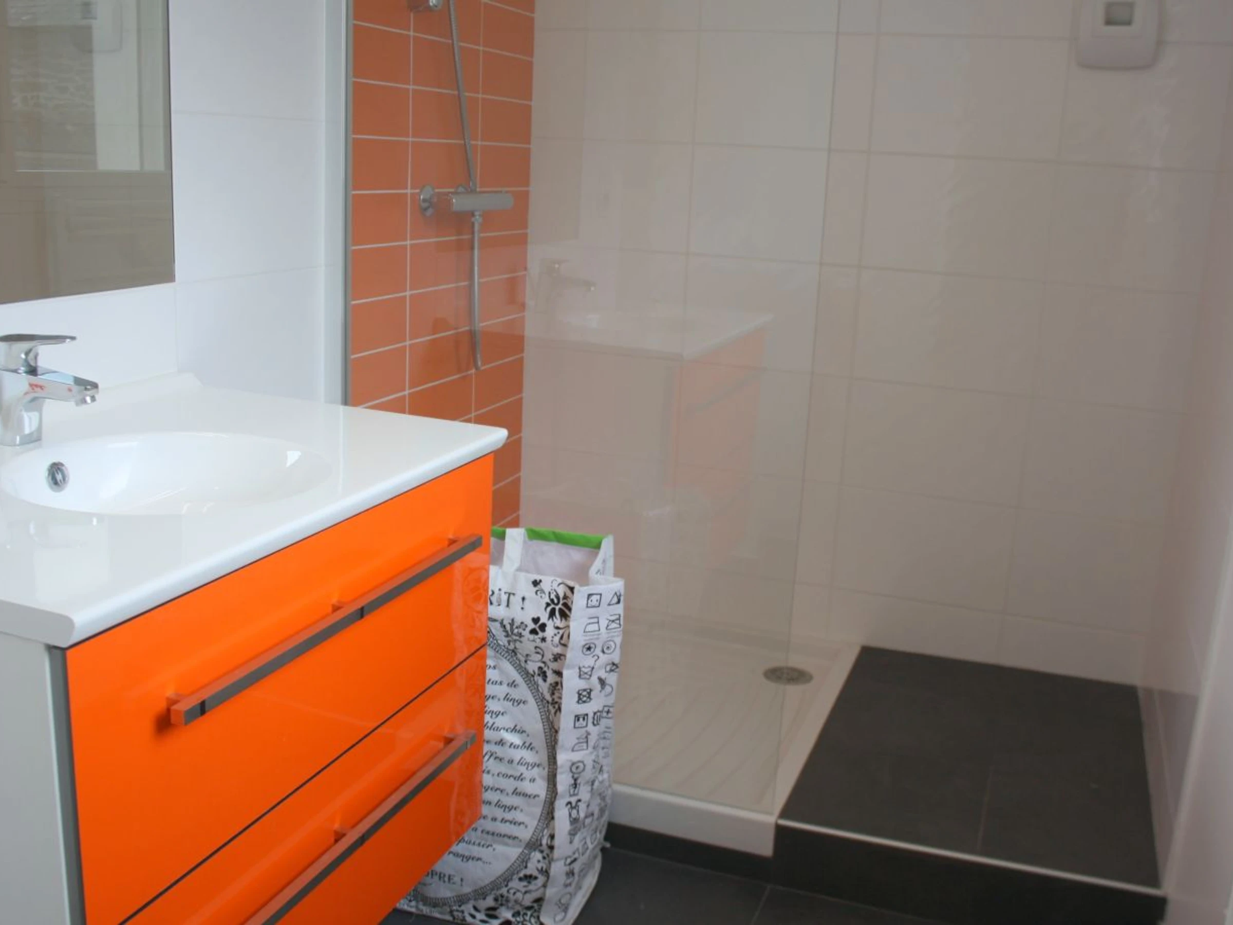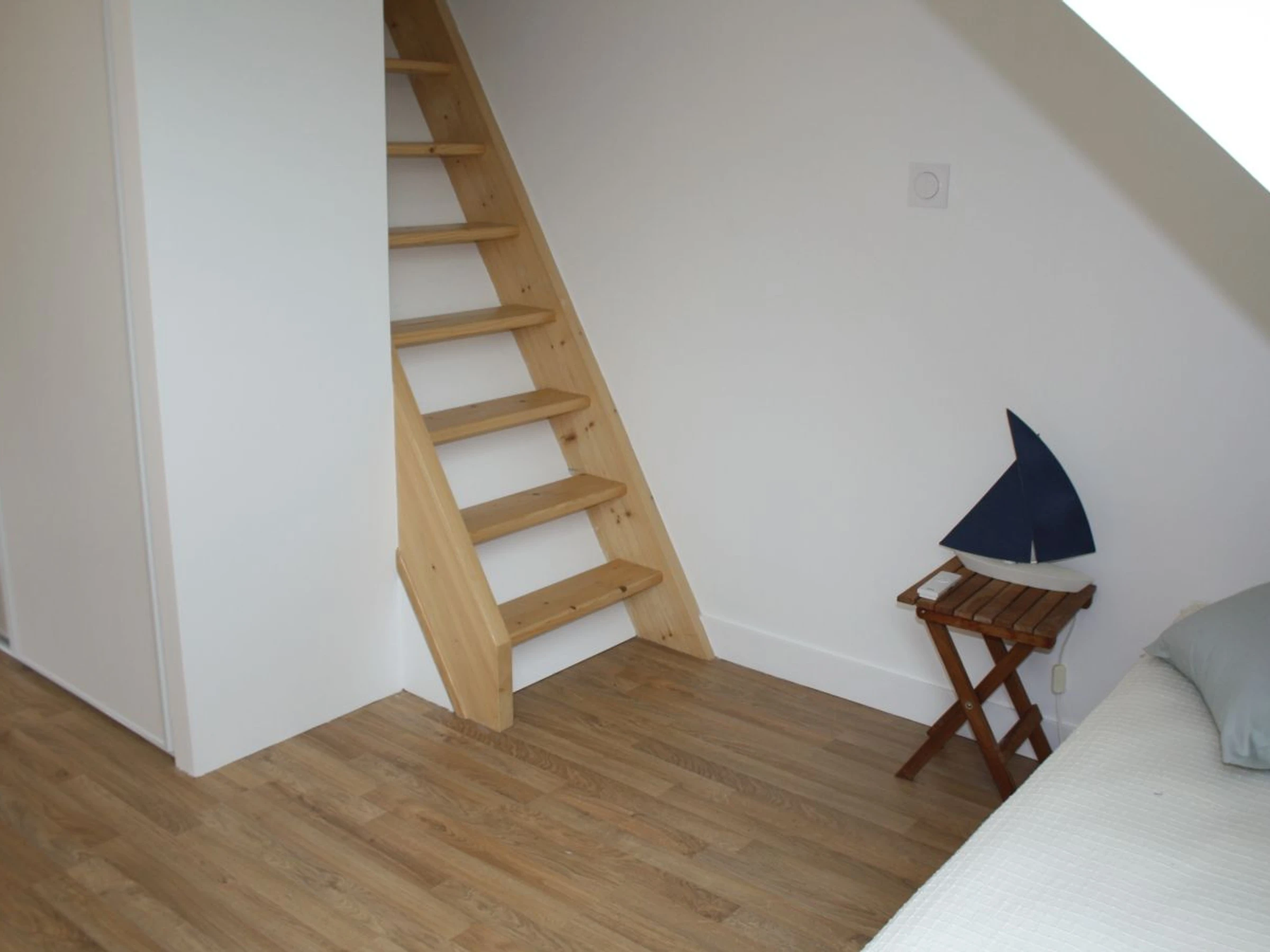 En la planta superior: un baño con ducha. El primer dormitorio tiene una cama doble (140 cm) y un amplio armario (estanterías/espacio para colgar). El segundo dormitorio tiene una cama individual (90 cm), un vestidor (estanterías/espacio para colgar) y una entreplanta con techo bajo y un colchón de 160 cm en el suelo. Se accede al entrepiso por una empinada escalera de madera, también conocida como escalera de molinero. Ropa de cama nueva.