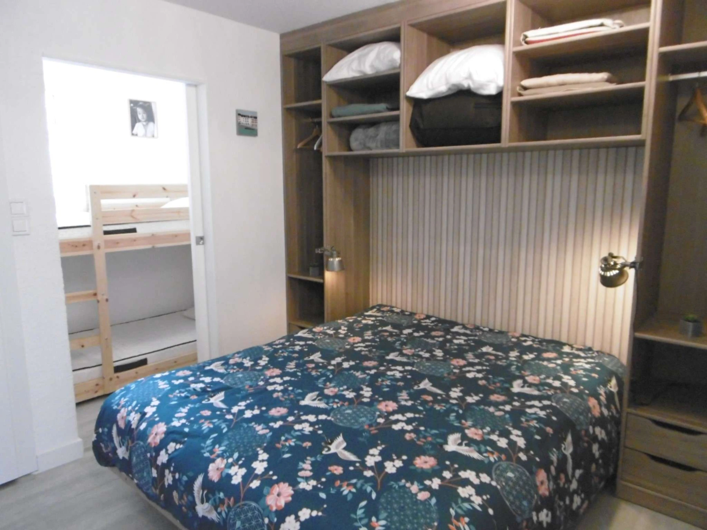 - Dormitorio con cama doble de 160 cm que conecta con una cabina con literas.