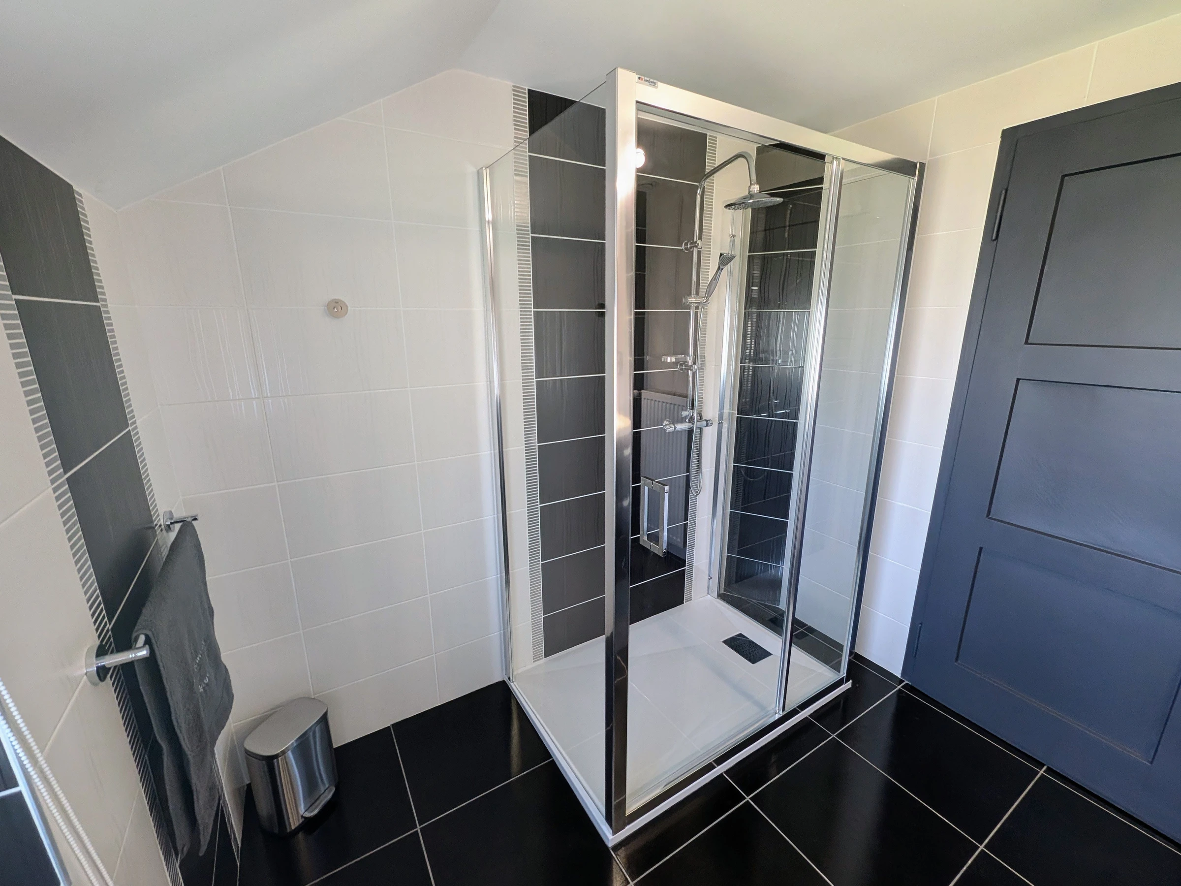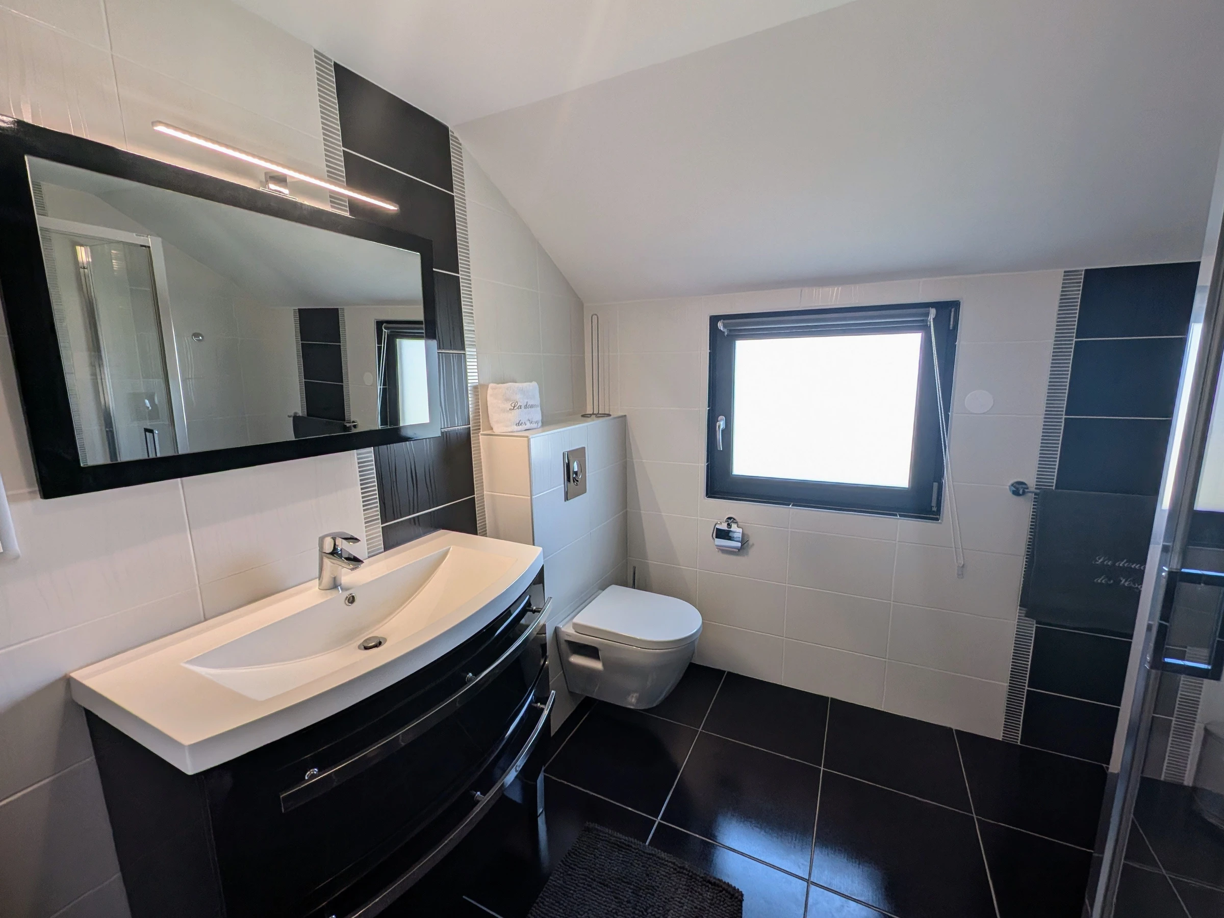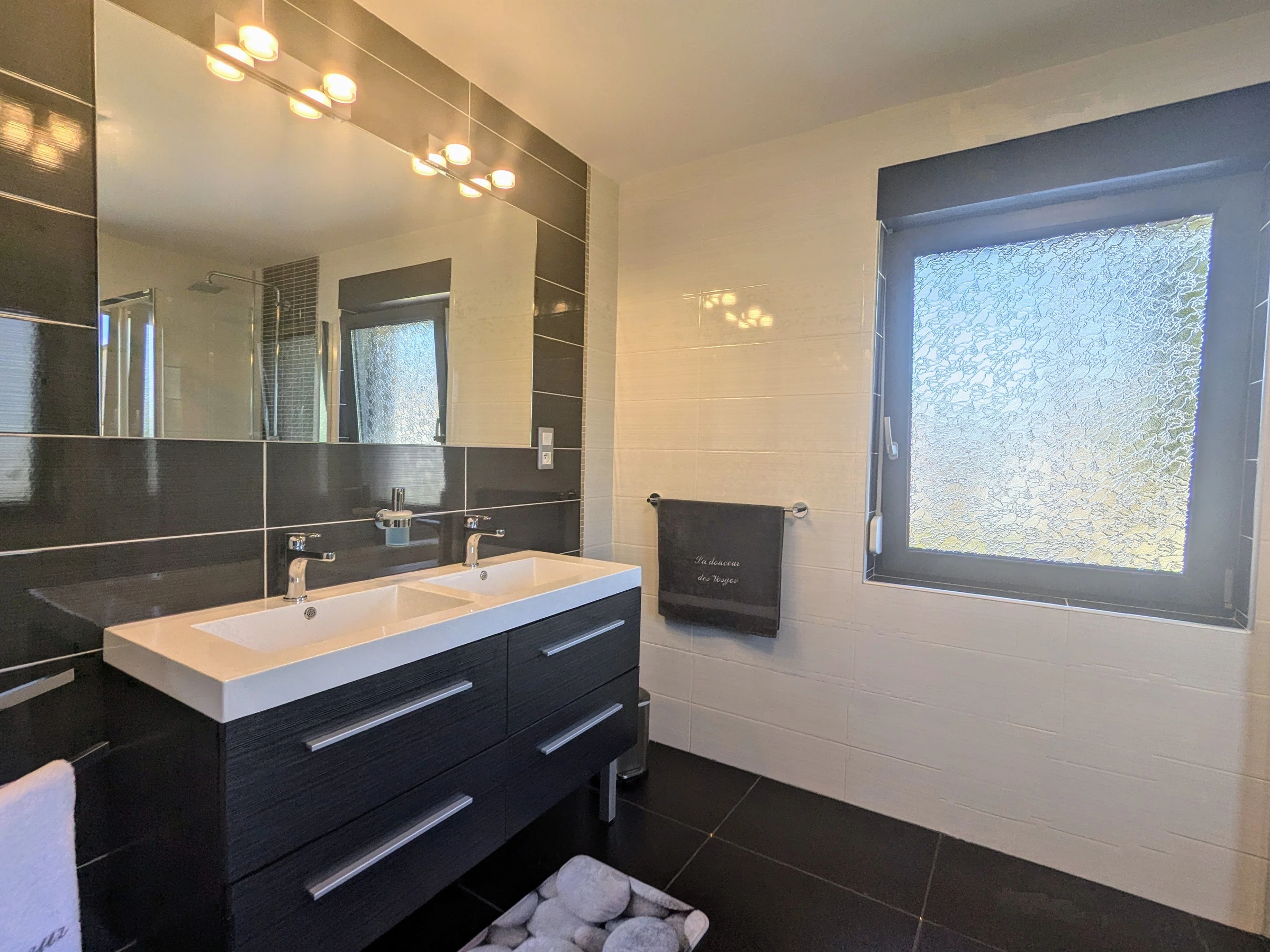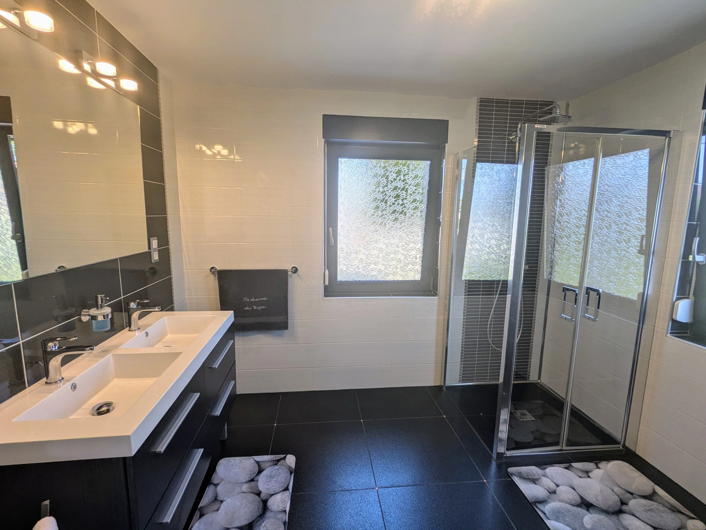 En la planta baja también hay un baño independiente con ducha a ras de suelo, lavabos dobles y secador de pelo. Aseo independiente.