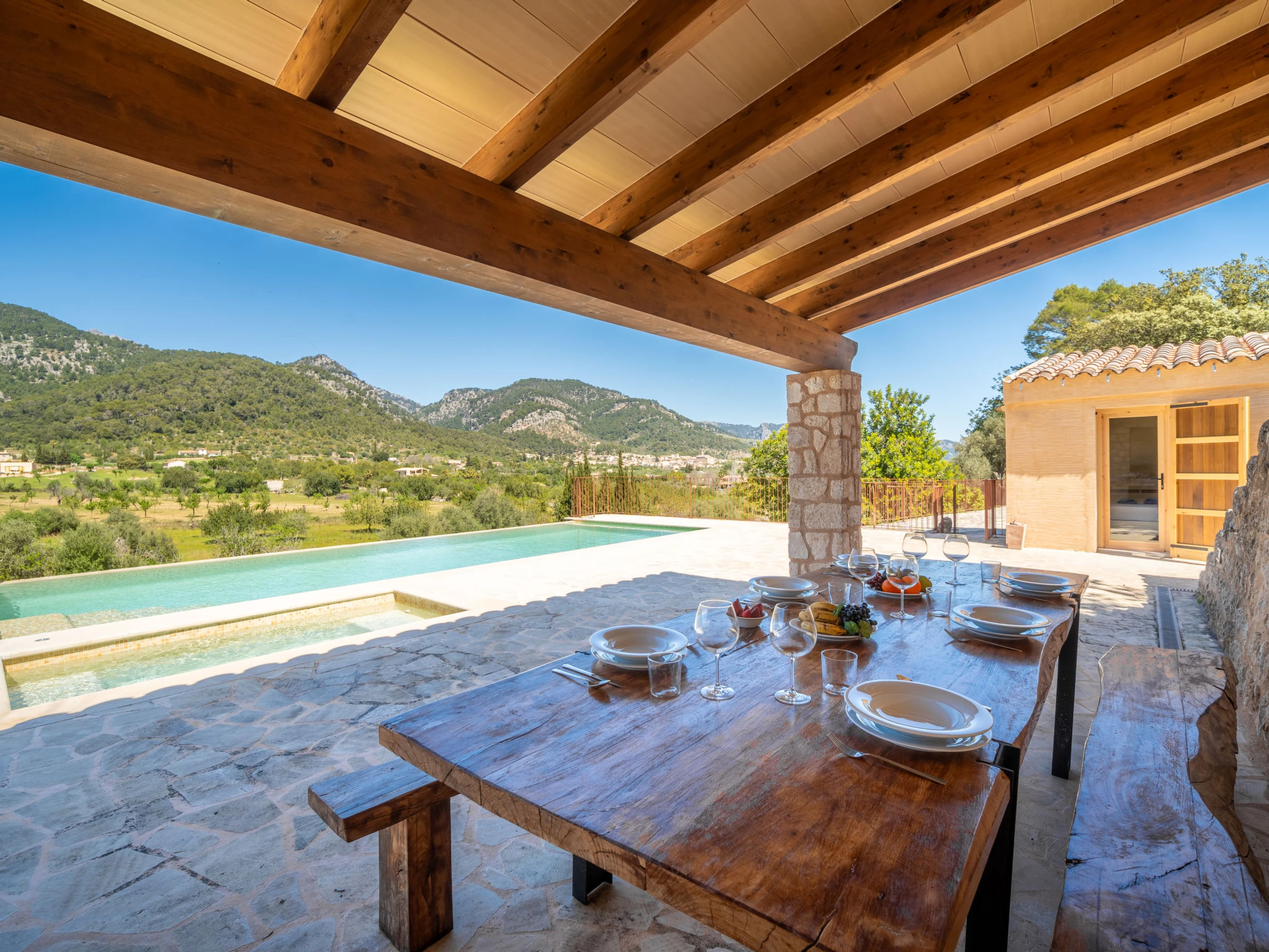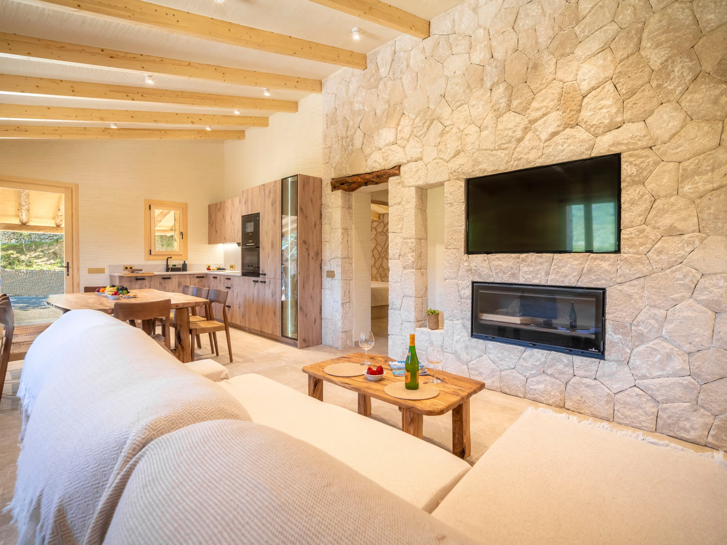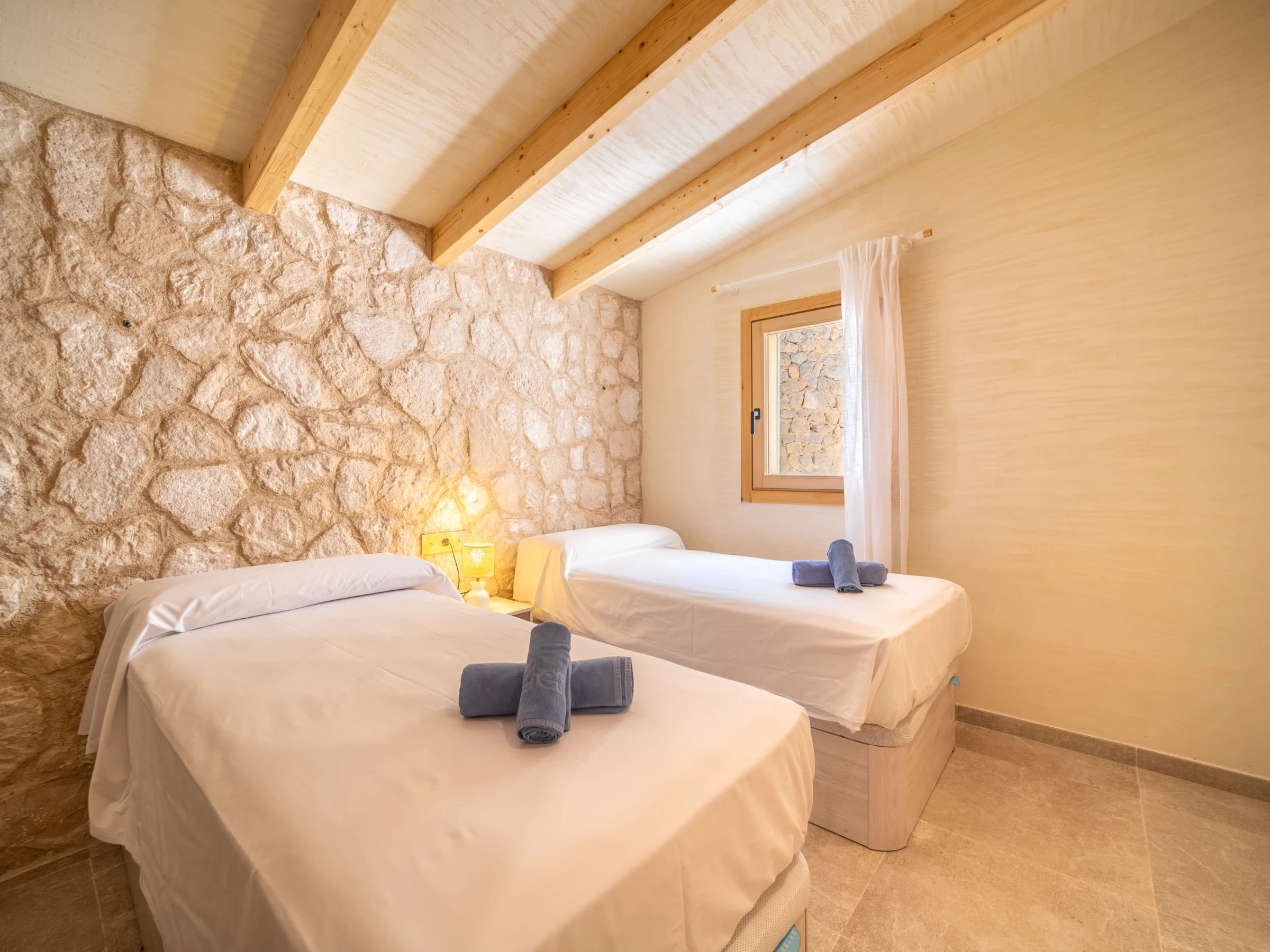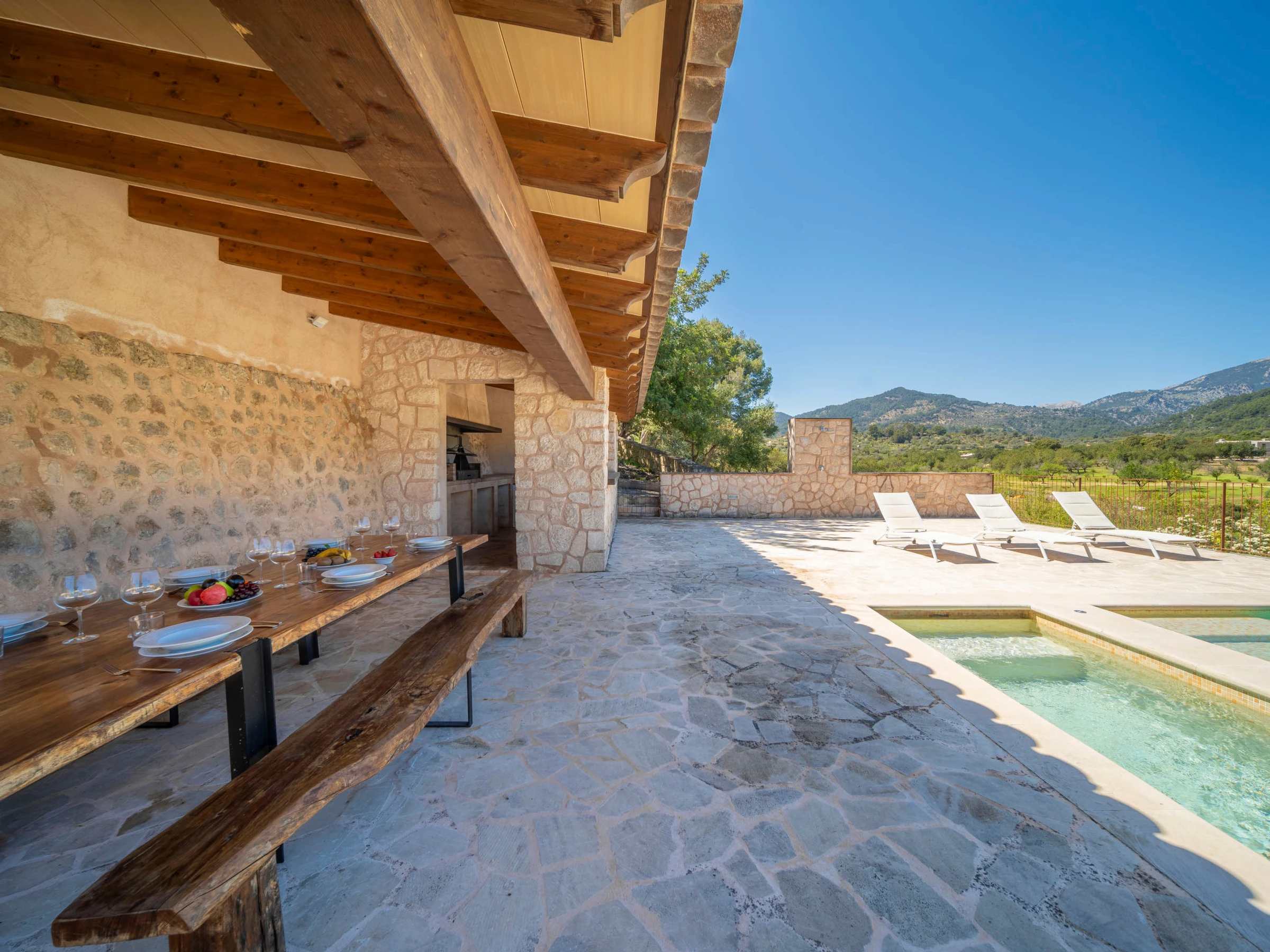 "Can Garcia", villa 4 estancias 100 m2, en planta baja. Vivienda adecuada para 4 adultos. Luminoso, completamente reformada, con mobiliario confortable y moderno: salón-comedor grande con mesa de comedor, TV, pantalla plana y aire acondicionado. Salida a la terraza-jardín. 1 dorm. doble con 1 cama de matrimonio (150 cm, 190 cm de longitud), ducha/WC y aire acondicionado. Salida a la terraza-jardín. 1 dorm. doble con 2 camas (90 cm, 190 cm de longitud), aire acondicionado. 1 dorm. doble con 1 cama de matrimonio (150 cm, 190 cm de longitud), aire acondicionado. Cocina abierta (horno, lavavajillas, 4 Placas de inducción, tostadora, hervidor de agua eléctrico, microondas, congelador, cafetera eléctrica) con mesa de comedor, chimenea (sólo con función decorativa), aire acondicionado. Salida a la terraza, a la piscina. 2 ducha/WC. Calefacción por suelo. Suelo de piedra natural. Mobiliario confortable de estilo rural. Terraza grande. Muebles de terraza, barbacoa, tumbonas, porche. Vista panorámica a las montañas, al paisaje y al pueblo. El alojamiento dispone de: lavadora. Internet (Wifi, gratis). Junto a la casa. A tener en cuenta: adecuado para familias. Casa para no fumadores. La piscina descrita es de uso privado. [hidden] // Reg. Nr.: ESFCTU0000070220000220140000000000000000000[hidden]9