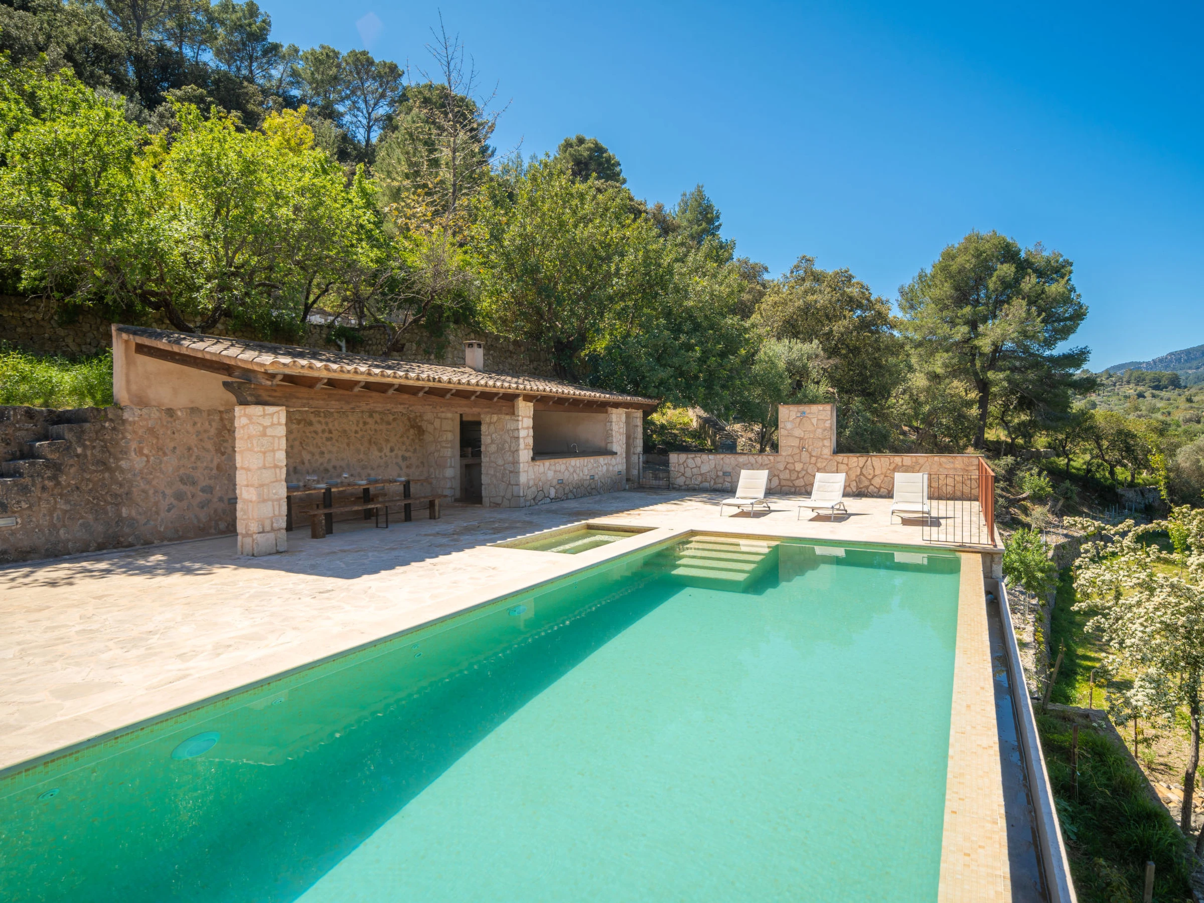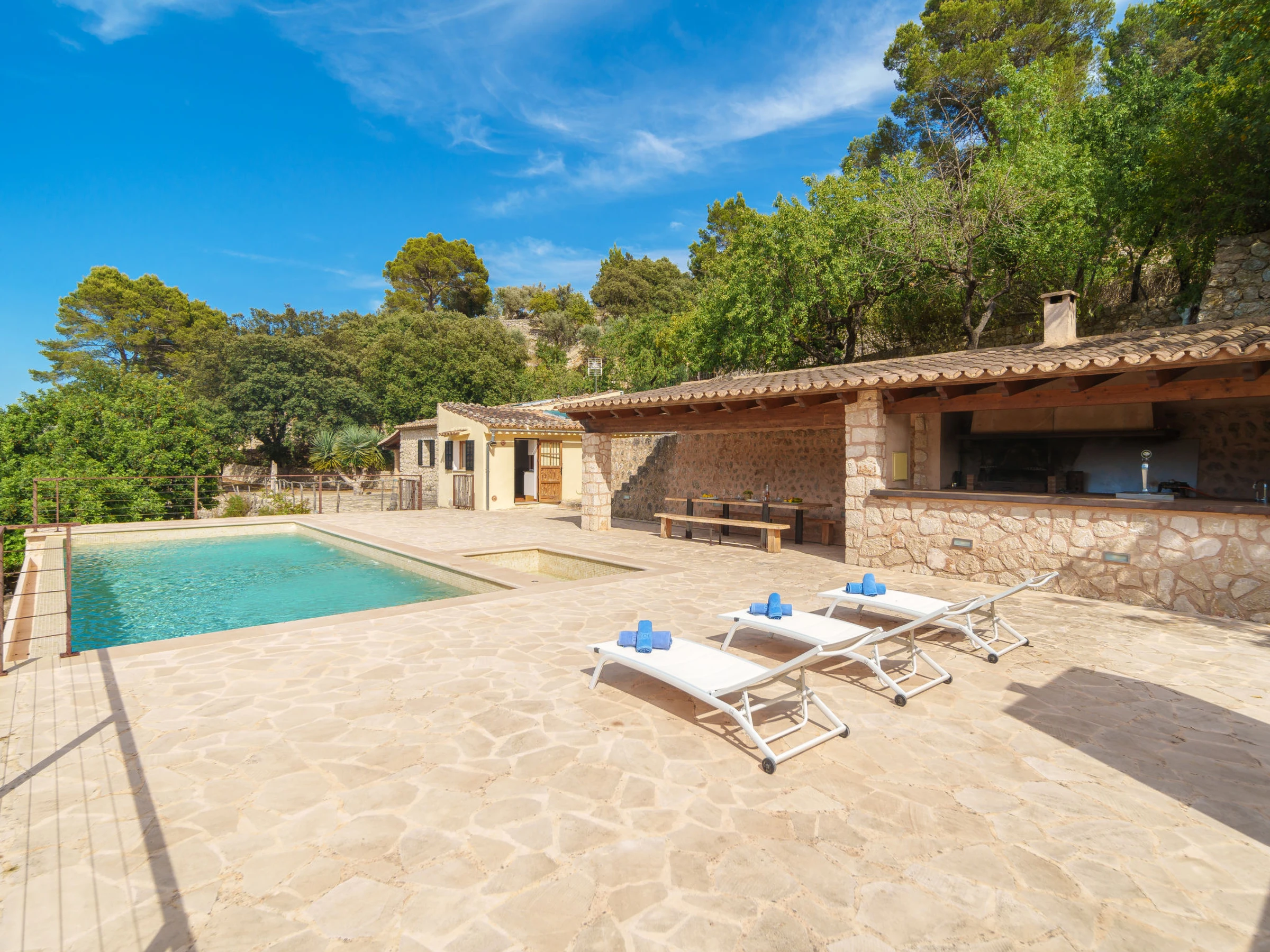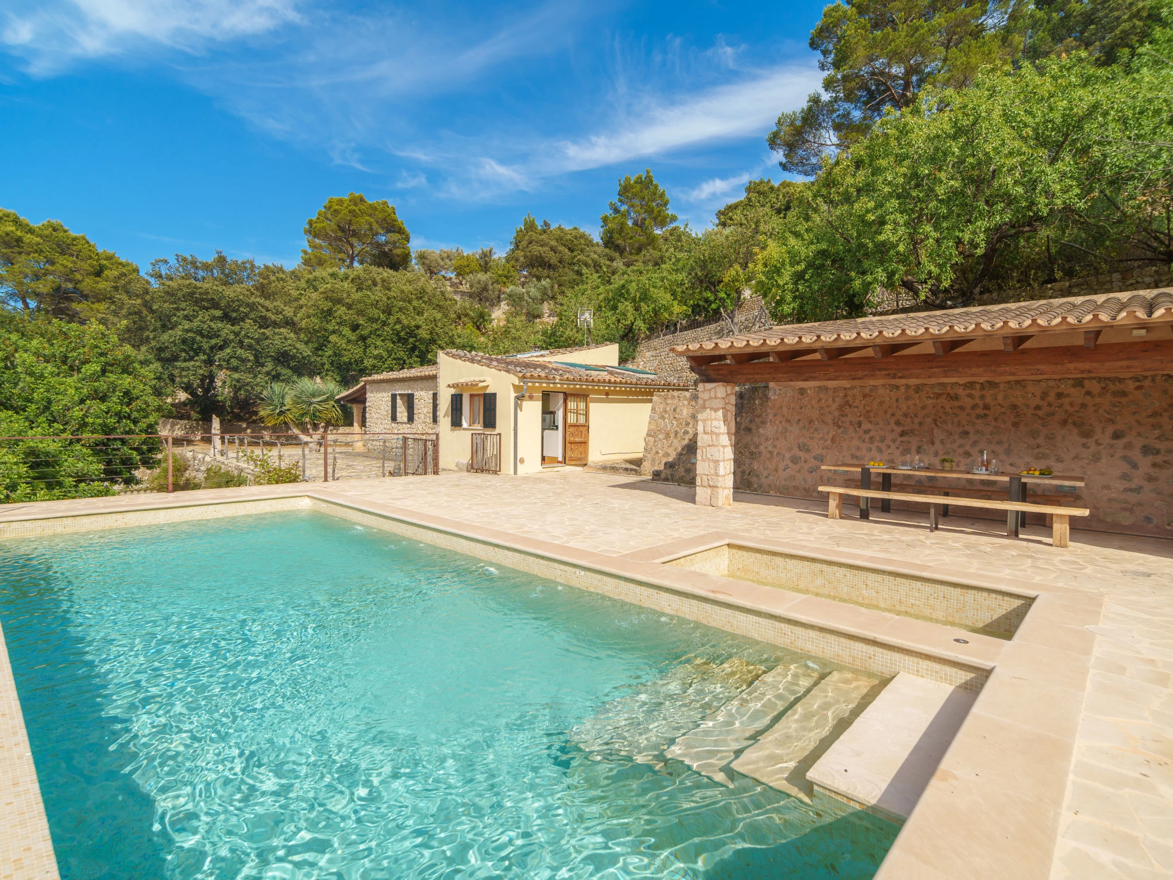 Selva: Finca "Can Garcia", muy bonita, confortable, reformada en 2026, rodeada de árboles, prados y campos. En las afueras de la localidad Selva, lugar tranquilo, soleado en una colina, a 50 m de un bosque, a 25 km del mar, a 25 km de la playa, en un bosque. Privado: terreno en estado natural (vallada) con árboles, pradera, piscina rectangular (10 x 4 m, 150 - 160 cm de profundidad, Disponible por temporada: [hidden] - [hidden] con sistema de limpieza por electrolysis de sal. Ducha exterior, cenador, porche, terraza, muebles de jardín, caseta de barbacoa, mantenimiento de la piscina a través del propietario/jardinero. En el inmueble: acceso a internet, Wifi, calefacción central, aire acondicionado, lavadora. Acceso (camino de tierra). Aparcamiento junto a la casa. Tienda de comestibles, supermercado, restaurante 700 m, bar, panadería, café, bar al aire libre 900 m, a 7 minutos del centro andando, parada autobús 1 km, playa de arena 27 km playa de gravilla 27 km, playa de piedras 27 km, playa rocosa 27 km. Puerto deportivo 27 km, puerto para yates 27 km, campo de golf (18 hoyos) 28 km, escuela de surf 27 m, escuela de vela 33 km, tenis 1 km, centro ecuestre 4 km, polideportivo 1 km, caminos para bicicletas 200 m. A tener en cuenta: coche recomendable. Adecuado para familias, adecuado para la tercera edad. Vivienda adecuada para 4 adultos. El propietario no acepta grupos de adolescentes/jóvenes.