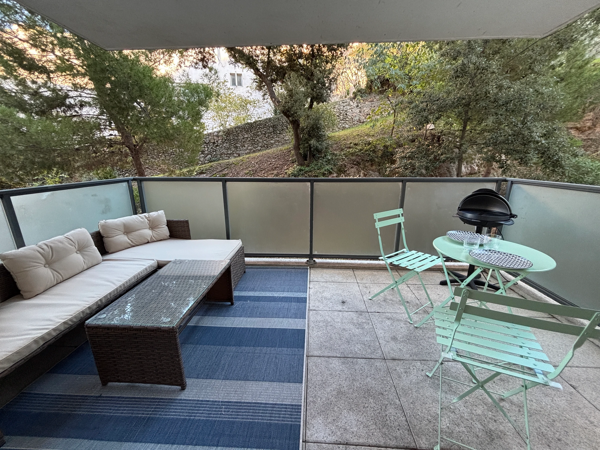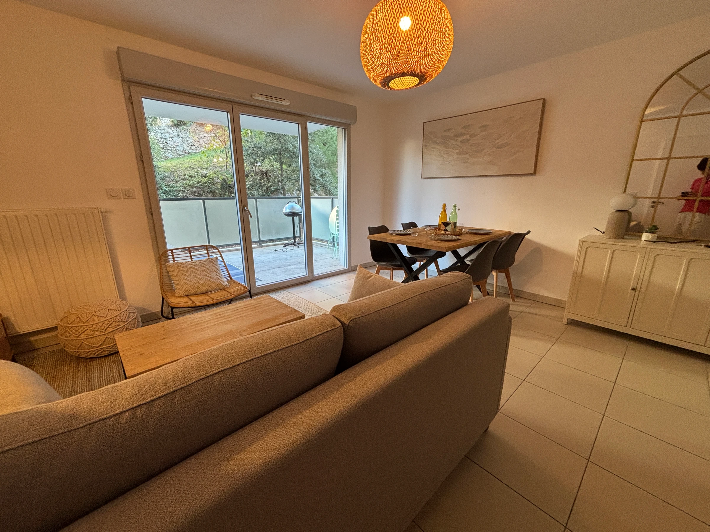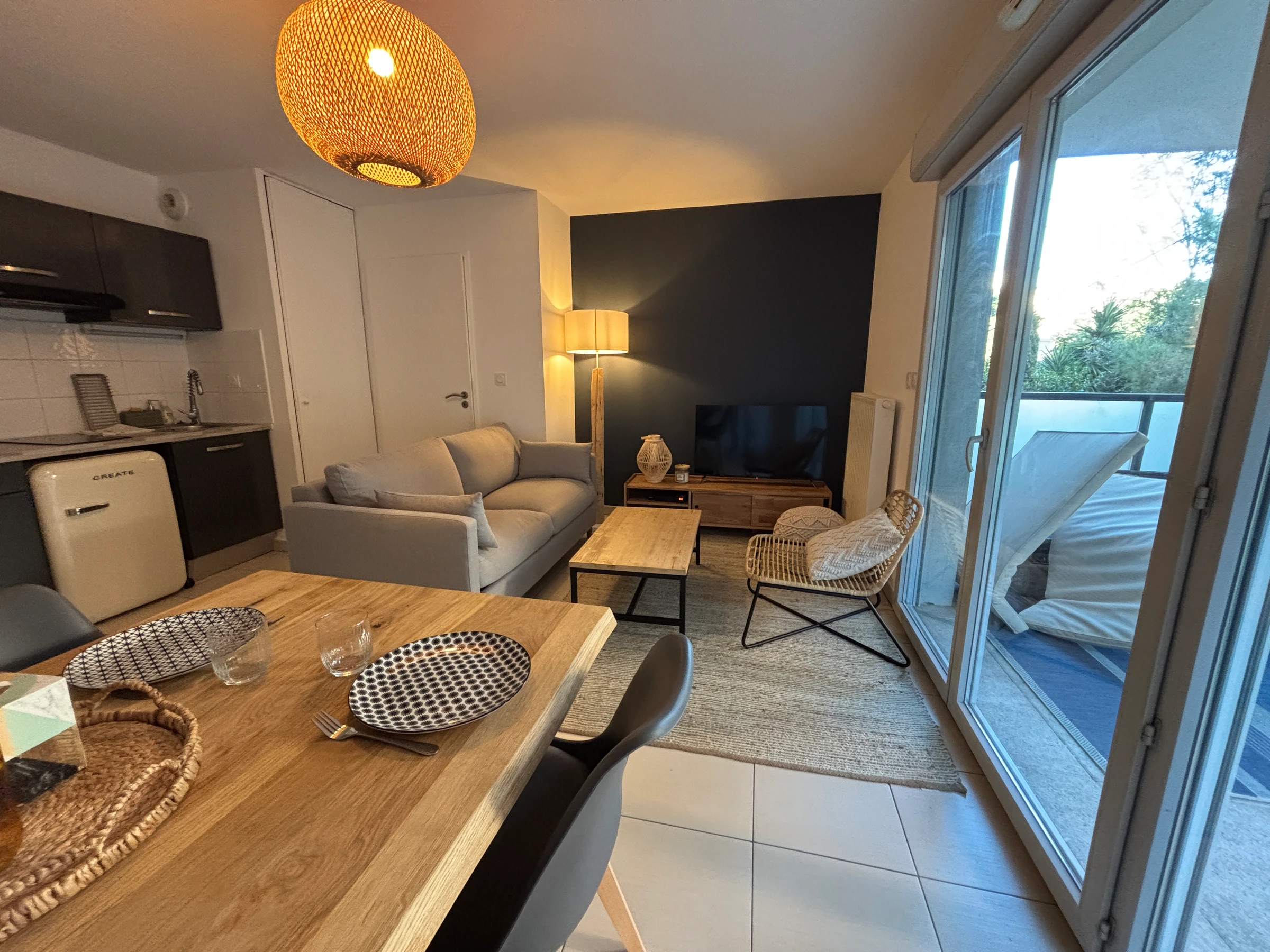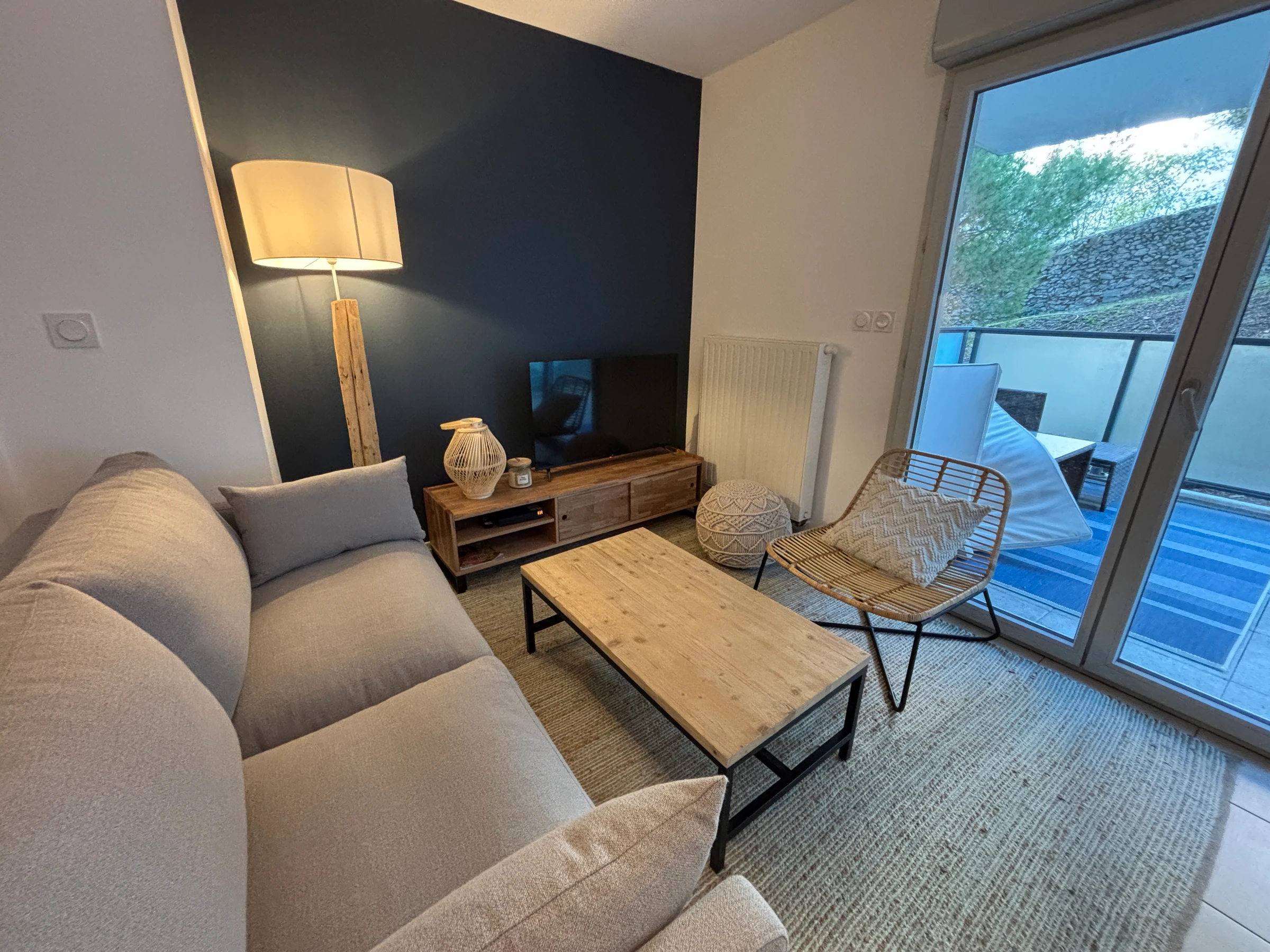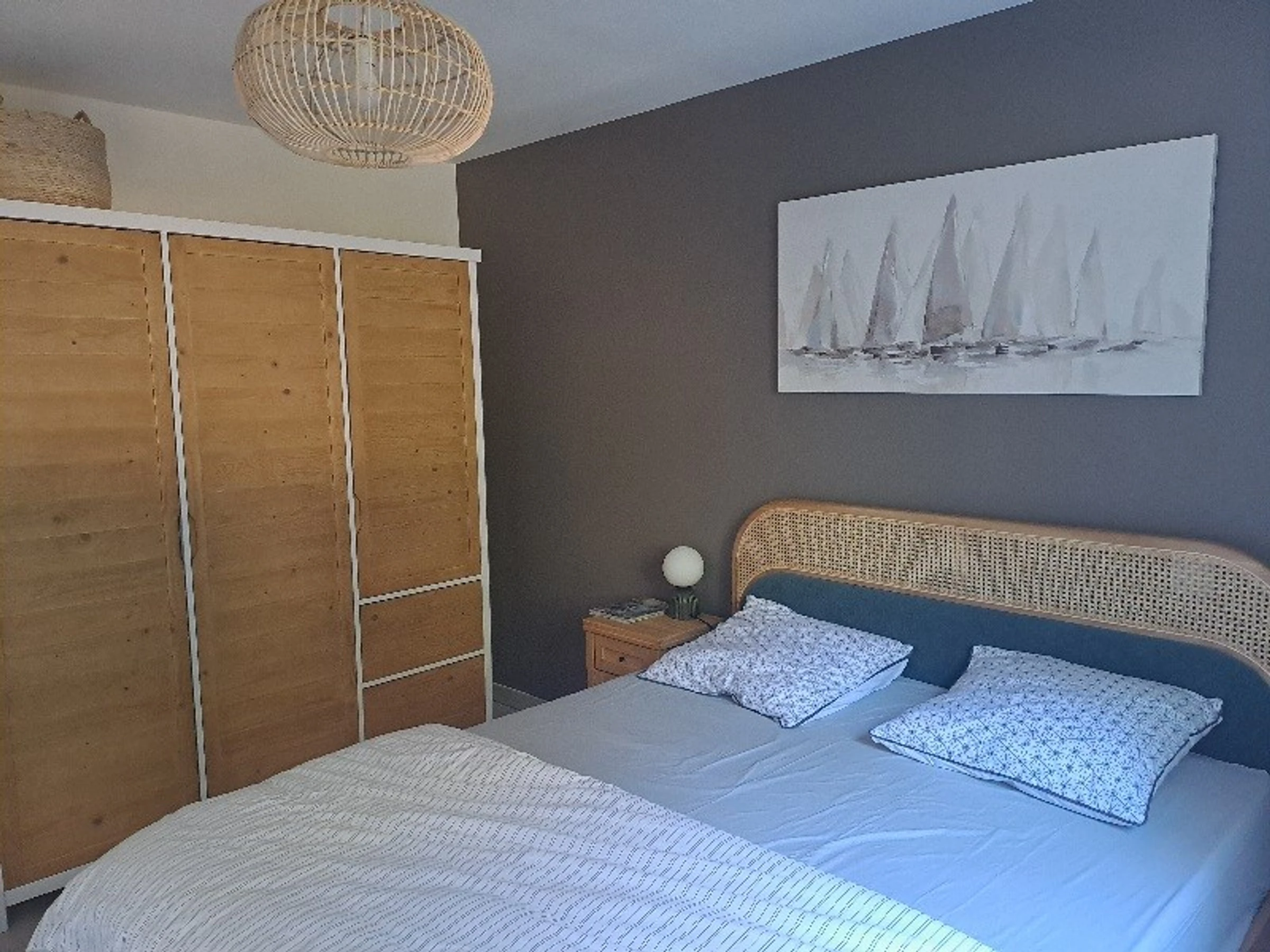 Alquiler de vacaciones en Sète: Amplio apartamento de dos habitaciones de 39 m², en el segundo piso (con ascensor) en una residencia reciente en el barrio de Crois de Marcenac con una terraza de 9 m². A 3 km de la playa y 300 m de comercios. En el dormitorio de 10m2 dispondrás de una cama de 160 y un amplio armario. El salón está compuesto por un sofá cama para 2 personas, mesa, sillas, almacenaje y televisión y Wifi. El baño (lavabo, ducha, inodoro). La cocina está equipada con 2 placas vitrocerámicas, frigorífico, microondas, campana extractora y lavadora. Aparcamiento en sótano -1 incluido n°114. No se permiten mascotas. Posible llegada tardía: 50 € (contáctenos para más detalles).