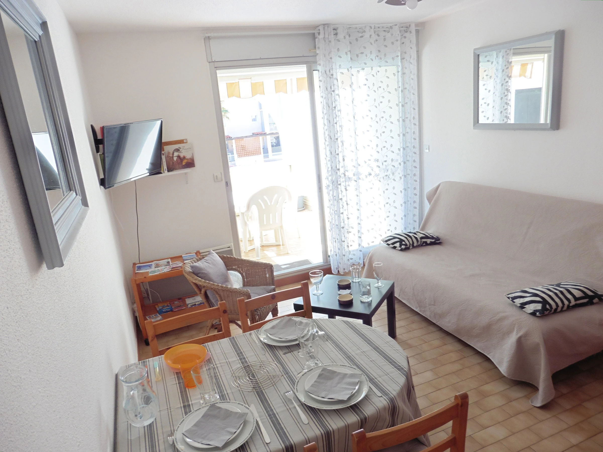 Alquiler vacacional en Sète: Precioso apartamento de 2 habitaciones de 31 m² con terraza de 13 m² con toldo. Se encuentra en la 1.ª planta (sin ascensor) y ofrece unas preciosas vistas al puerto deportivo. Las playas están a 200 m y los comercios a 100 m. El salón consta de una cocina (con vitrocerámica, frigorífico, cafetera, horno y microondas) y una sala de estar con un sofá cama doble, mesa, 4 sillas, televisor de pared, un sillón, un dormitorio (con cama doble y estanterías), un baño con lavadora, ducha y WC independiente. Terraza de 13 m² con mesa y sillas de jardín. Plaza de aparcamiento n.º 87. Wi-Fi gratuito incluido. No se admiten mascotas. Entrada tardía posible: 50 € (consúltenos para más información).