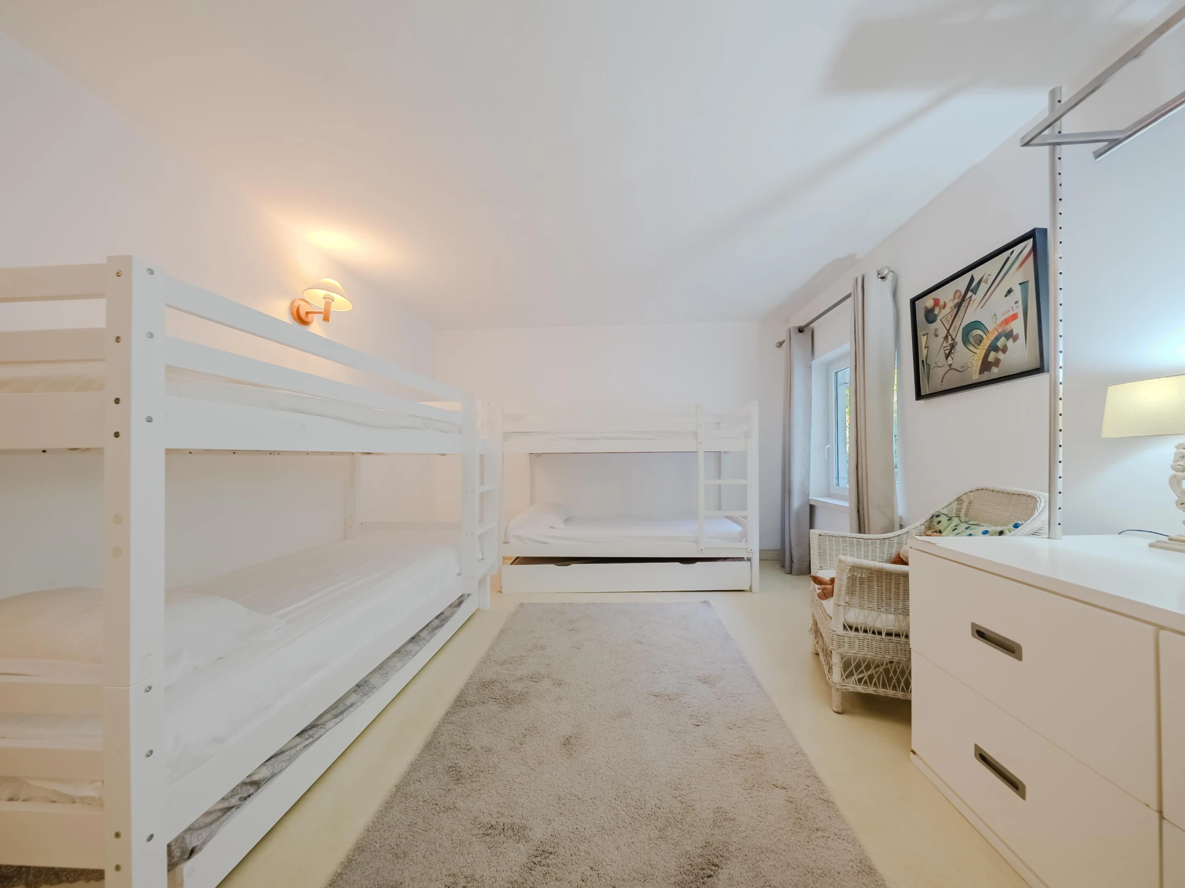 1 habitación con 1 cama individual de 0.90 m x 1.90 m; 1 litera con cajonera de 0.90 m x 1.90 m para 3 niños