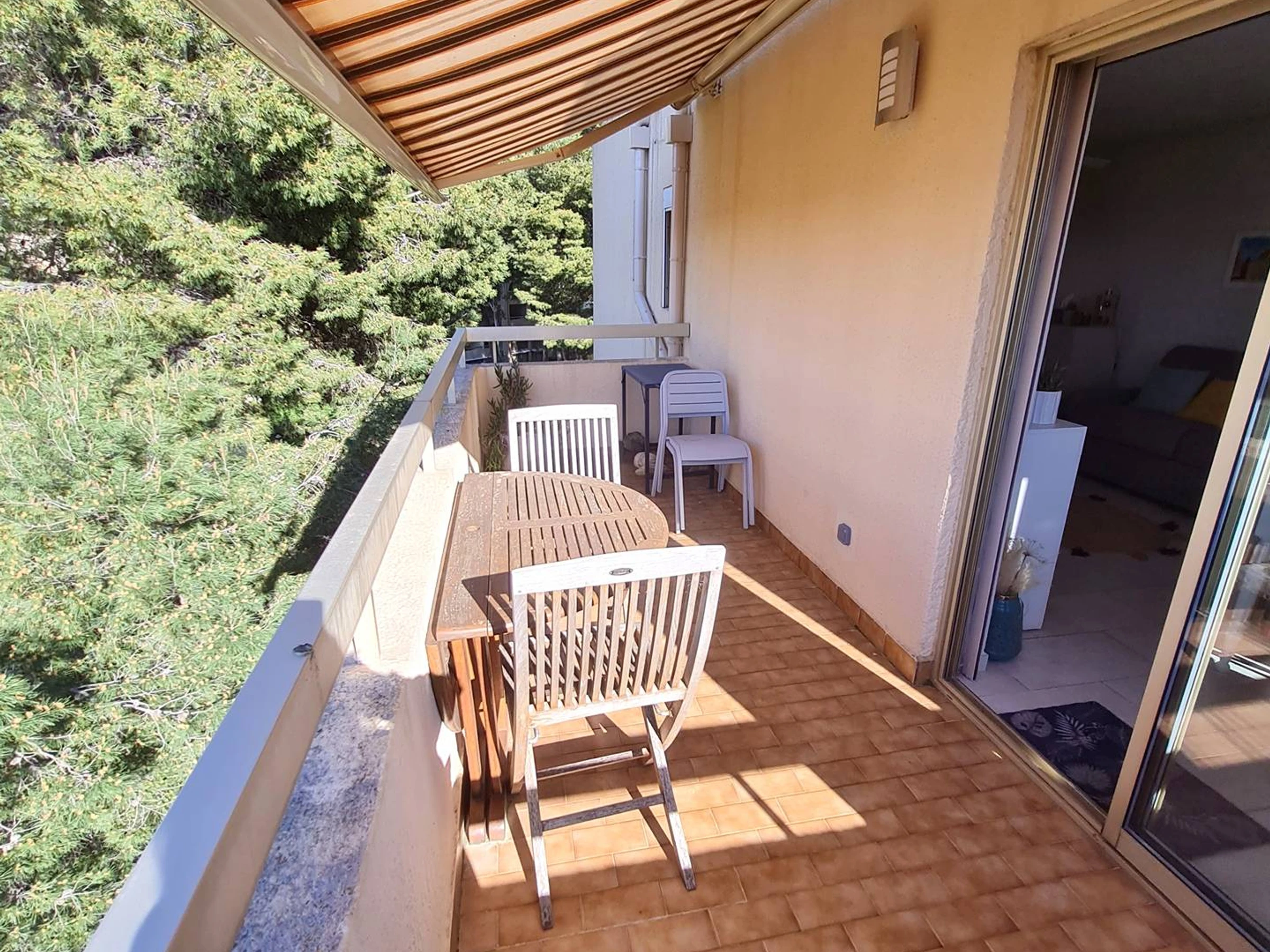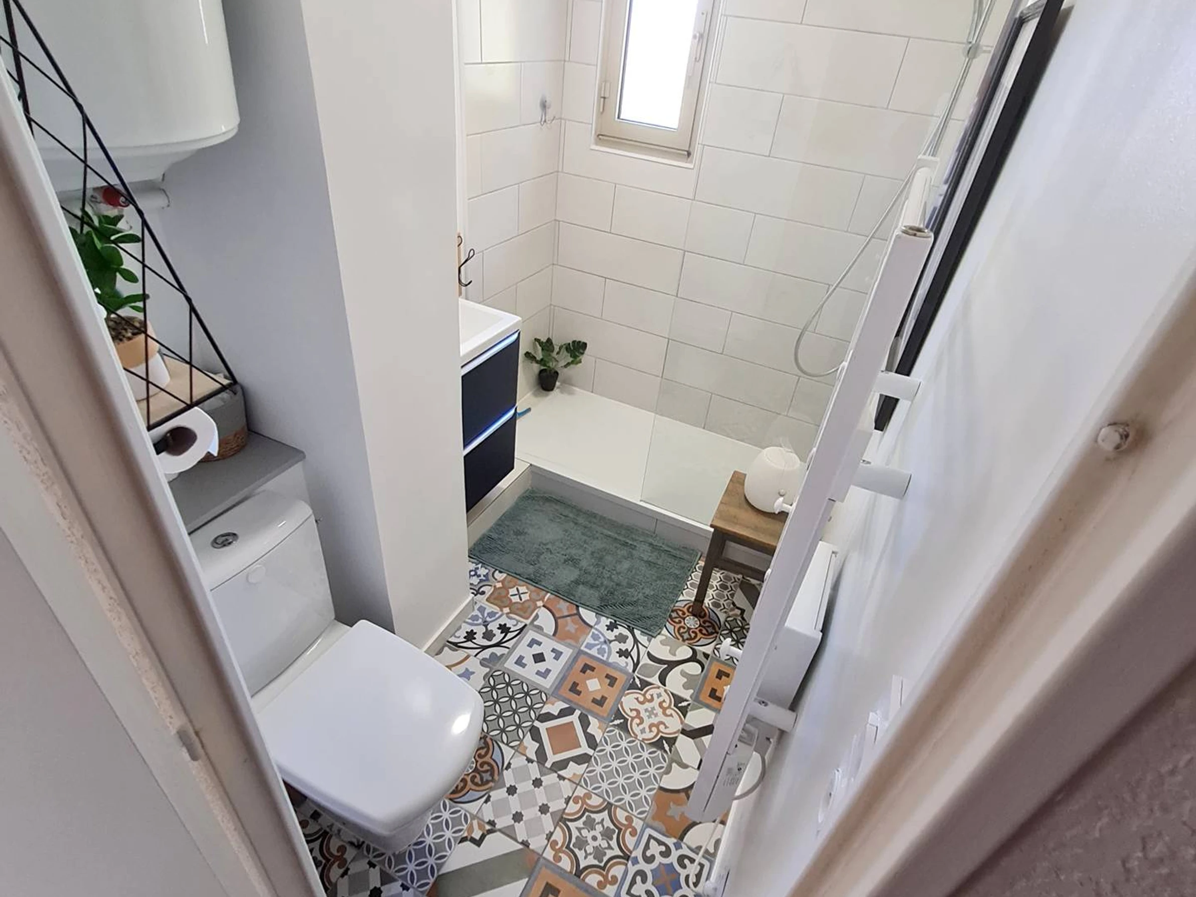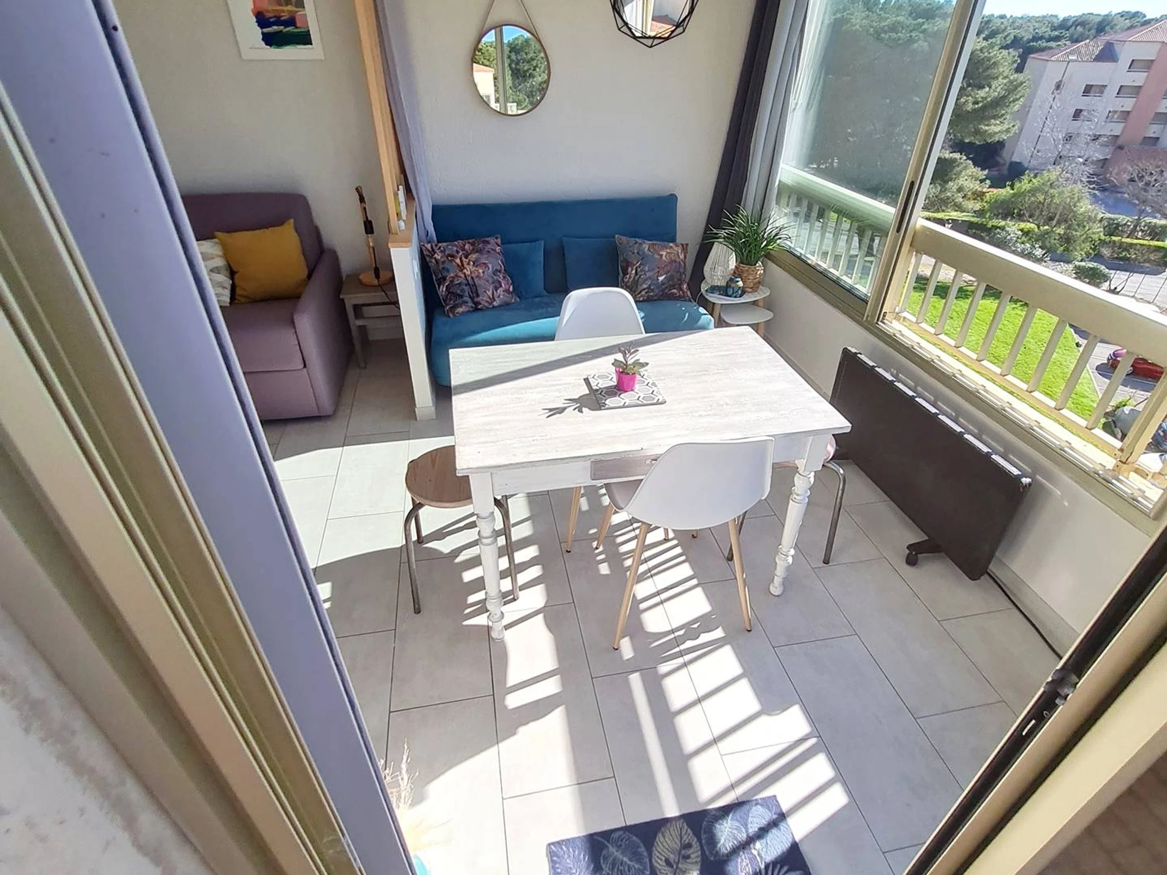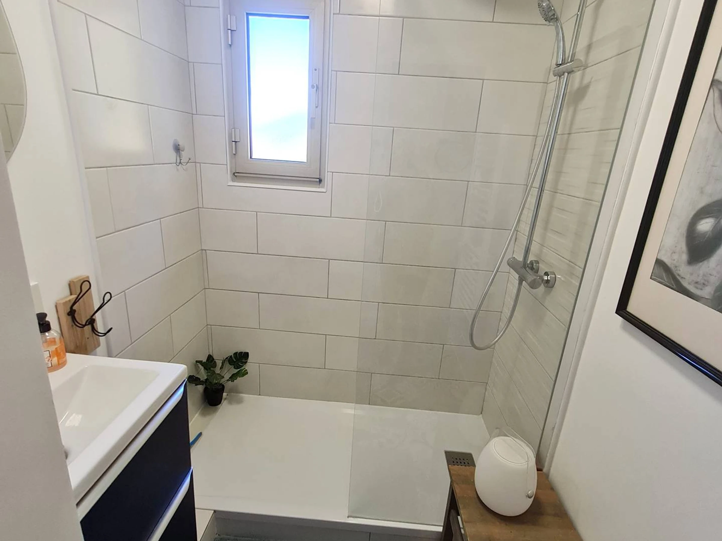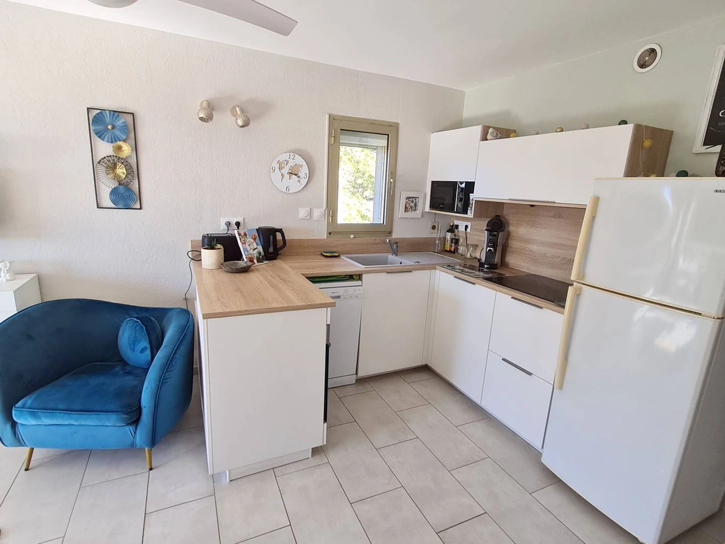 Terraza descubierta (9 m²) orientada al norte con dos pequeñas vistas al mar, toldo exterior, persiana eléctrica, mesa de jardín, 4 sillas y 2 tumbonas. La cocina está abierta al salón (frigorífico/congelador, placa de 3 fuegos, lavavajillas, lavadora, horno, microondas, cafetera Senseo, hervidor de agua, tostadora y plancha). La habitación principal cuenta con un sofá cama doble (colchón nuevo de 140 x 18 cm), televisor, ventilador de techo, zona de relax con sofá, comedor, toldo y cortinas opacas. El dormitorio tiene una cama doble (colchón nuevo de 140 cm), cómoda y persiana eléctrica. El baño cuenta con ducha a ras de suelo, asiento de ducha, secador de pelo, toallero calefactado e inodoro integrado.