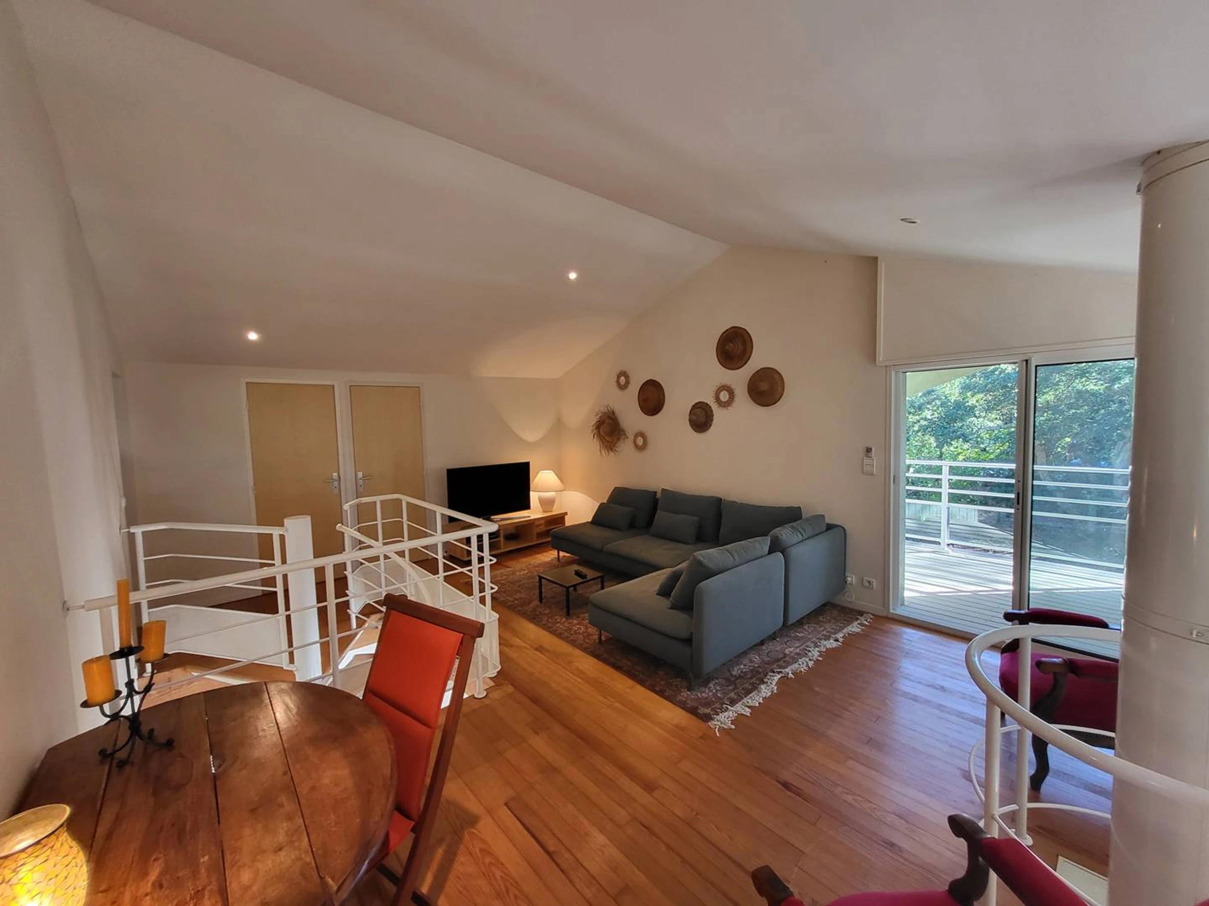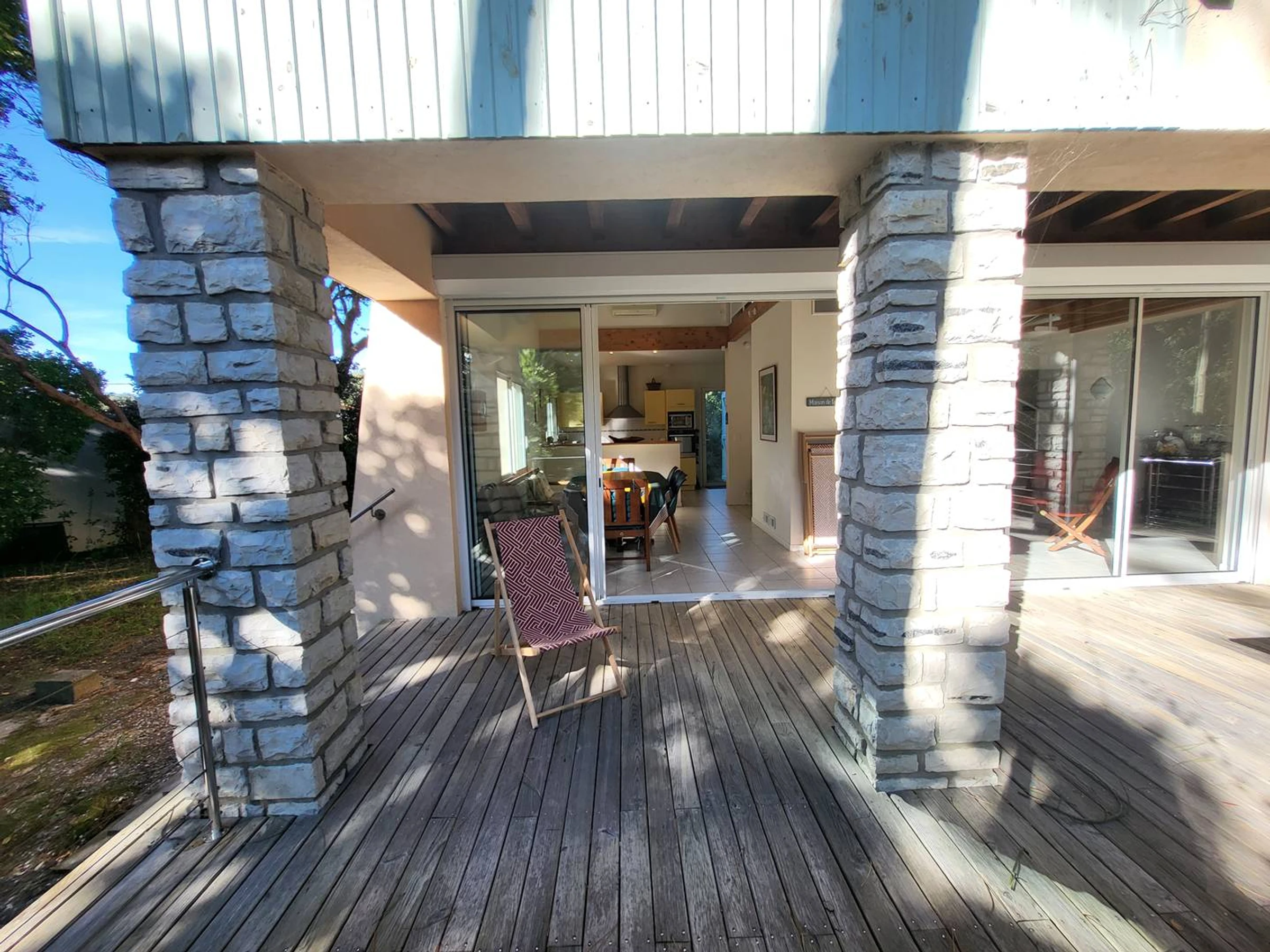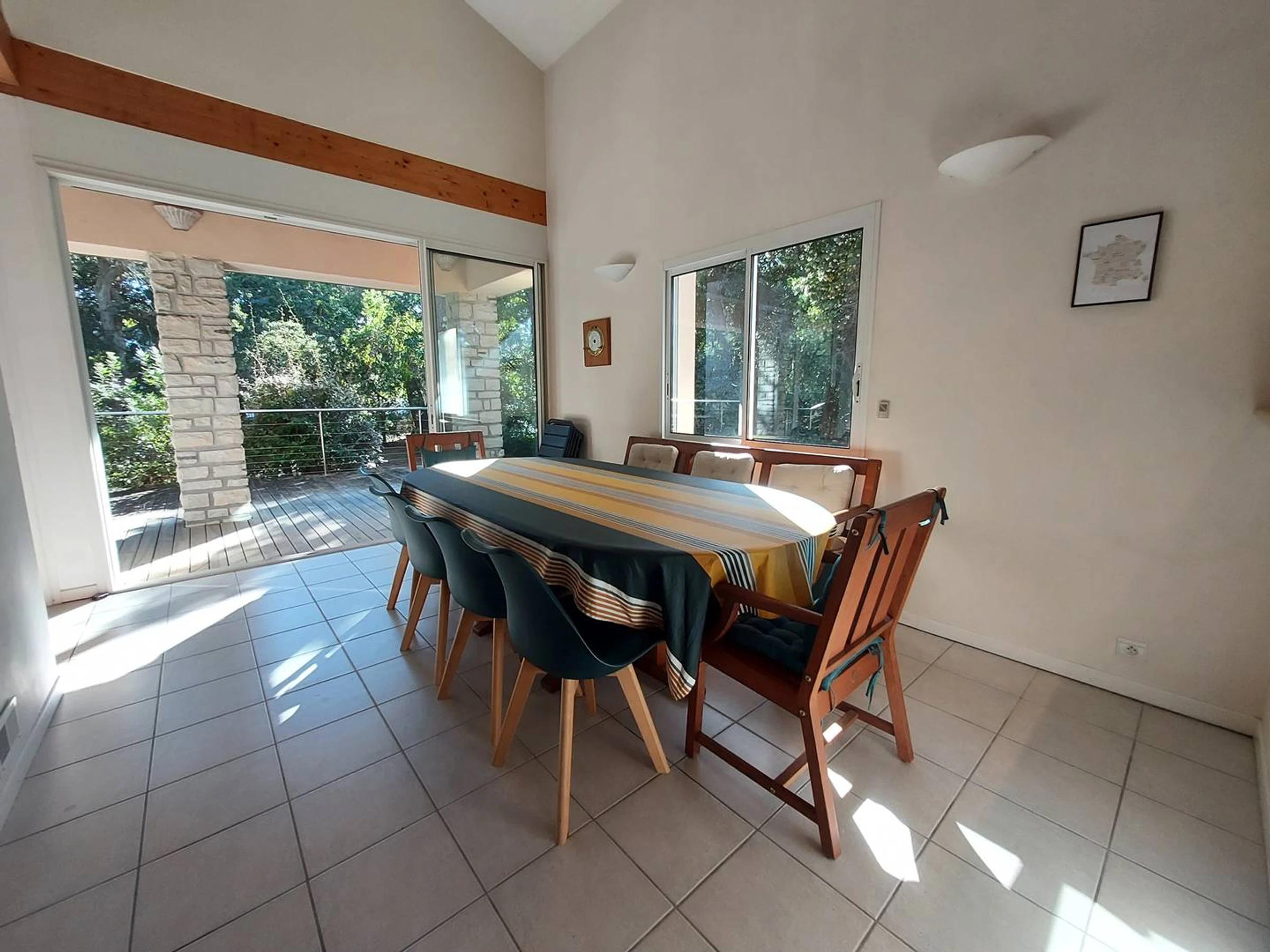 La estancia principal, que combina comedor y sala de estar, se abre a través de grandes puertas francesas a una espaciosa terraza de madera orientada al sur con vistas al jardín. Este agradable entorno invita a disfrutar de comidas o cenas al aire libre bajo el sol de las Landas.