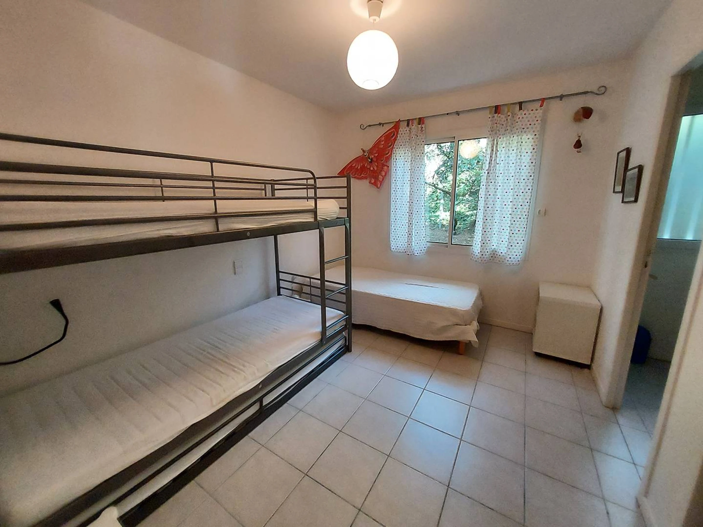 Dormitorio 2 (para niños): equipado con un armario, una cama individual (90 cm) y dos literas. También cuenta con un baño en suite conectado al baño del dormitorio 1.
