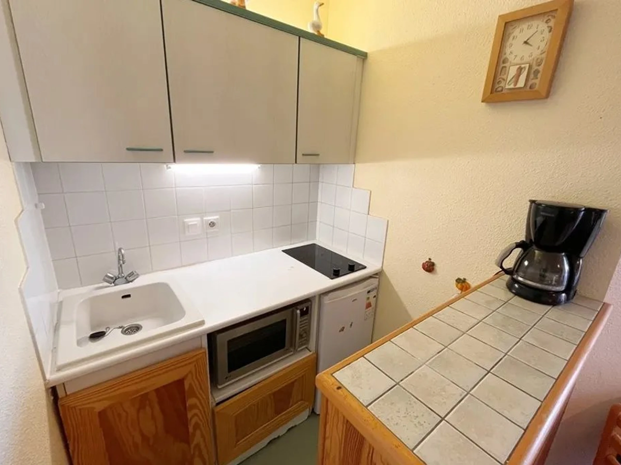 La cocina americana está equipada con vitrocerámica de dos fuegos, microondas y un pequeño frigorífico.