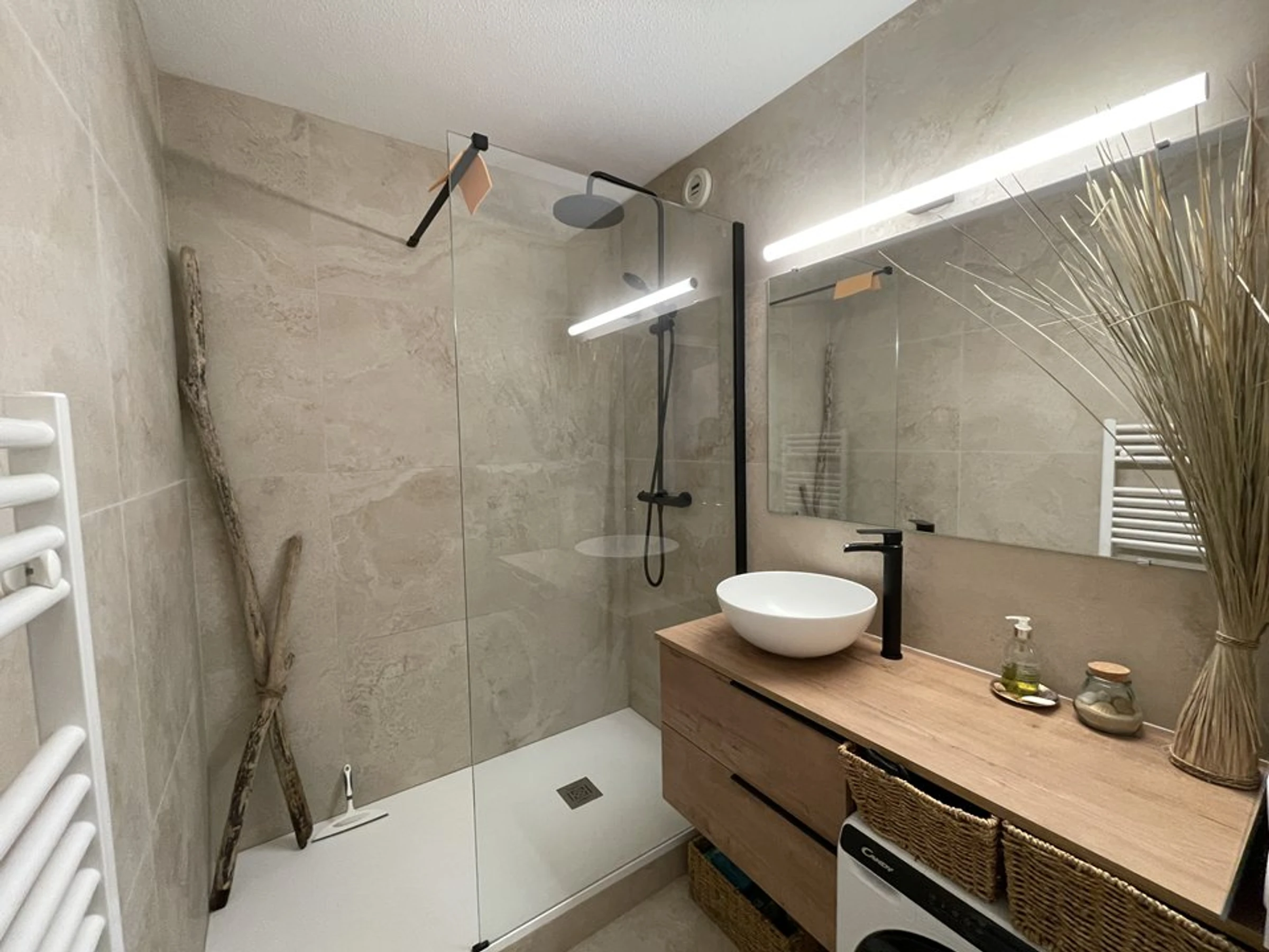 - Baño con ducha a ras de suelo, lavabo y lavadora
