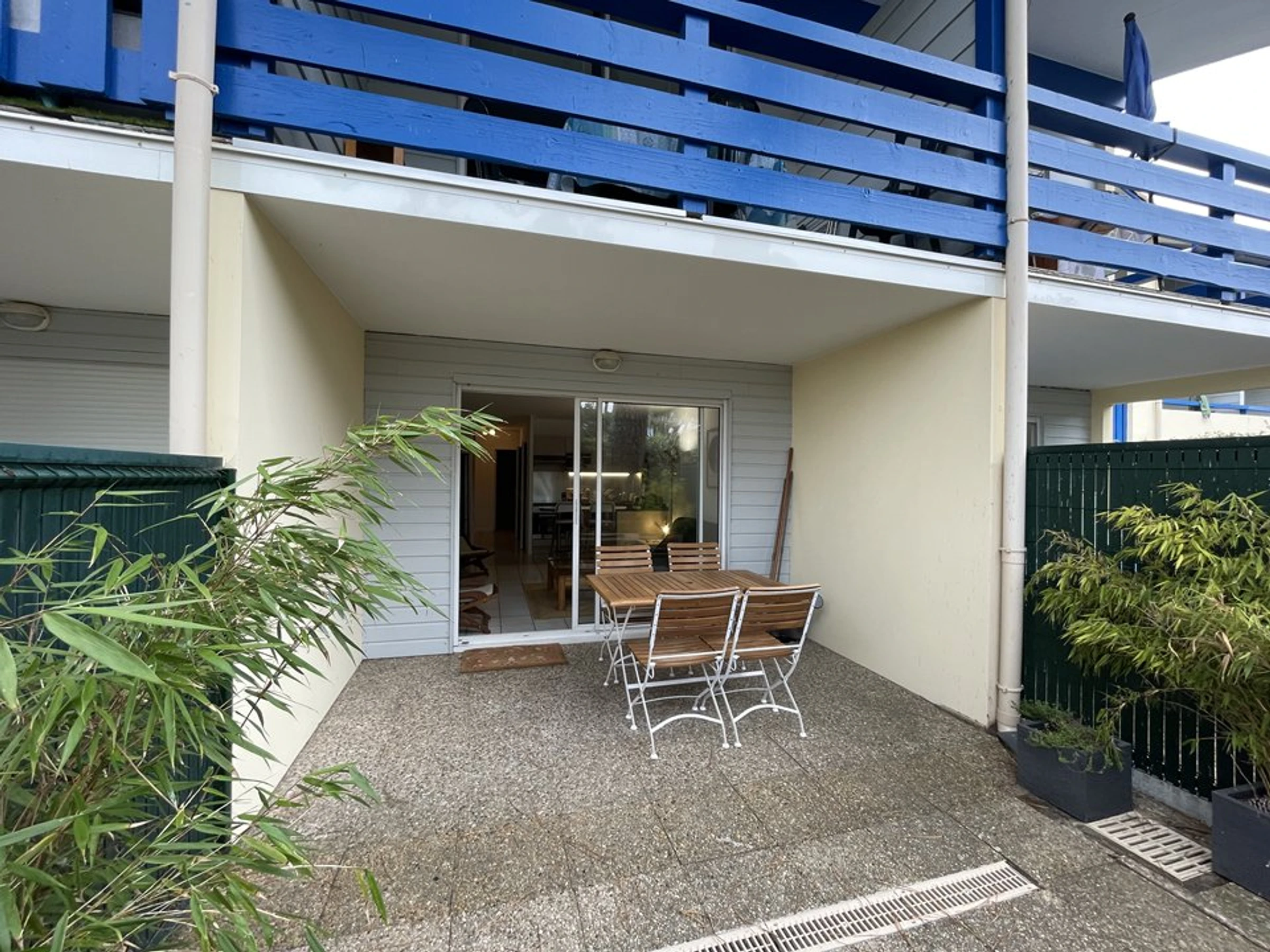 Terraza y pequeño jardín con mobiliario de jardín y tumbonas.