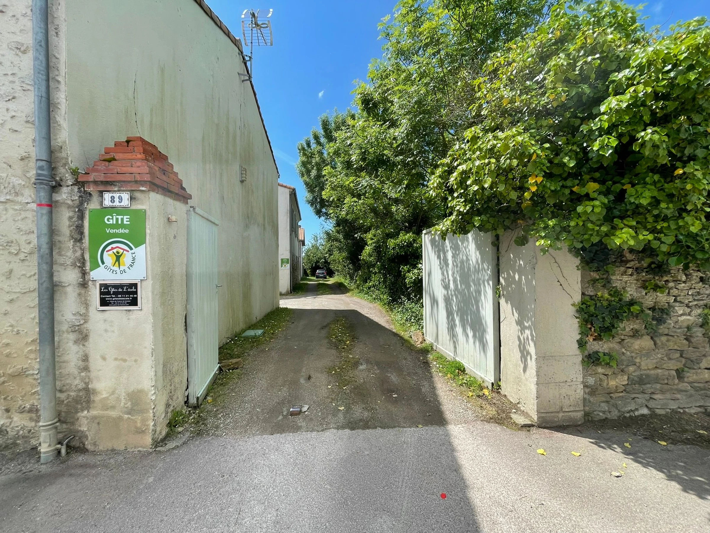 Desde La Roche-sur-Yon, siga las indicaciones hacia La Tranche-sur-Mer y tome la salida Nieul-le-Dolent. Al llegar a Talmont-Saint-Hilaire, en la rotonda (donde se encuentra la cantera), gire a la izquierda, siga recto y tome la primera a la izquierda en la Rue du Chai (dirección Jard-sur-Mer). Deténgase en la primera puerta grande a la derecha. Se trata de una gran casa de campo de piedra con contraventanas verde claro; entre al patio.