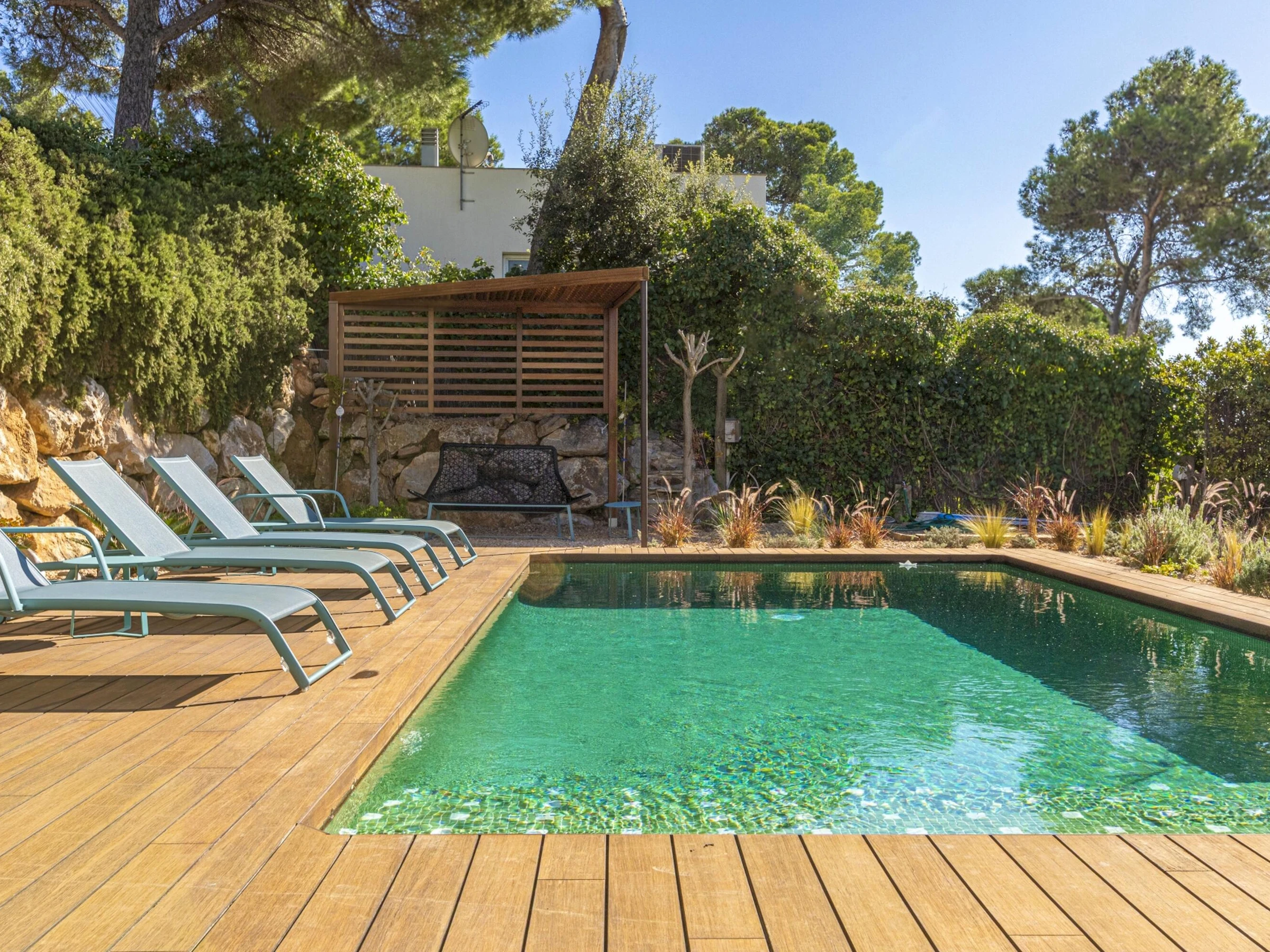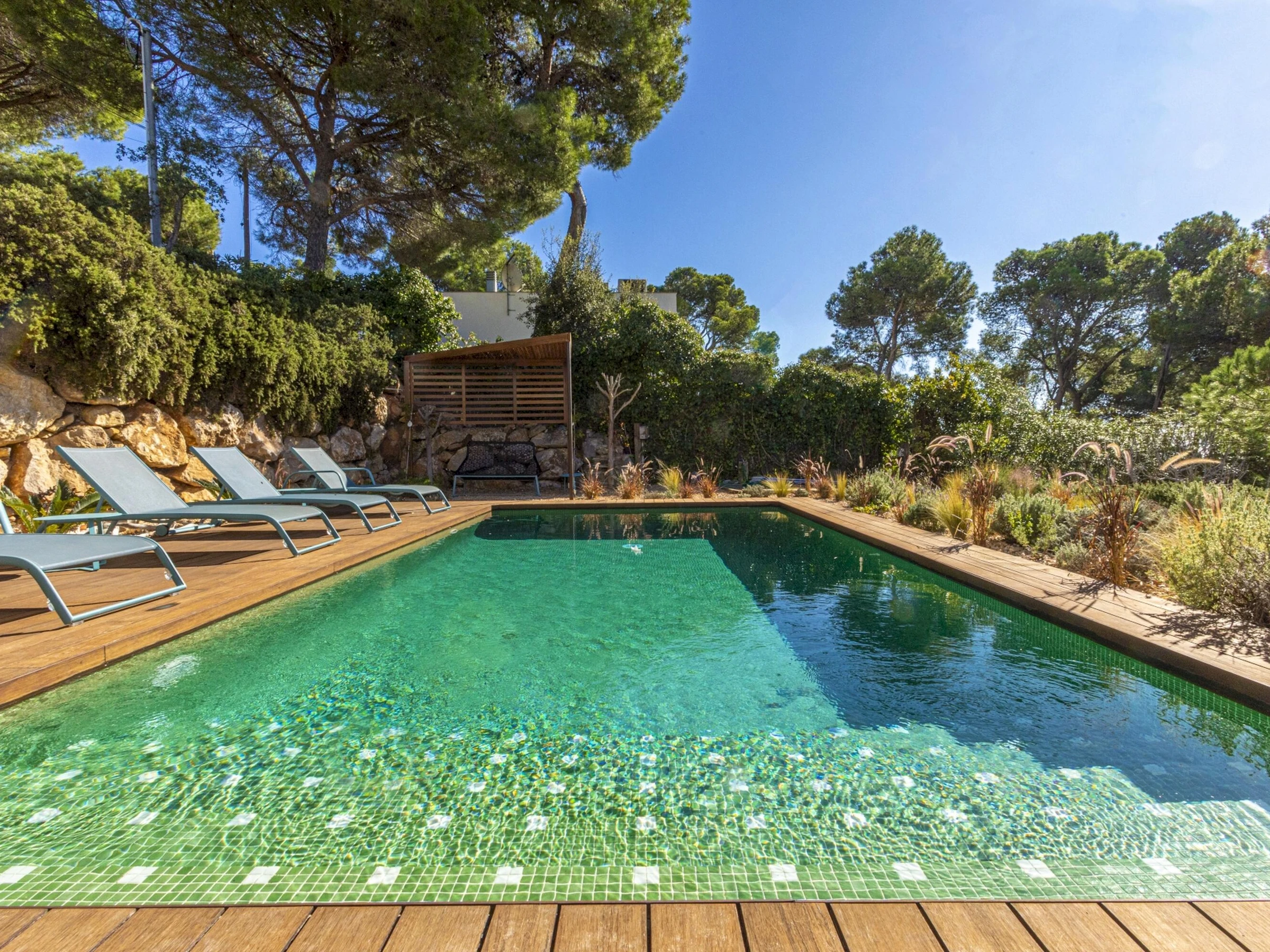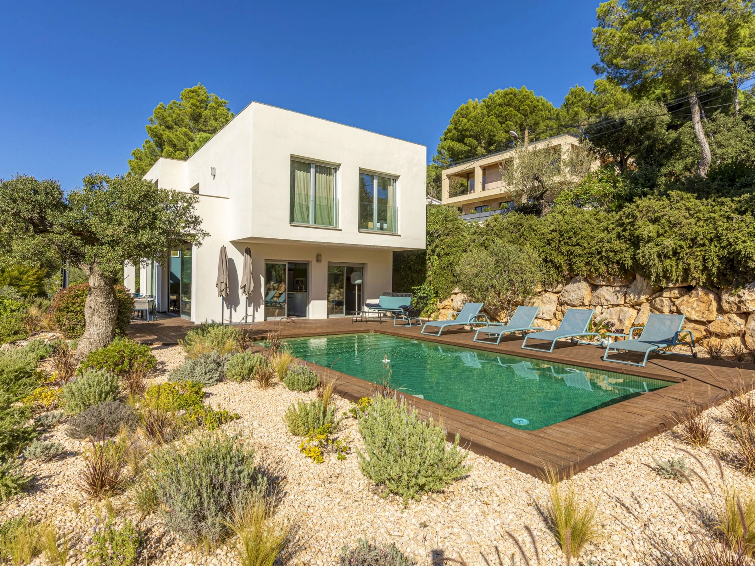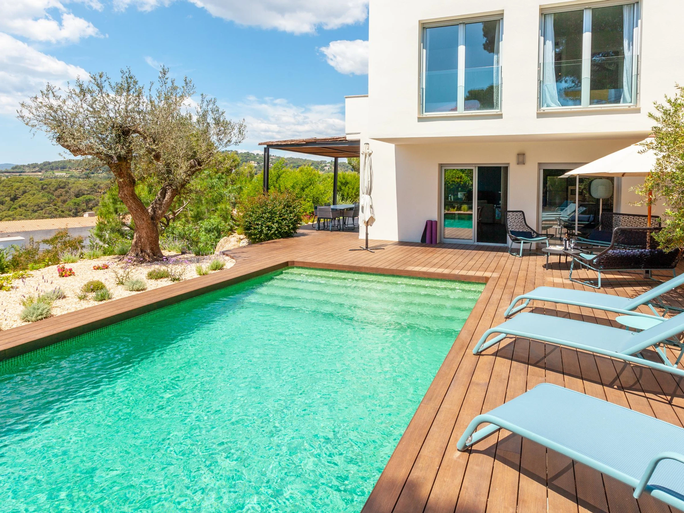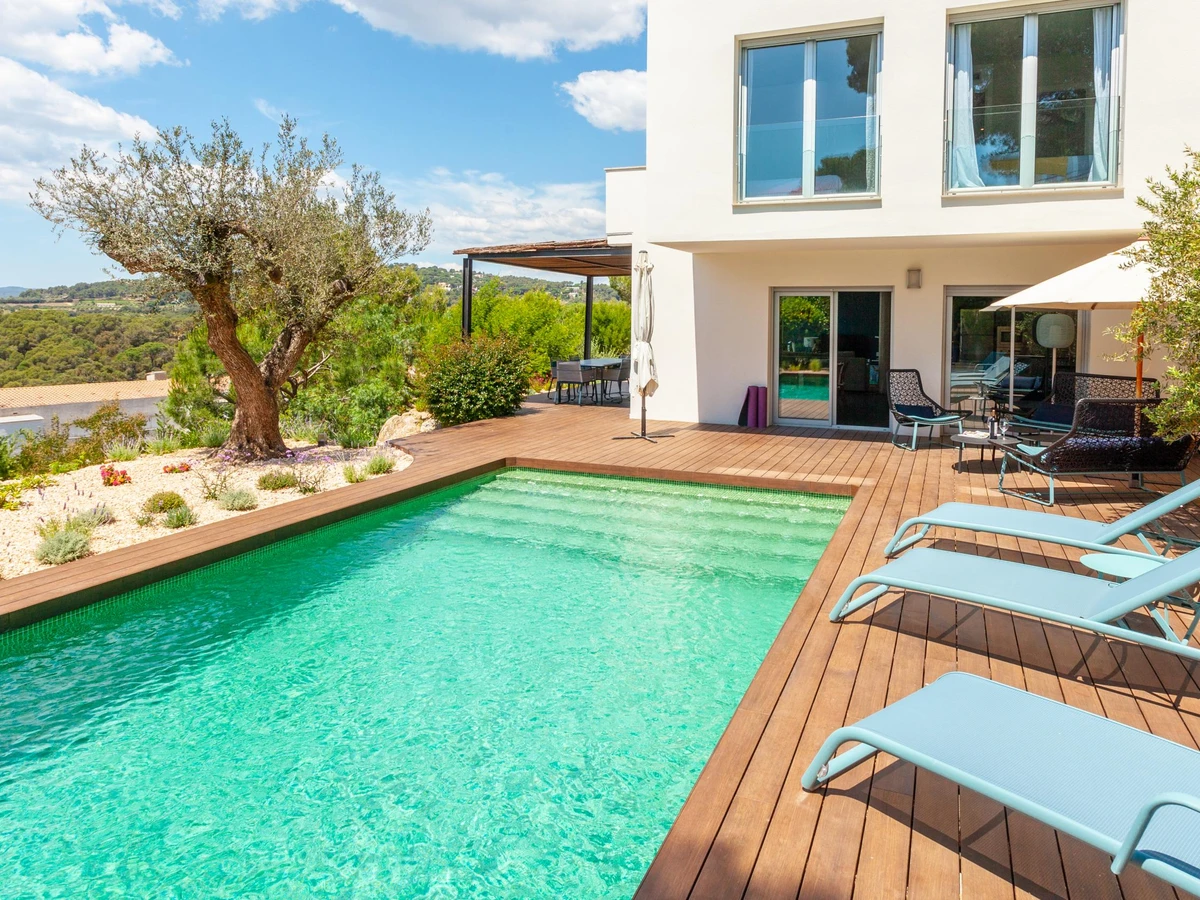 Villa Exmora en Tamariu -Piscina Privada, Jardín Mediterráneo y Diseño Moderno Ubicada en la exclusiva zona residencial de Aigua Gelida, a tan solo 1 km de la playa de Tamariu, esta villa moderna y luminosa ofrece una experiencia única de tranquilidad, naturaleza y confort en la Costa Brava. Orientada al sur y diseñada con grandes ventanales de doble altura, la casa disfruta de luz natural durante todo el día, creando un ambiente amplio, sereno y conectado con la naturaleza. Su arquitectura contemporánea y sus acabados de alta calidad garantizan una estancia relajada y elegante, con perfecta transición entre interior y exterior. El entorno exterior destaca por su espectacular jardín mediterráneo escalonado, piscina privada de agua salada y amplias terrazas, ideales para tomar el sol, descansar y disfrutar de cenas al aire libre con vistas verdes y total privacidad. Distribución de la vivienda Planta baja * Amplio salón-comedor con ventanas de suelo a techo * Cocina abierta totalmente equipada con isla central y sistema de osmosis * Acceso directo al jardín y piscina desde todas las estancias * Dormitorio principal con vestidor y baño en suite (ducha efecto lluvia + bañera independiente) * Acceso privado desde el dormitorio a la terraza soleada * Aseo de cortesía Planta superior * Hall de entrada * Garaje con zona de lavandería (lavadora + secadora) * 3 dormitorios dobles: * 1 dormitorio doble con terraza privada y vistas abiertas al valle * 1 dormitorio doble en suite * 1 dormitorio doble con camas individuales * 2 baños completos renovados recientemente (duchas efecto lluvia) Zona y entorno Aigua Gelida es una de las áreas más exclusivas de Tamariu, rodeada de pinos, tranquilidad y naturaleza. A pocos minutos encontrarás: * Cala Aigua Gelida y playa de Tamariu * Calas como Aiguablava y Llafranc * Senderos del Camí de Ronda * Actividades náuticas, buceo y rutas de senderismo * Pueblos con encanto: Begur, Calella de Palafrugell, Pals Un lugar ideal para quienes buscan privacidad, naturaleza y mar en uno de los enclaves más deseados del Empordà. Información adicional * Capacidad: 8 personas * Habitaciones: 4 * Baños: 4 * Parcela: 1.100 m² * Piscina: Privada (agua salada) * Vistas: Naturaleza / valle * Garaje y aparcamiento privado * Ubicación: Tamariu — Aigua Gelida * Licencia turística: [hidden] Condiciones * Estancia mínima: 3 noches * Suplemento limpieza: 100 € en estancias inferiores a 1 semana (no incluido en el precio)