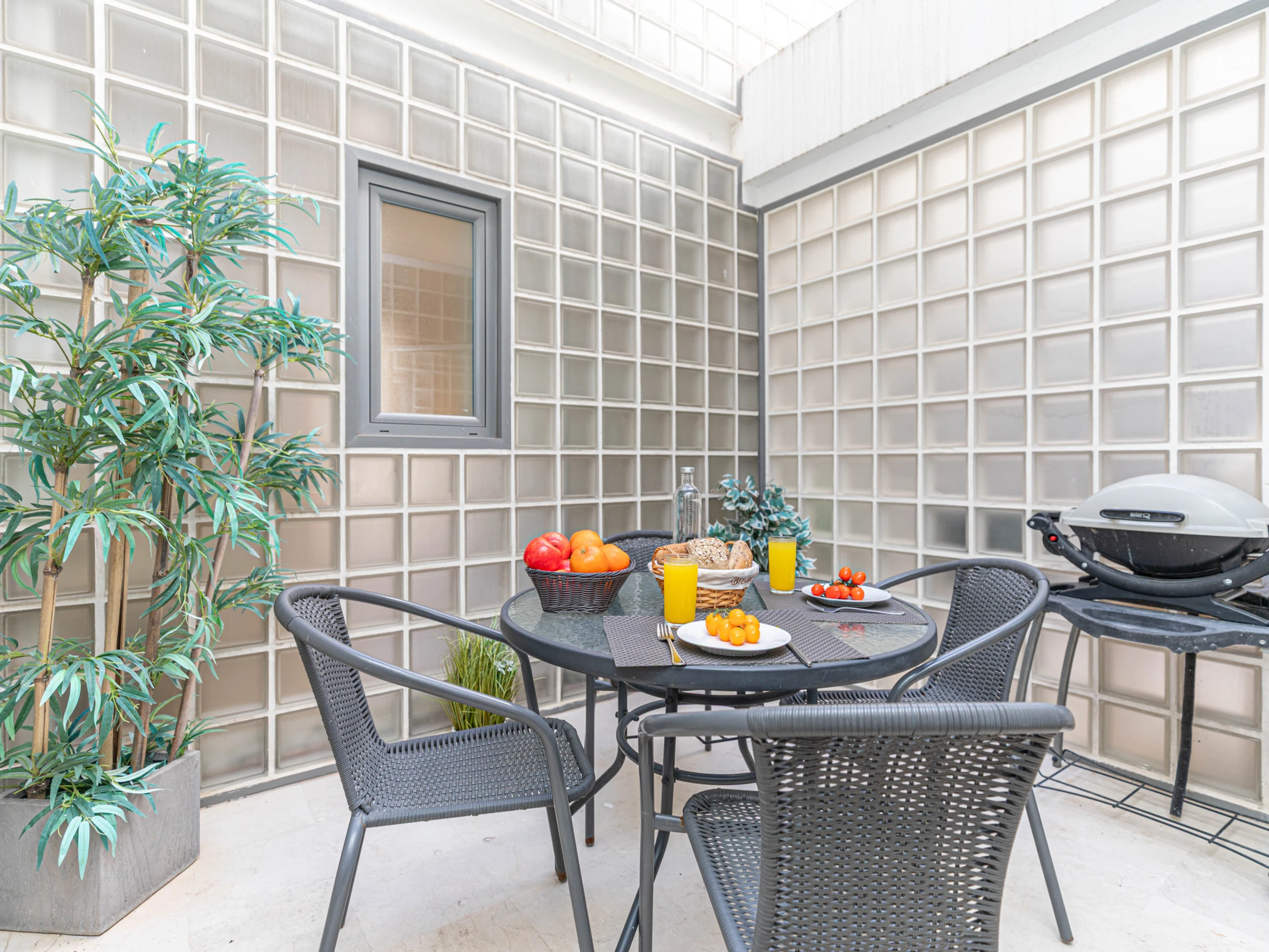 El apartamento Polka ofrece un interior acogedor y cálido, perfecto para una estancia cómoda. La distribución de un solo nivel fluye sin esfuerzo de adelante hacia atrás, creando una atmósfera abierta e invitadora. Los huéspedes entran en una zona de estar y comedor con asientos mullidos y elegantes muebles de roble, incluyendo una mesa de comedor rectangular y sillas. Una partición de vidrio separa la zona de estar de una cocina completamente equipada, con utensilios y electrodomésticos para facilitar la cocina en casa. Desde la cocina, una puerta se abre a un atrio interno privado amueblado con una mesa y sillas, perfecto para disfrutar de un desayuno tranquilo o una cena relajada. El apartamento cuenta con dos dormitorios: una habitación principal doble con un cuarto de ducha privado y una habitación con dos camas que comparte un baño con bañera y ducha superior.
