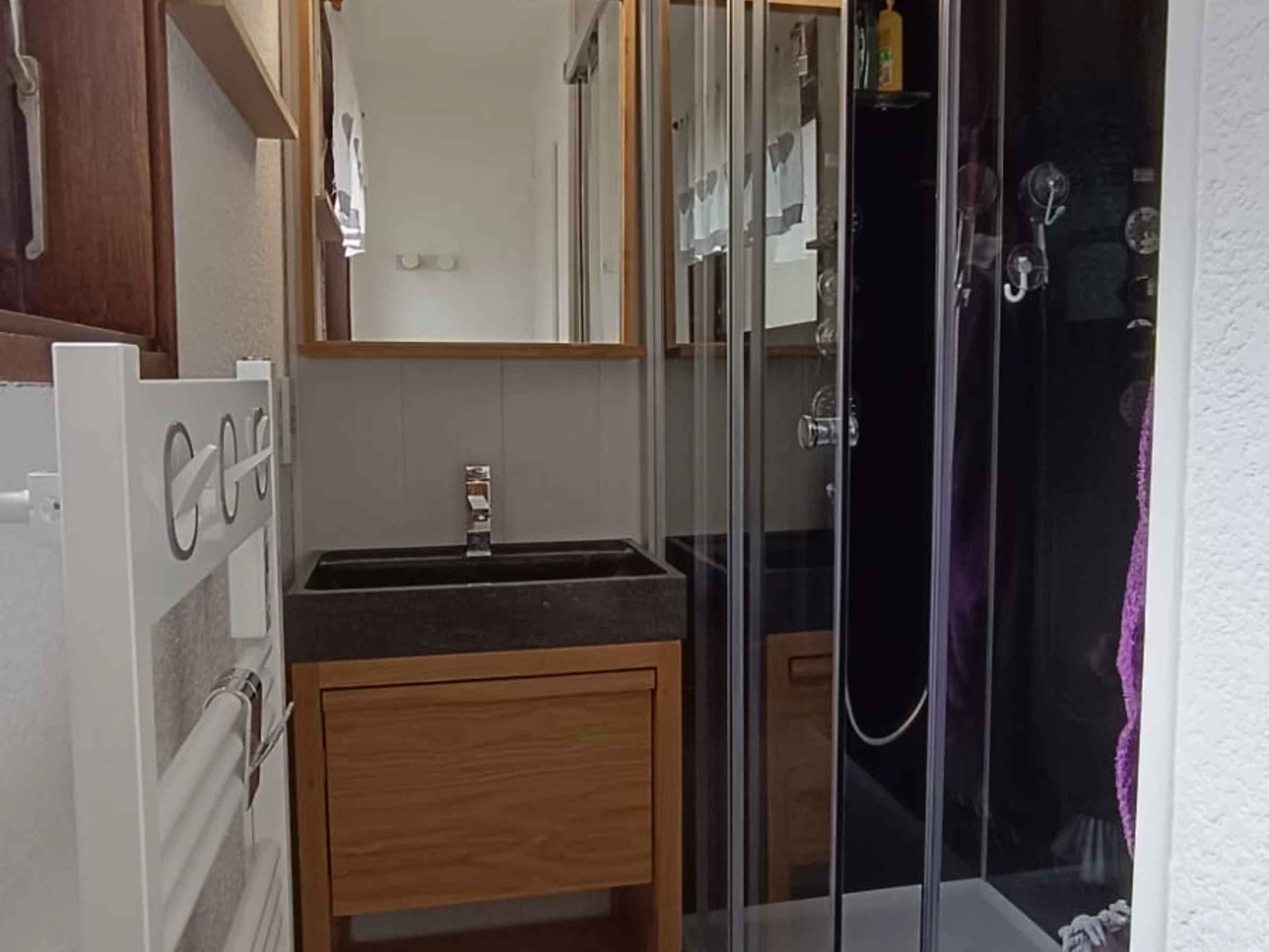 Hay una ducha y una lavadora disponibles, el baño no está separado.