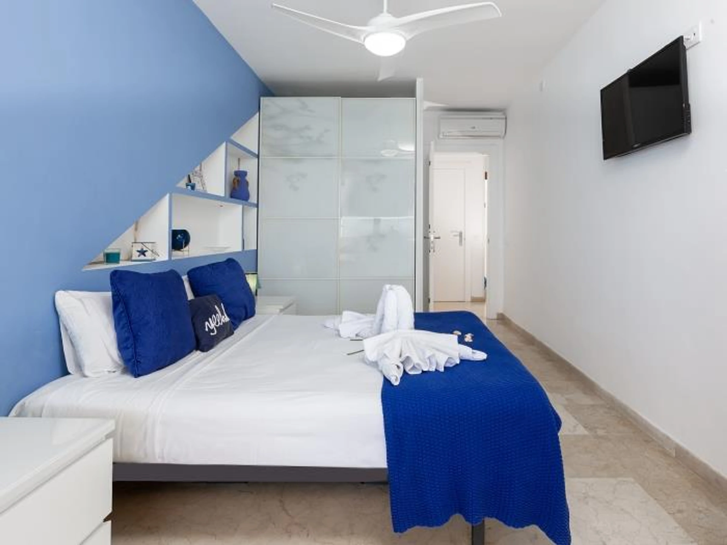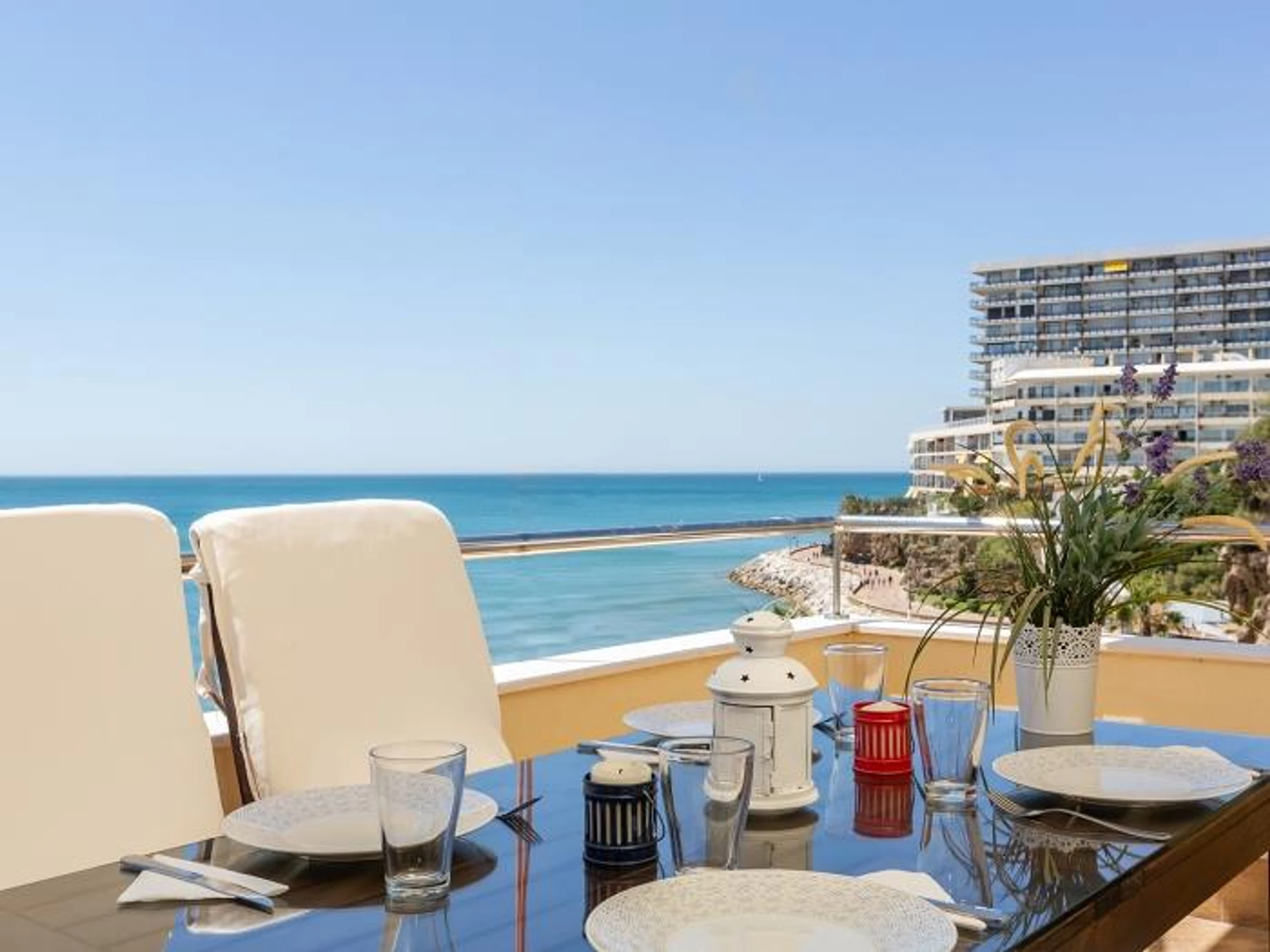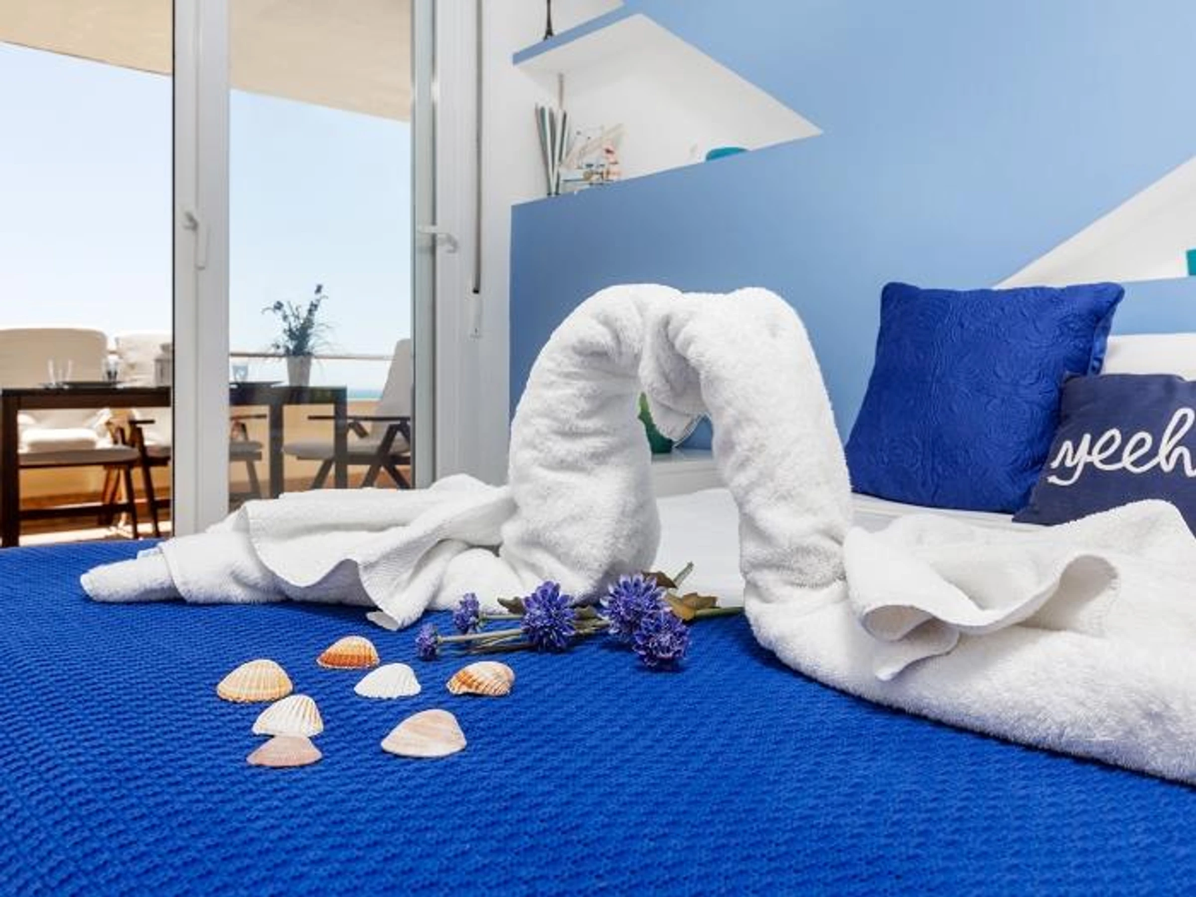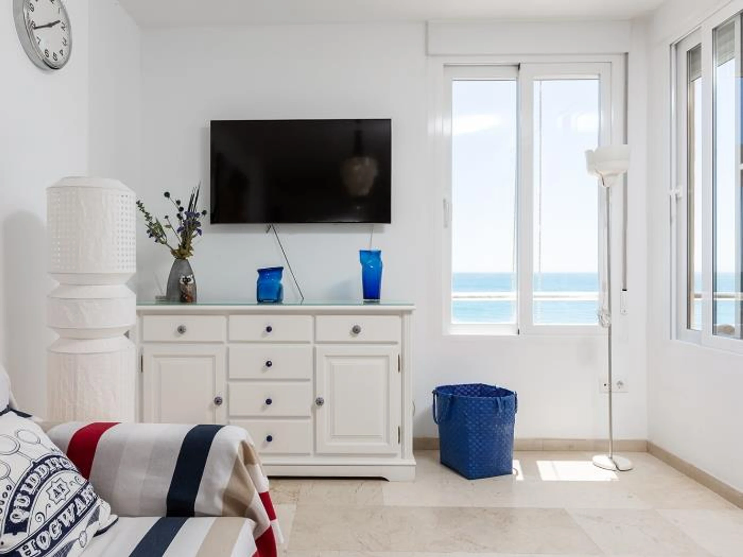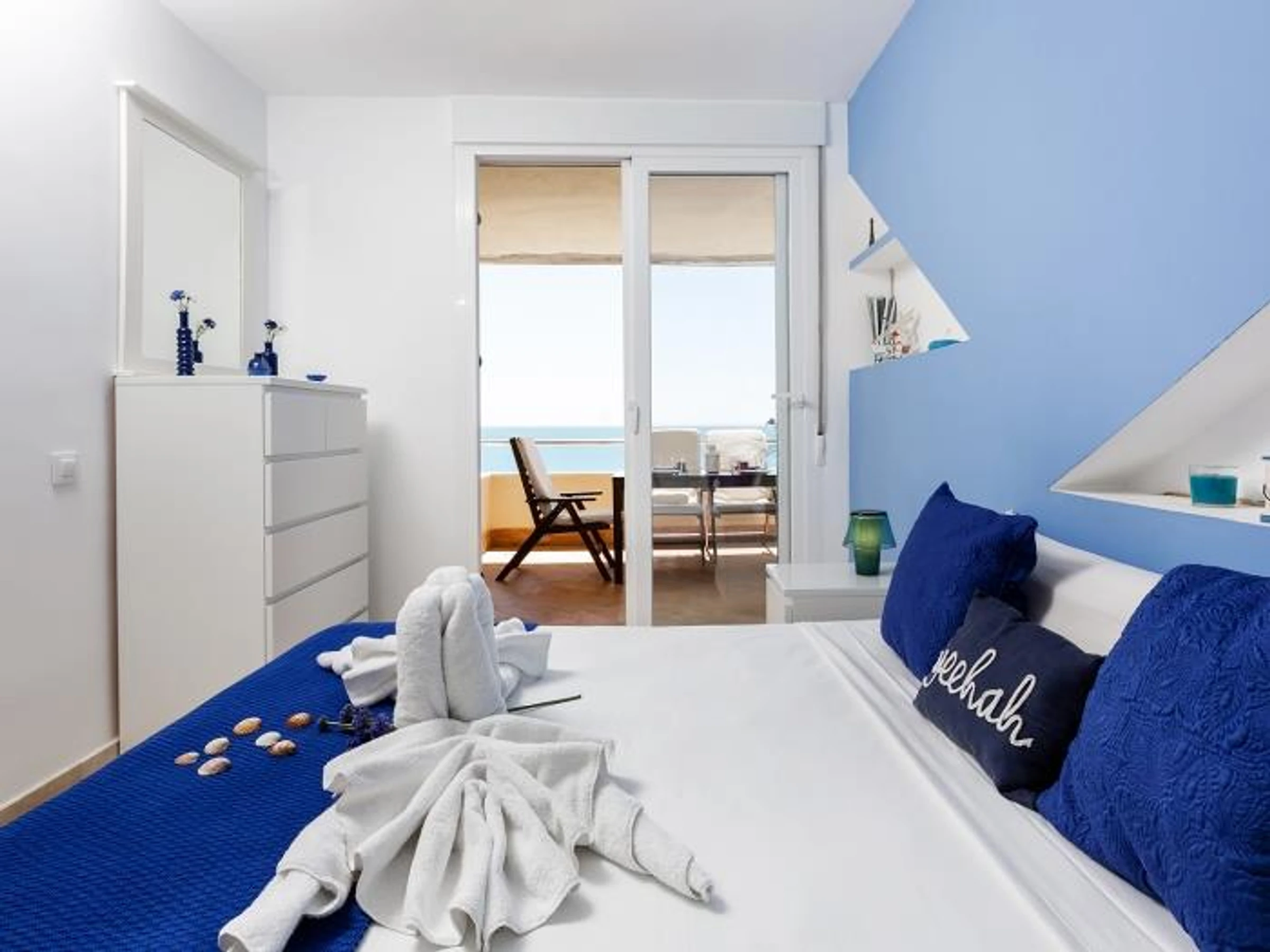 Dispone de un amplio dormitorio con cama de matrimonio, armarios empotrados y acceso directo a la impresionante terraza. Podrás escuchar el sonido del mar desde la cama.