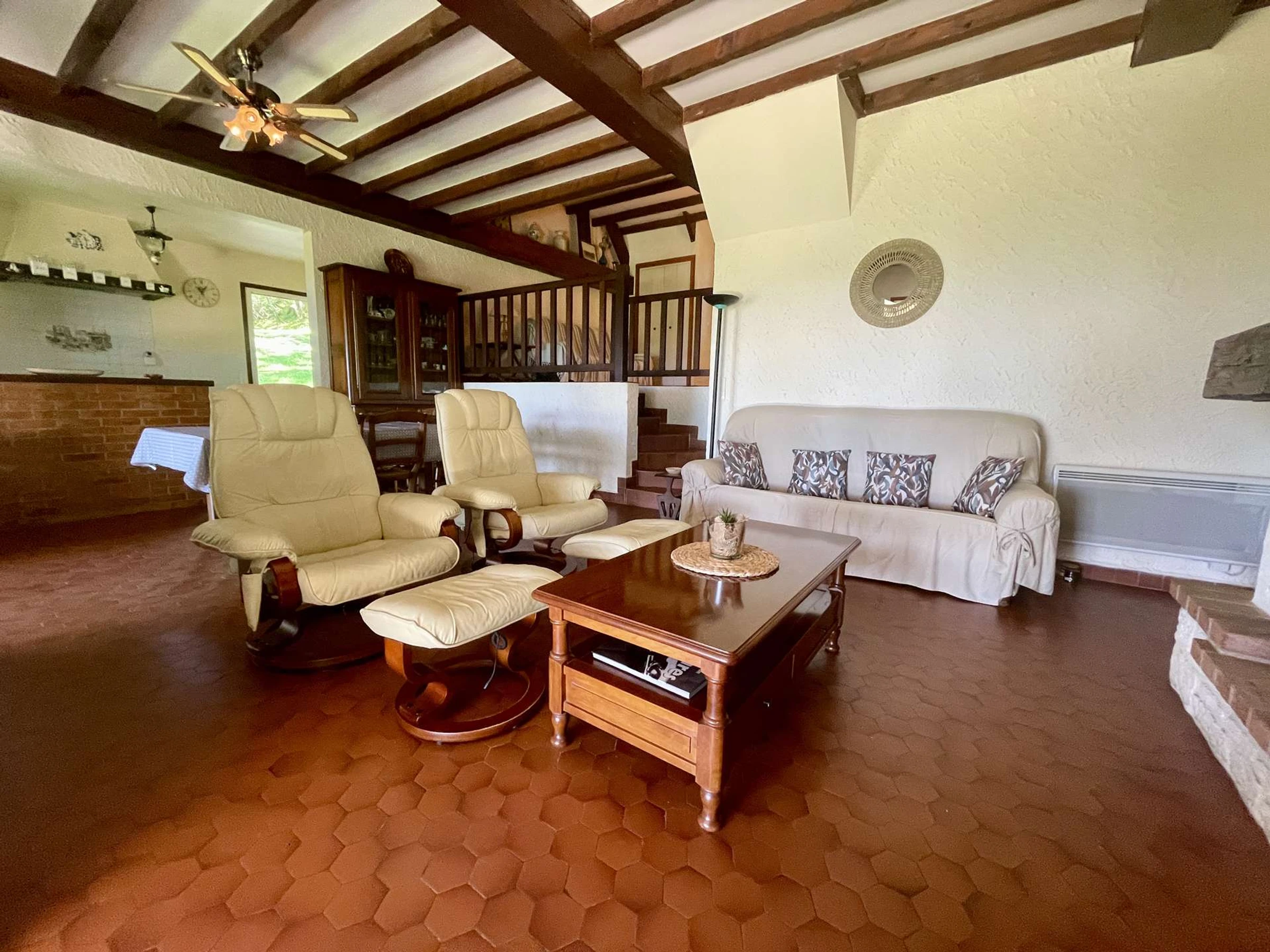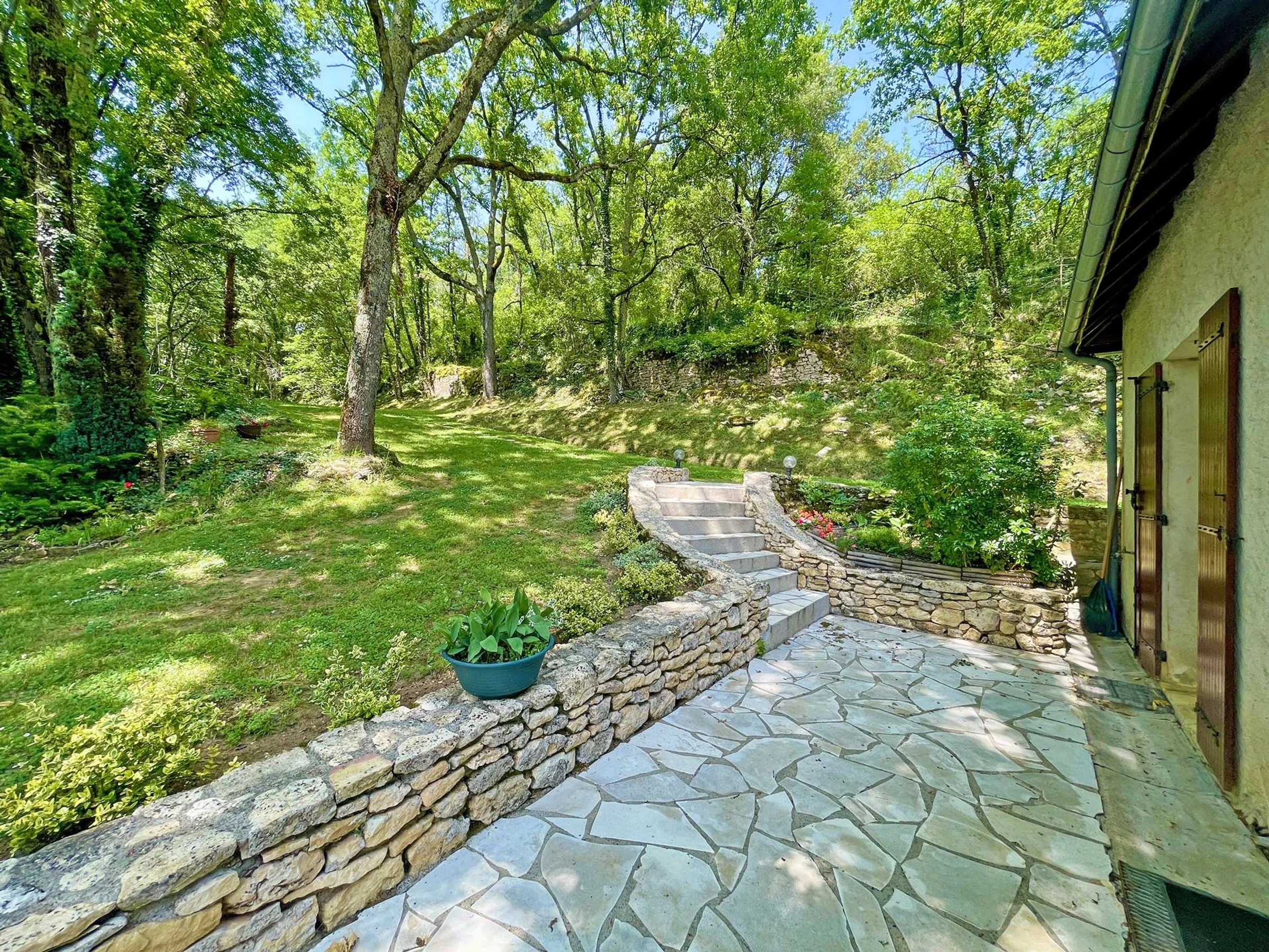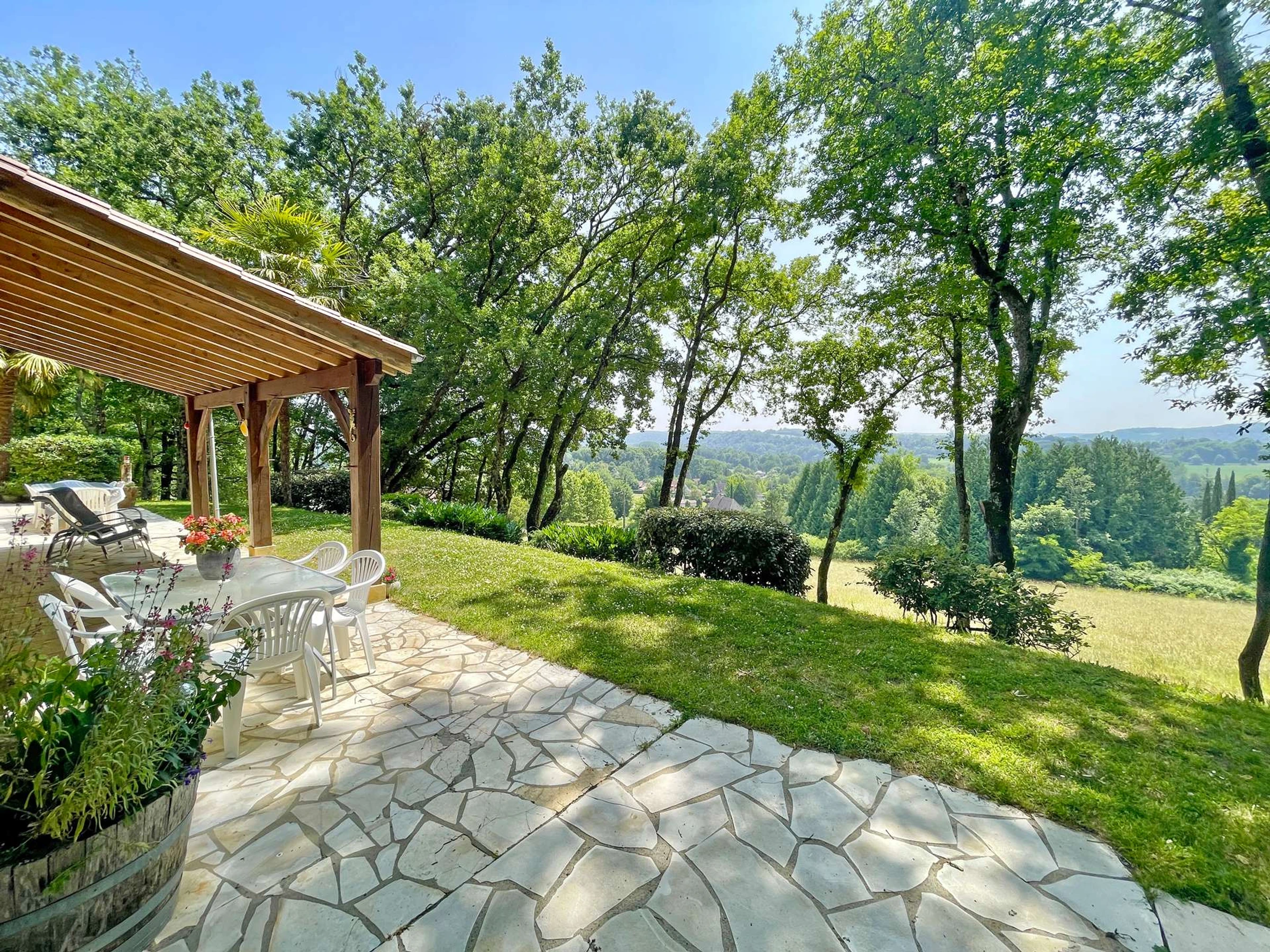 Al entrar en la casa, se accede a la cocina, que se abre al salón con una segunda zona de estar en el entresuelo. Unas puertas francesas dan a la terraza cubierta, con vistas al valle del Dordoña.
