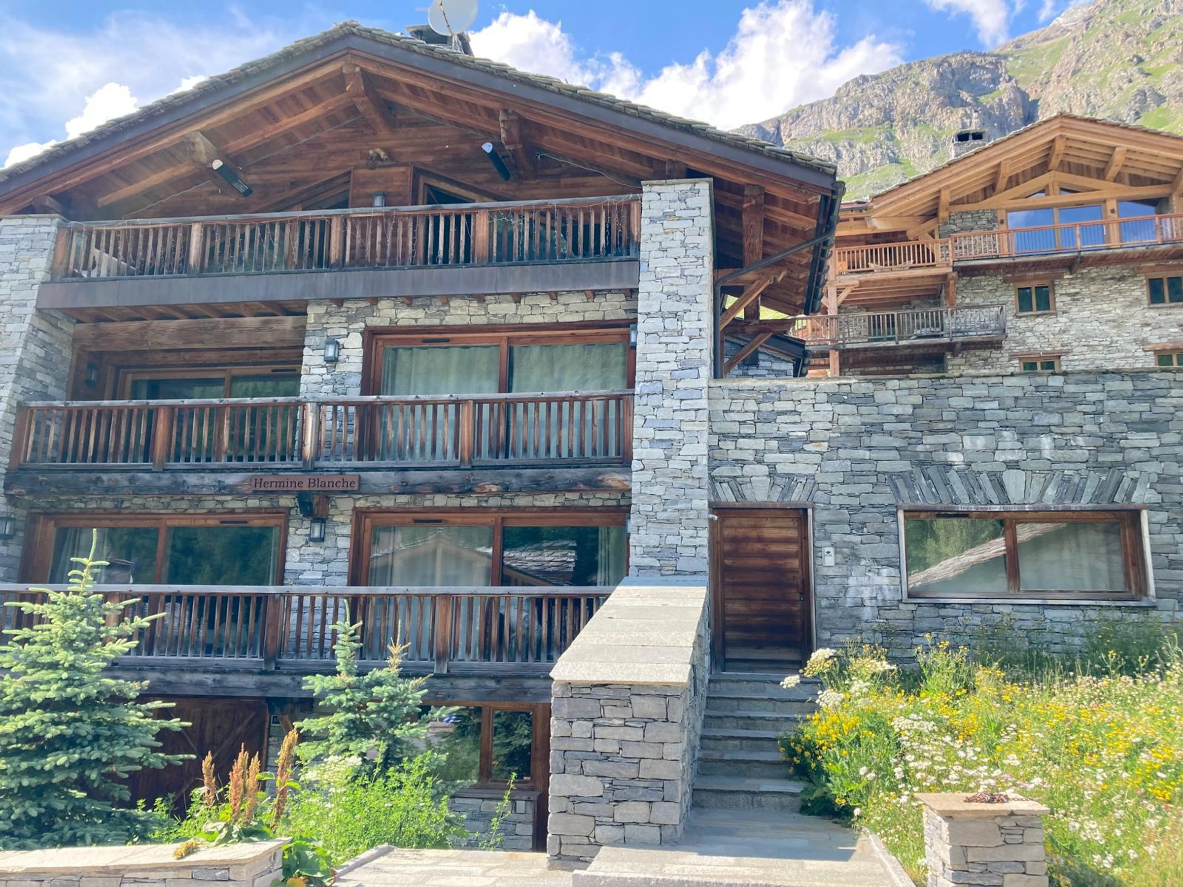 Chalet HERMINE BLANCHE de unos 412 m² con orientación sur, situado en la zona de Fornet, en Val d'Isère, a 100 m de los remontes. Tiene capacidad para 14 personas (8 adultos + 6 niños).
