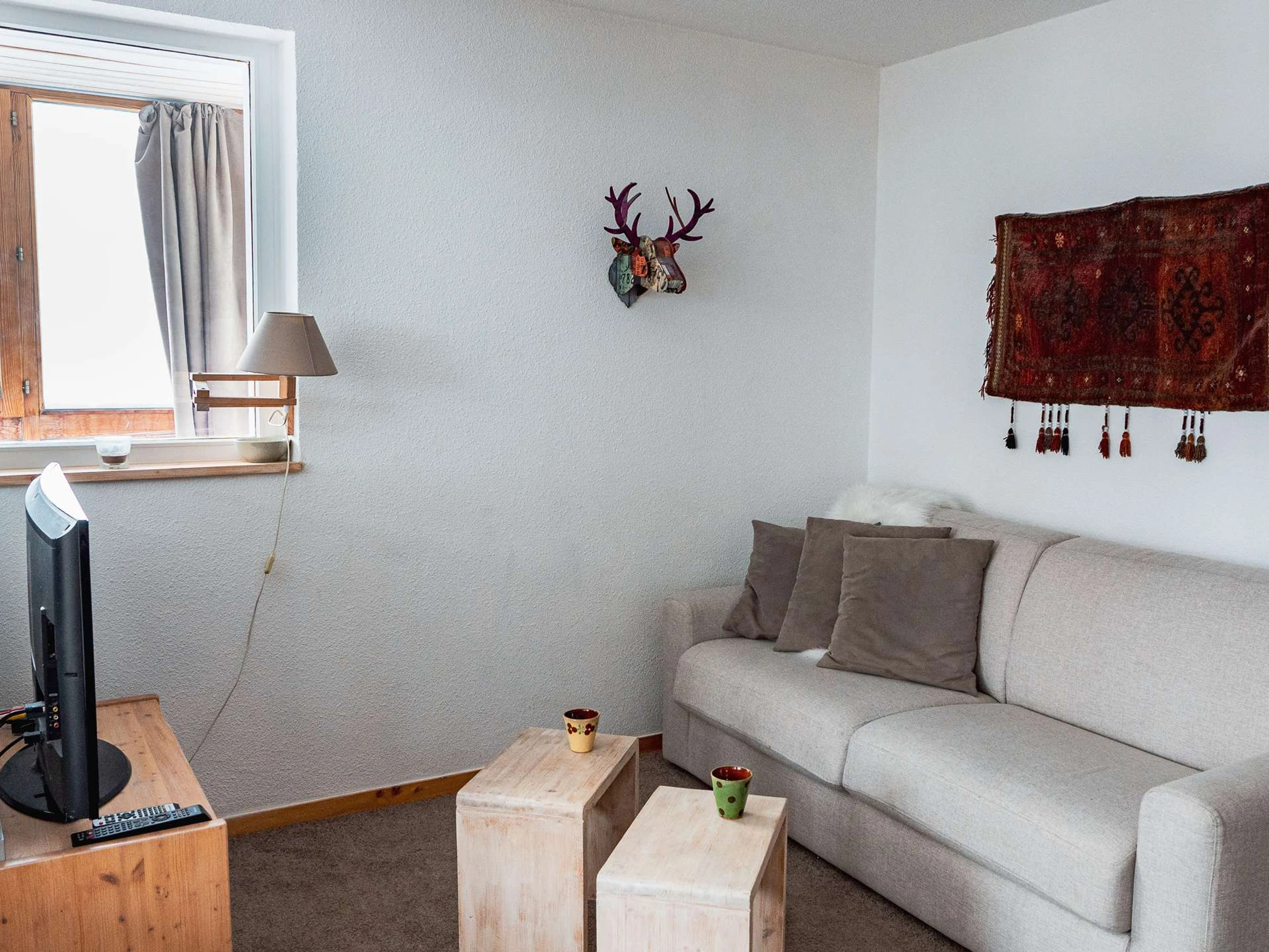 - Salón con sofá cama doble (con edredones y almohadas), televisión y zona de comedor con mirador con vistas a las pistas.