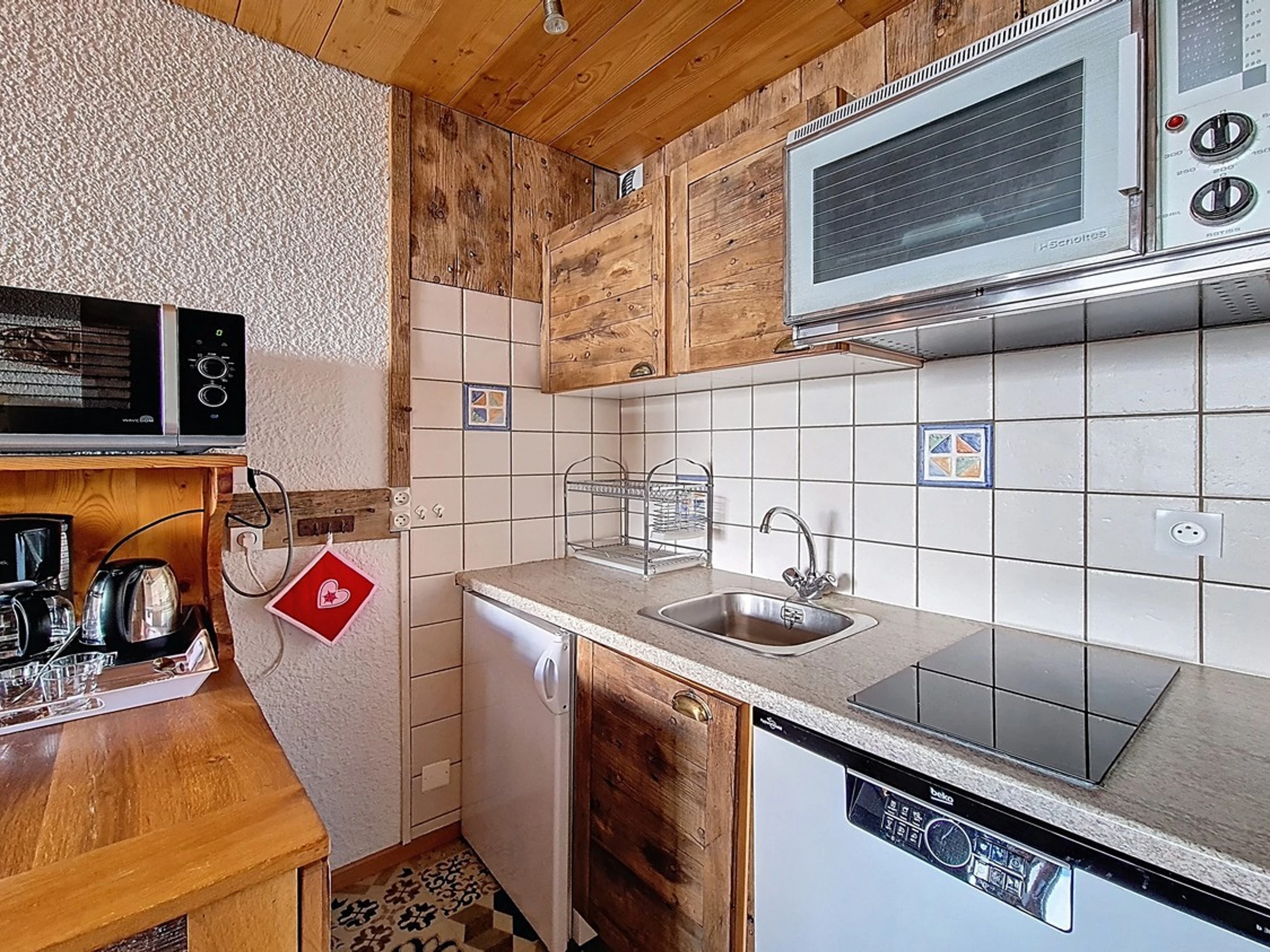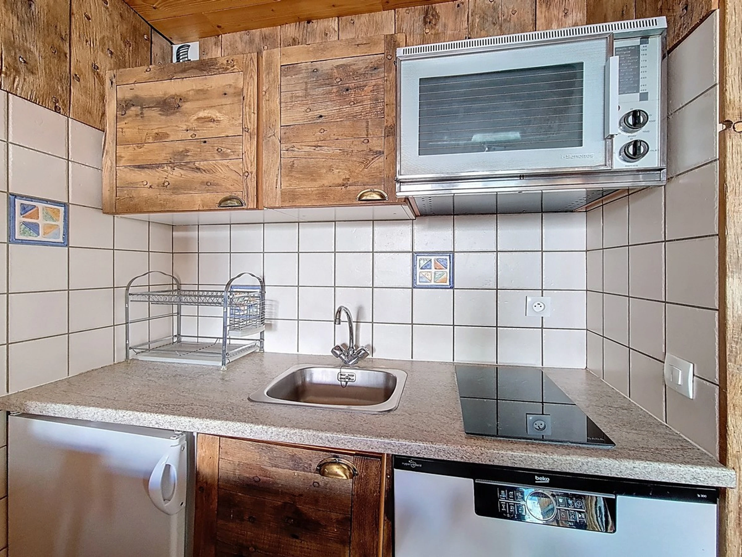 Cocina americana: totalmente equipada con 4 placas de cocina, microondas con función grill, nevera, cafetera, hervidor de agua, tostadora, etc.
