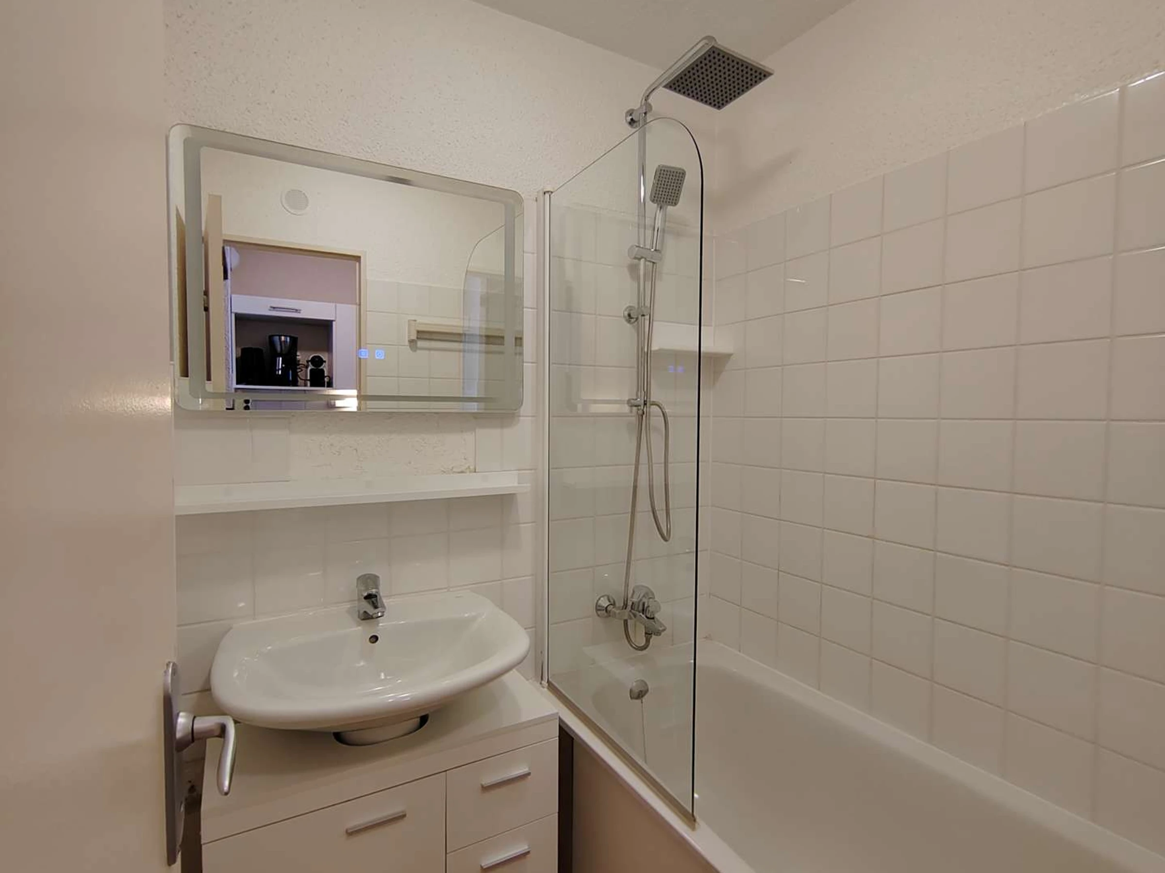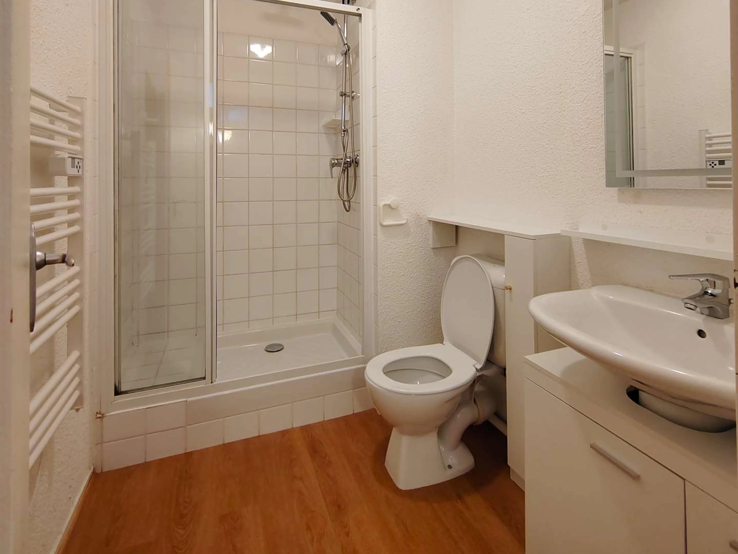 - Un baño con ducha, mueble de lavabo e inodoro.