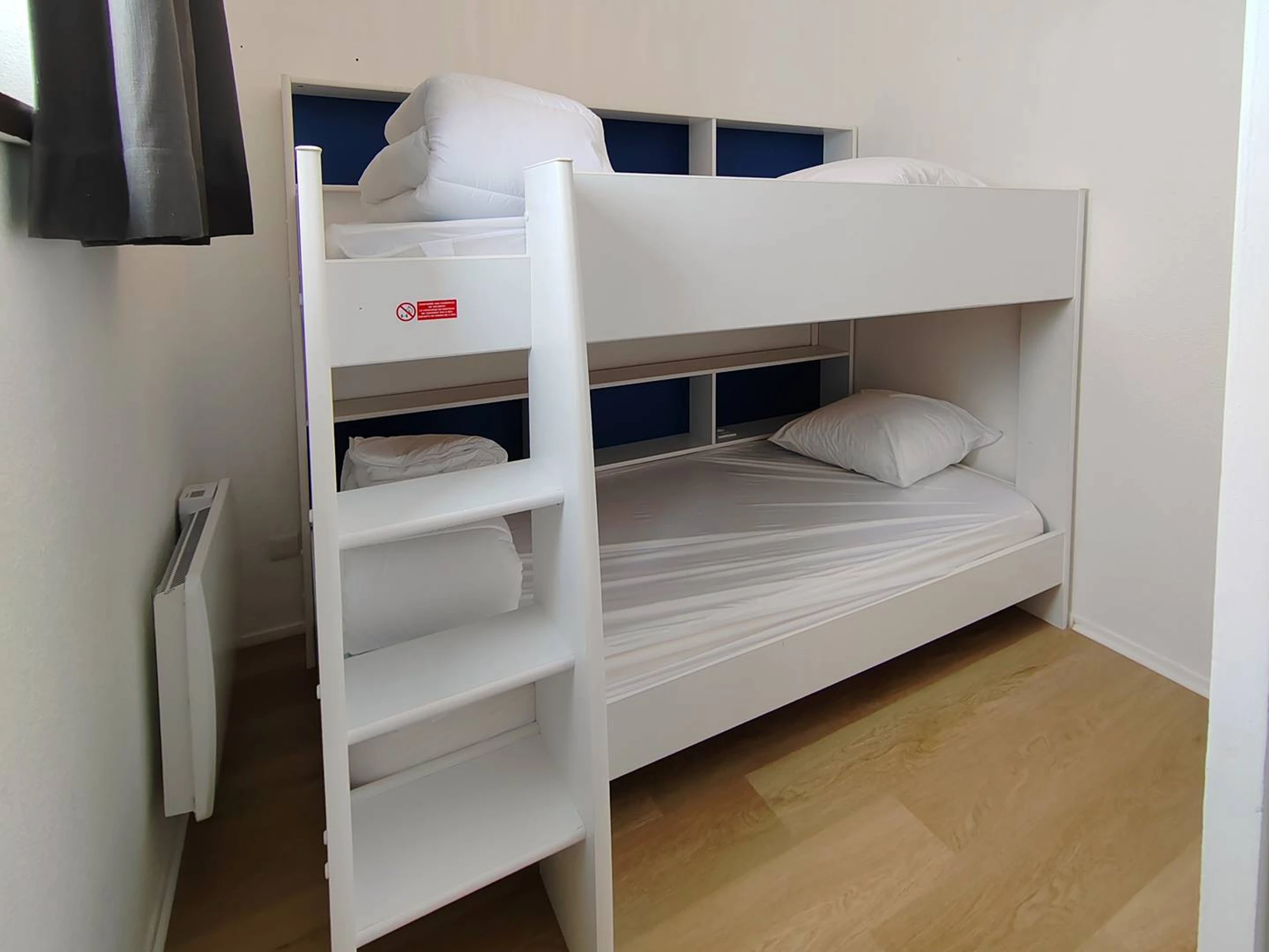 - Zona de dormitorio con litera de 90 x 190 cm, puertos USB y USB estándar, y un amplio armario empotrado.