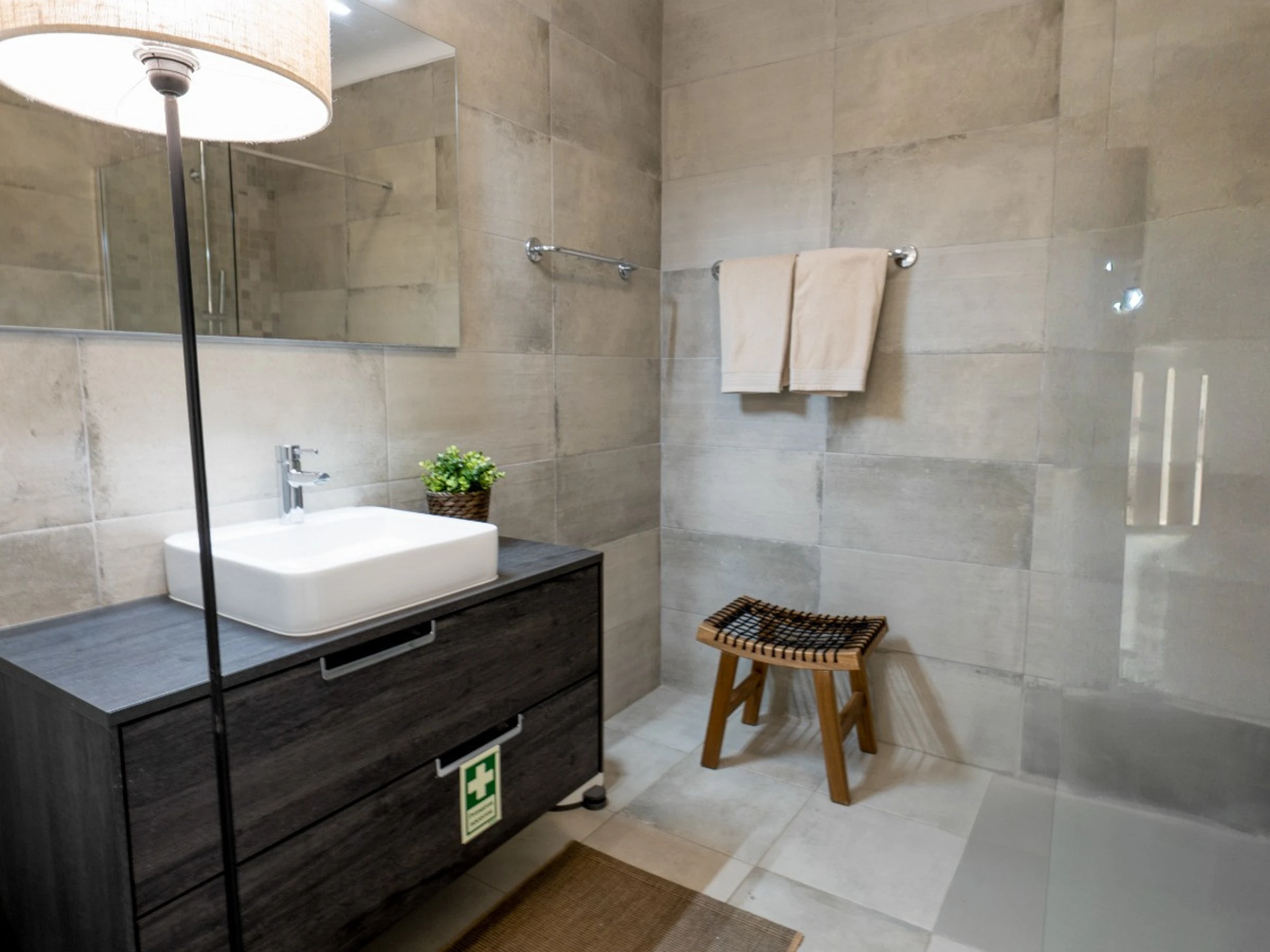 La cocina en espacio abierto está totalmente equipada, lista para preparar desde desayunos tranquilos hasta cenas familiares. La sala de estar invita al relajamiento, con sofá, televisión por cable, internet y aire acondicionado para garantizar comodidad en cualquier estación. El cuarto de baño moderno cuenta con una práctica cabina de ducha.