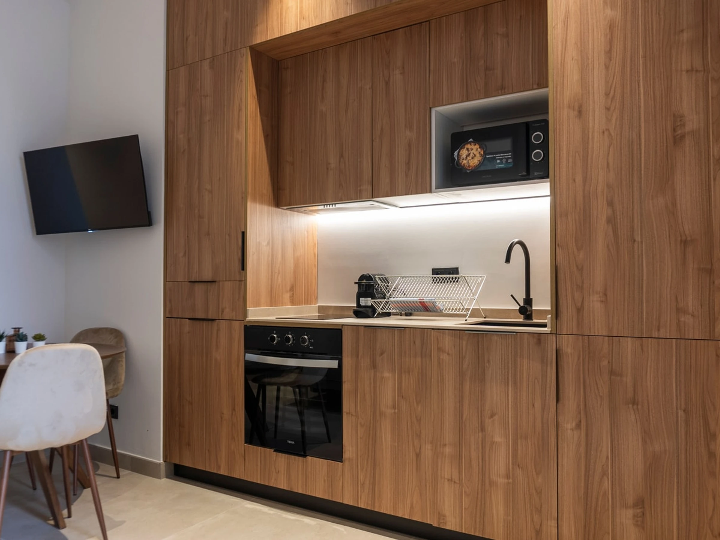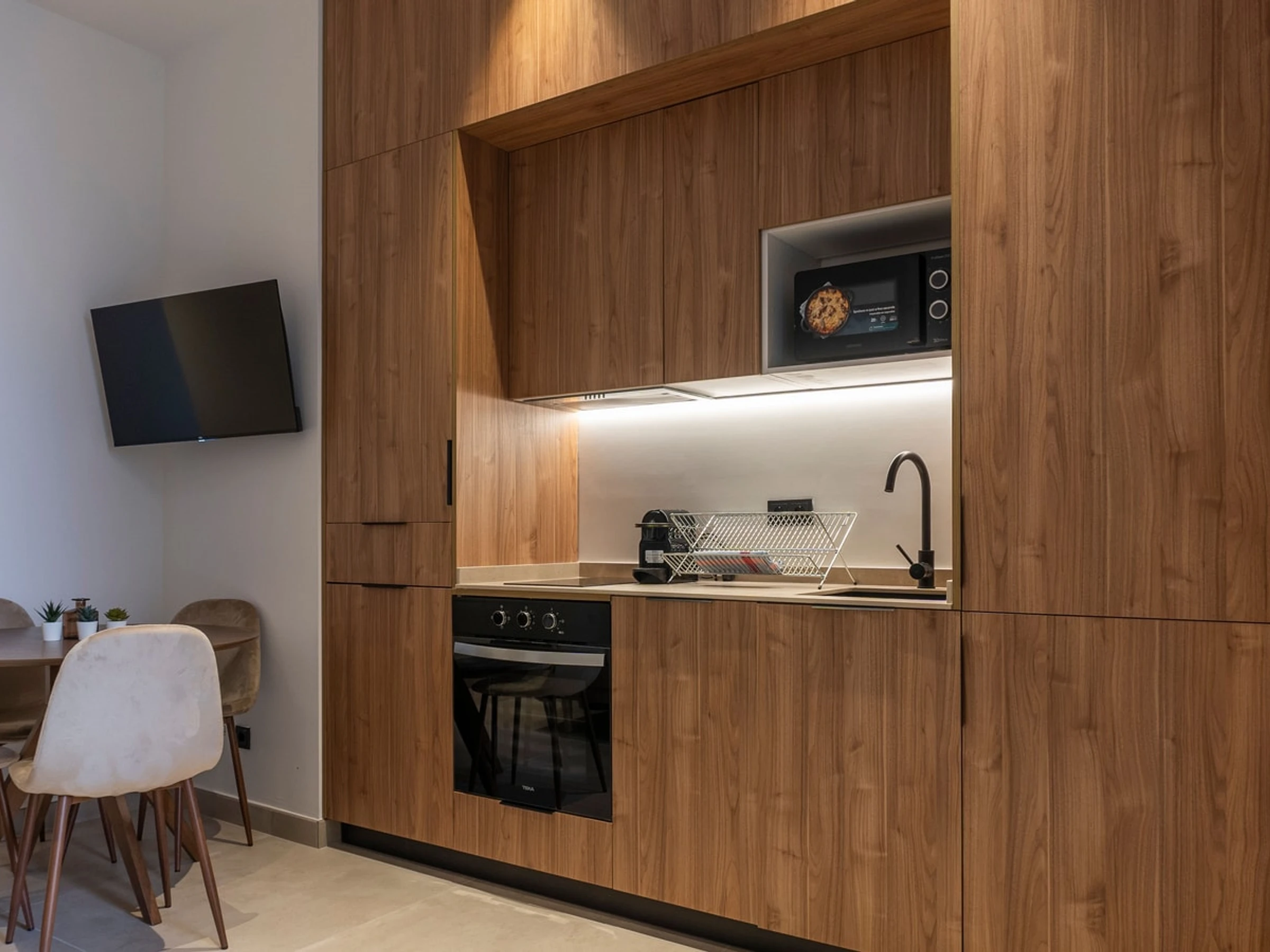 La cocina está completamente equipada con todos los electrodomésticos que puedas necesitar, incluyendo una cafetera Nespresso para disfrutar de tus mañanas con un delicioso café, un microondas para calentar tus comidas rápidamente y una tetera eléctrica para preparar tu infusión favorita en cualquier momento del día.
