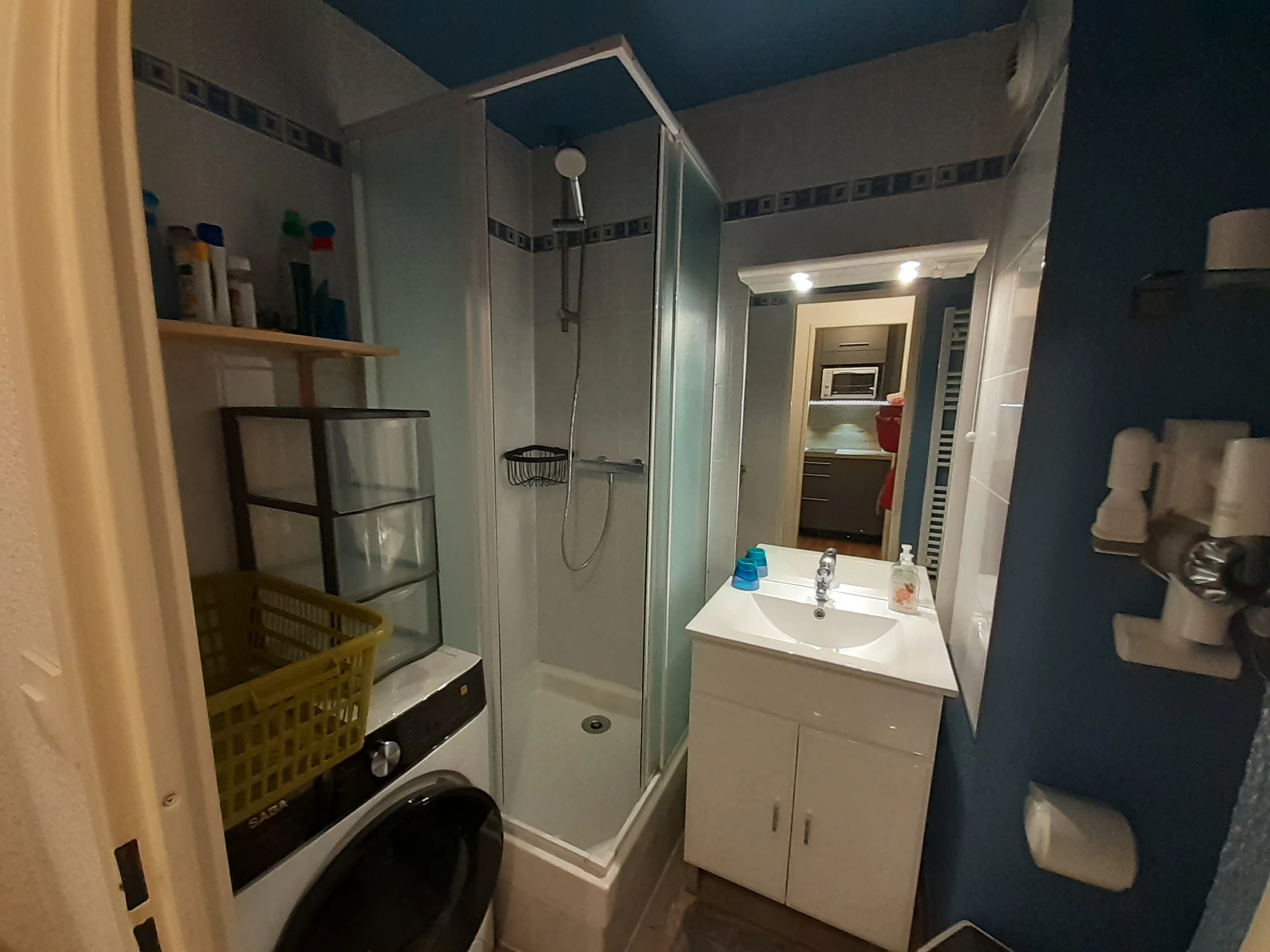 - Baño con ducha, lavabo, secador de pelo, lavadora e inodoro